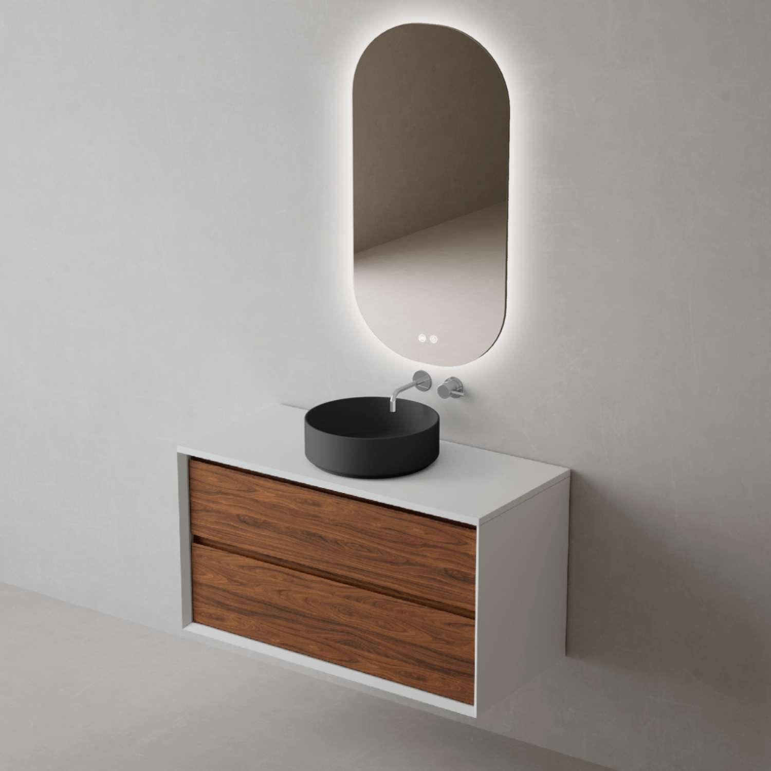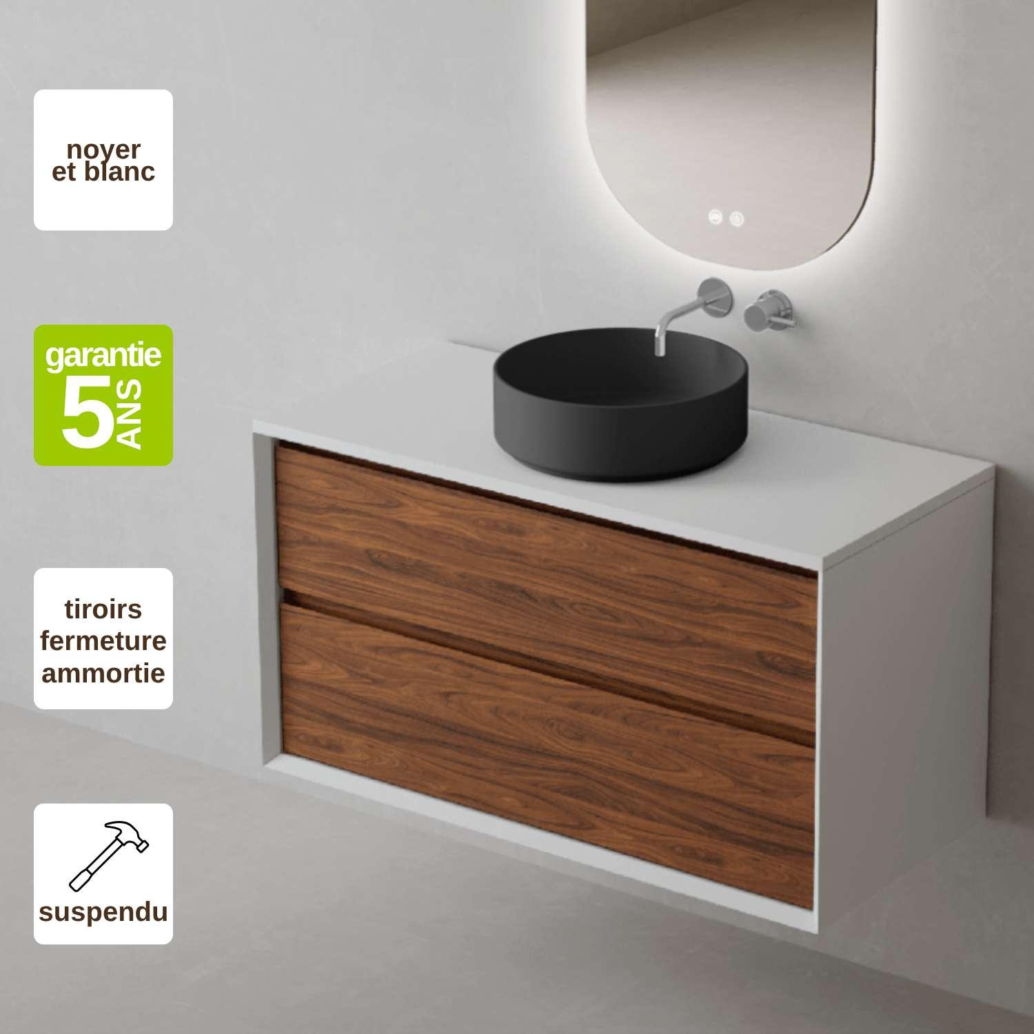Meuble Salle de Bain COOL (81 cm x H54 x P45 cm), Plan Vasque Marin ROLL NM, 2 Tiroirs, Laqué Blanc Mat/Noyer