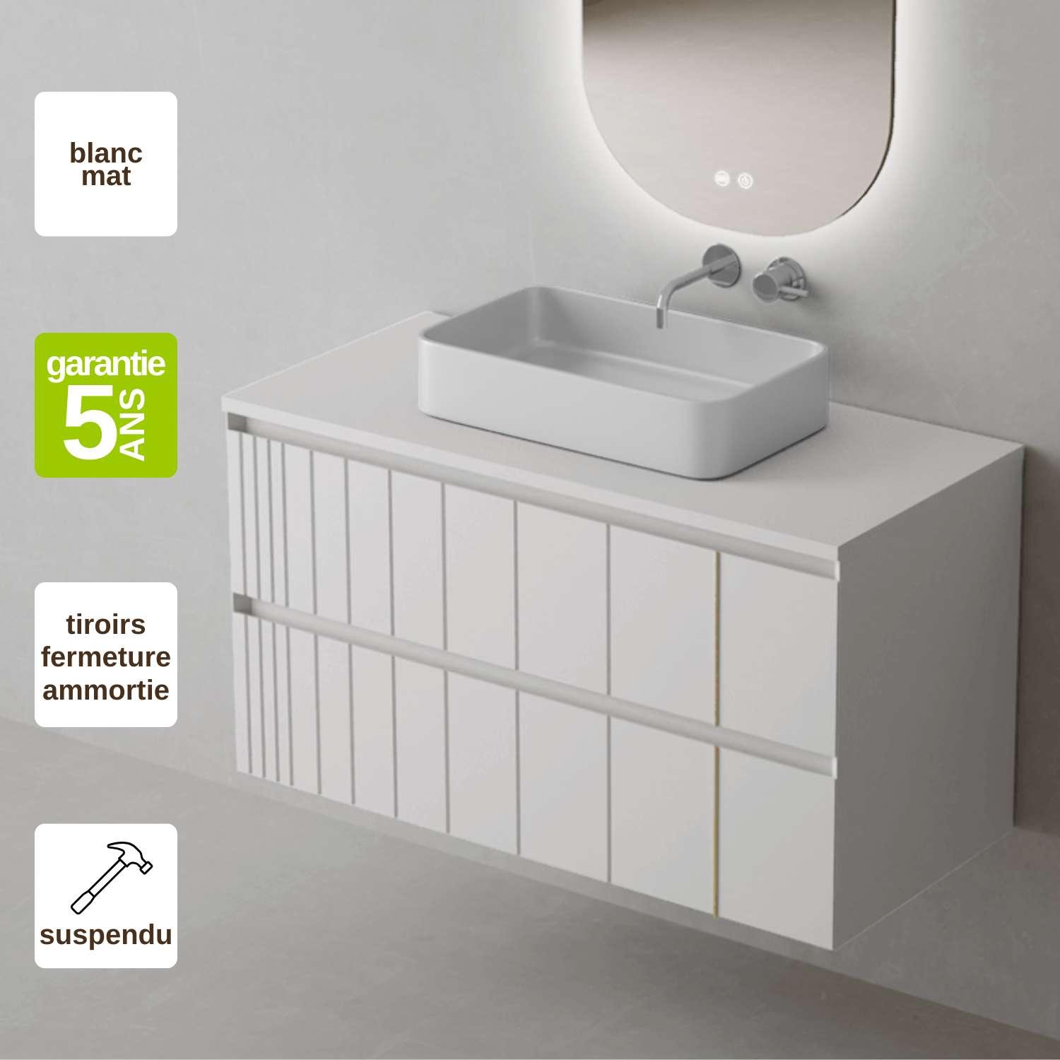 Meuble Salle de Bain POLE (101 cm x H54 x P45 cm), Plan Vasque Marin TAN WB, 2 Tiroirs, Laqué Blanc Mat