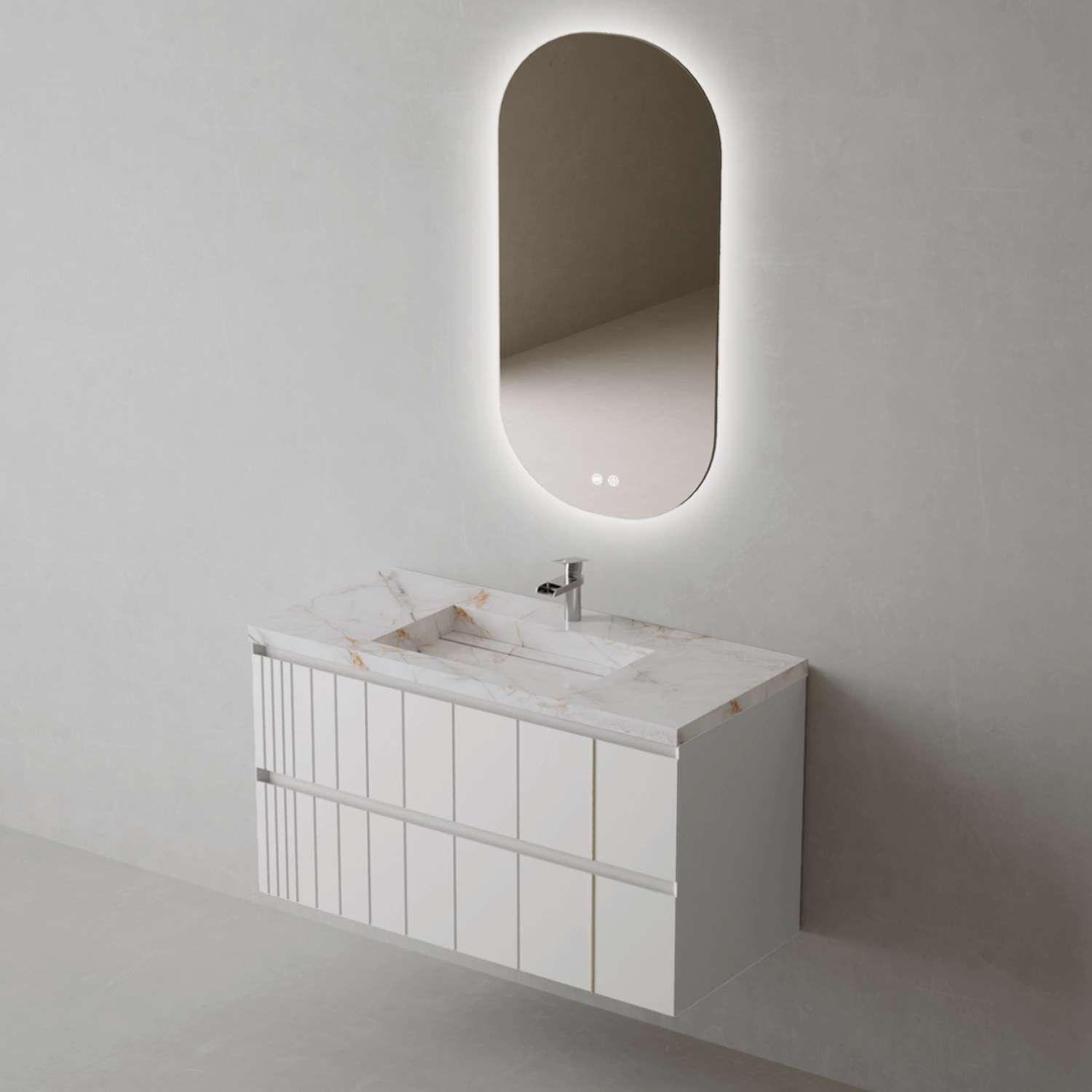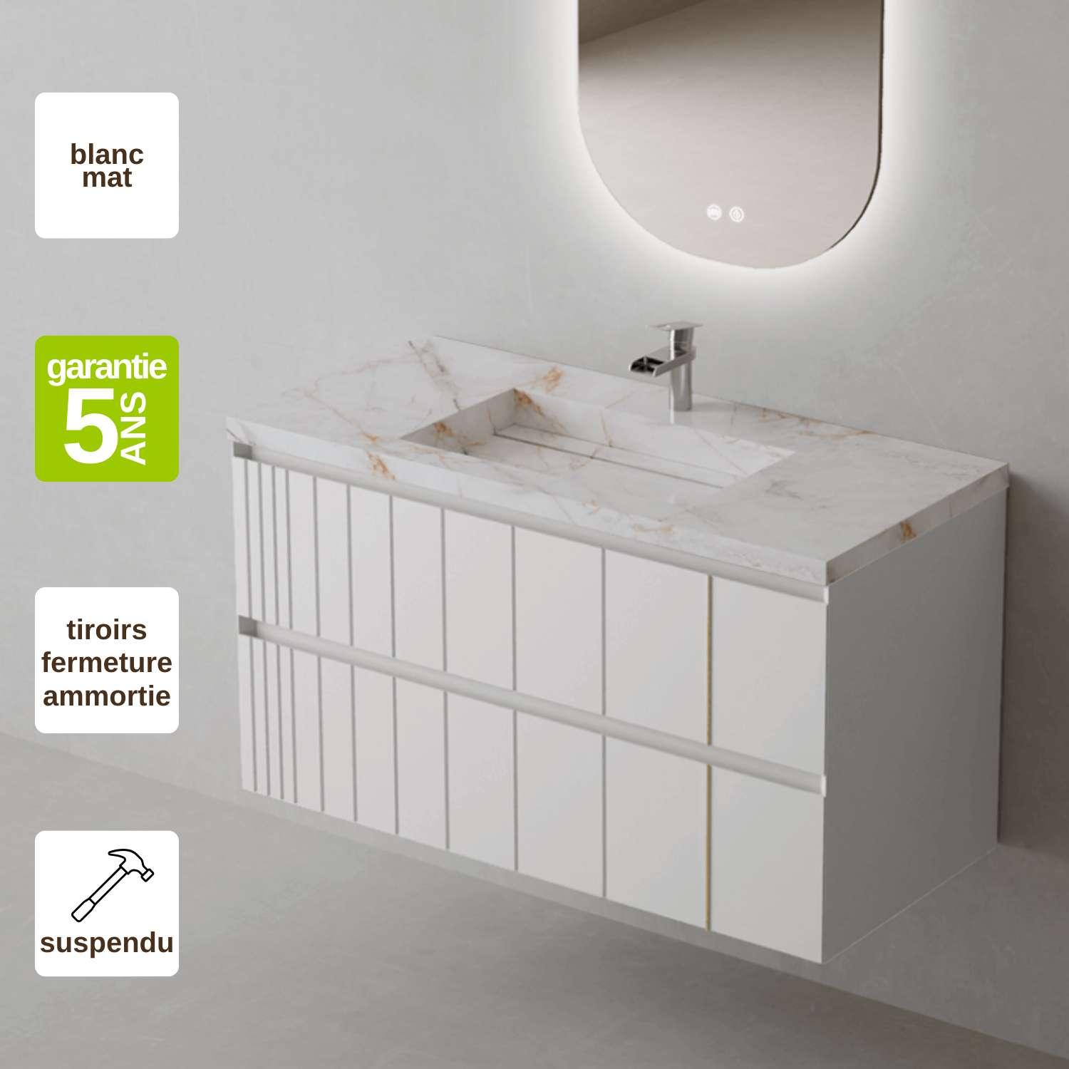 Meuble Salle de Bain POLE (61 cm x H54 x P45 cm), Plan Grès Cérame BS, 2 Tiroirs, Laqué Blanc Mat