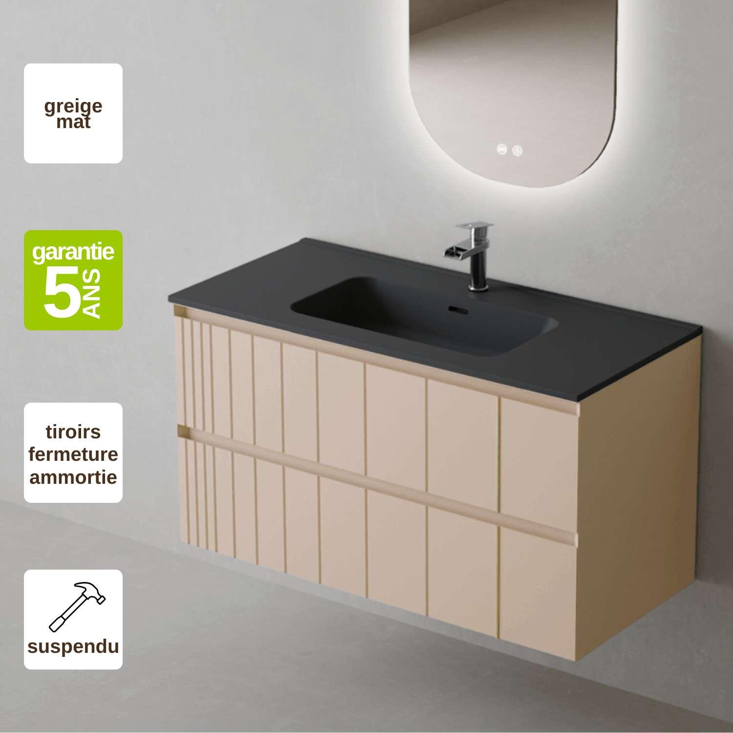 Meuble Salle de Bain POLE (61 cm x H54 x P45 cm), Plan Vasque Céramique NM, 2 Tiroirs, Laqué Greige Mat