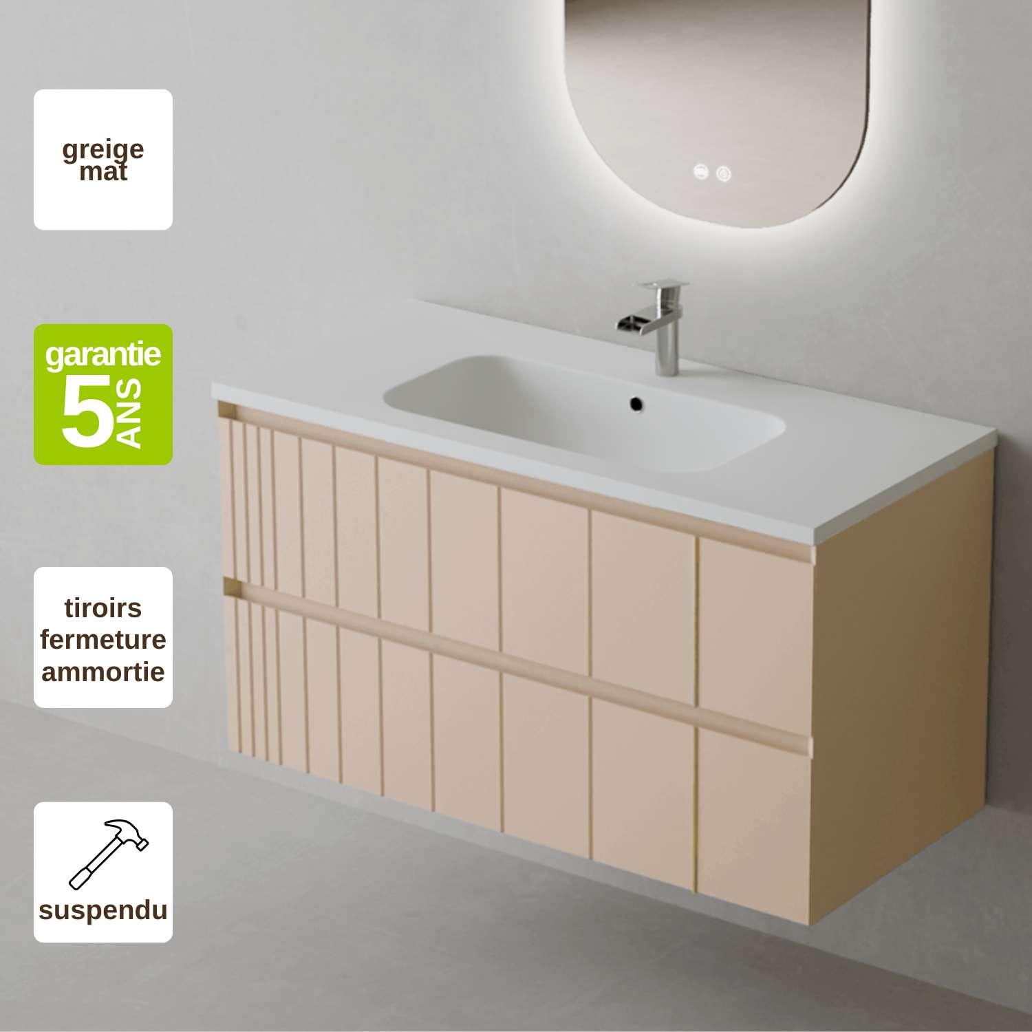 Meuble Salle de Bain POLE (61 cm x H54 x P45 cm), Plan Vasque Solide Surface MB, 2 Tiroirs, Laqué Greige Mat