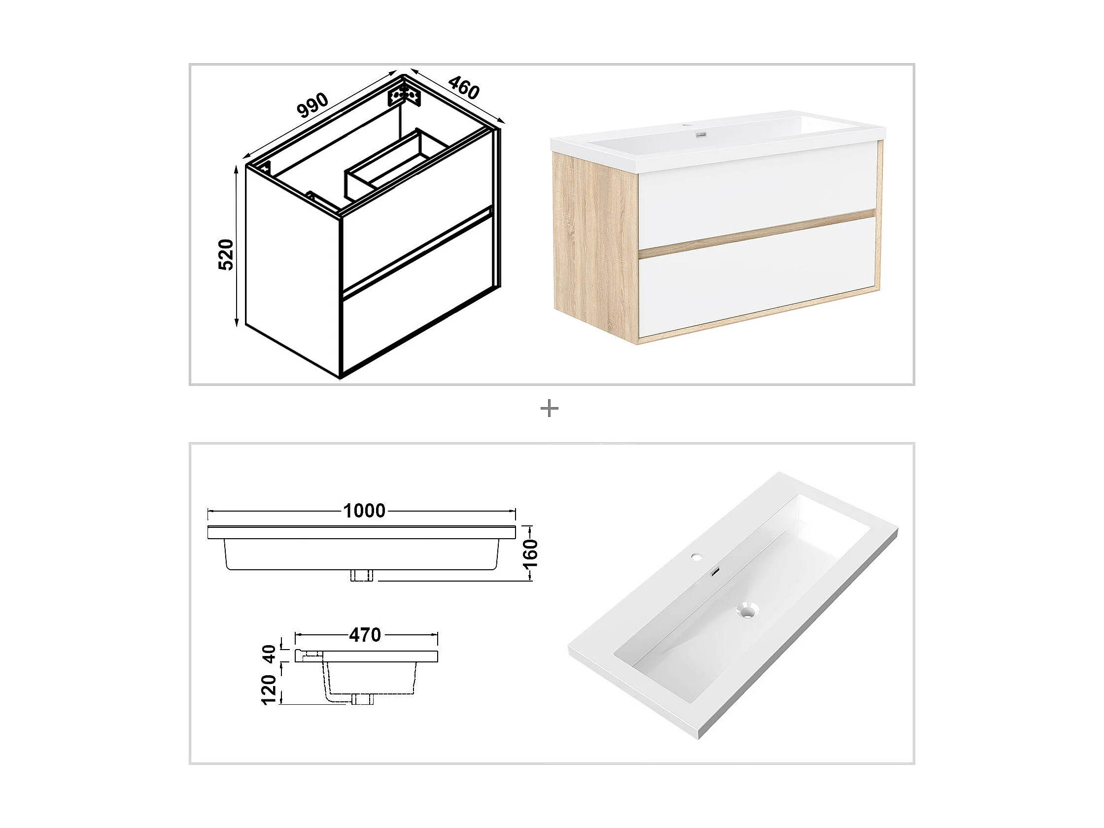 Meuble salle de bain suspendu 100 cm Blanc et Chêne, 2 tiroirs + vasque inclus