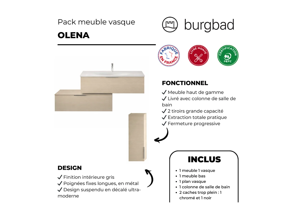 Meuble vasque 120 cm BURGBAD Olena en décaler chêne clair + colonne