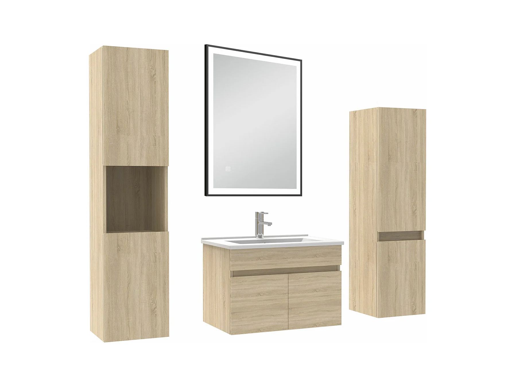 Meuble simple vasque chêne wotan 60cm avec colonne et miroir lumineux 3 couleurs et dimmable