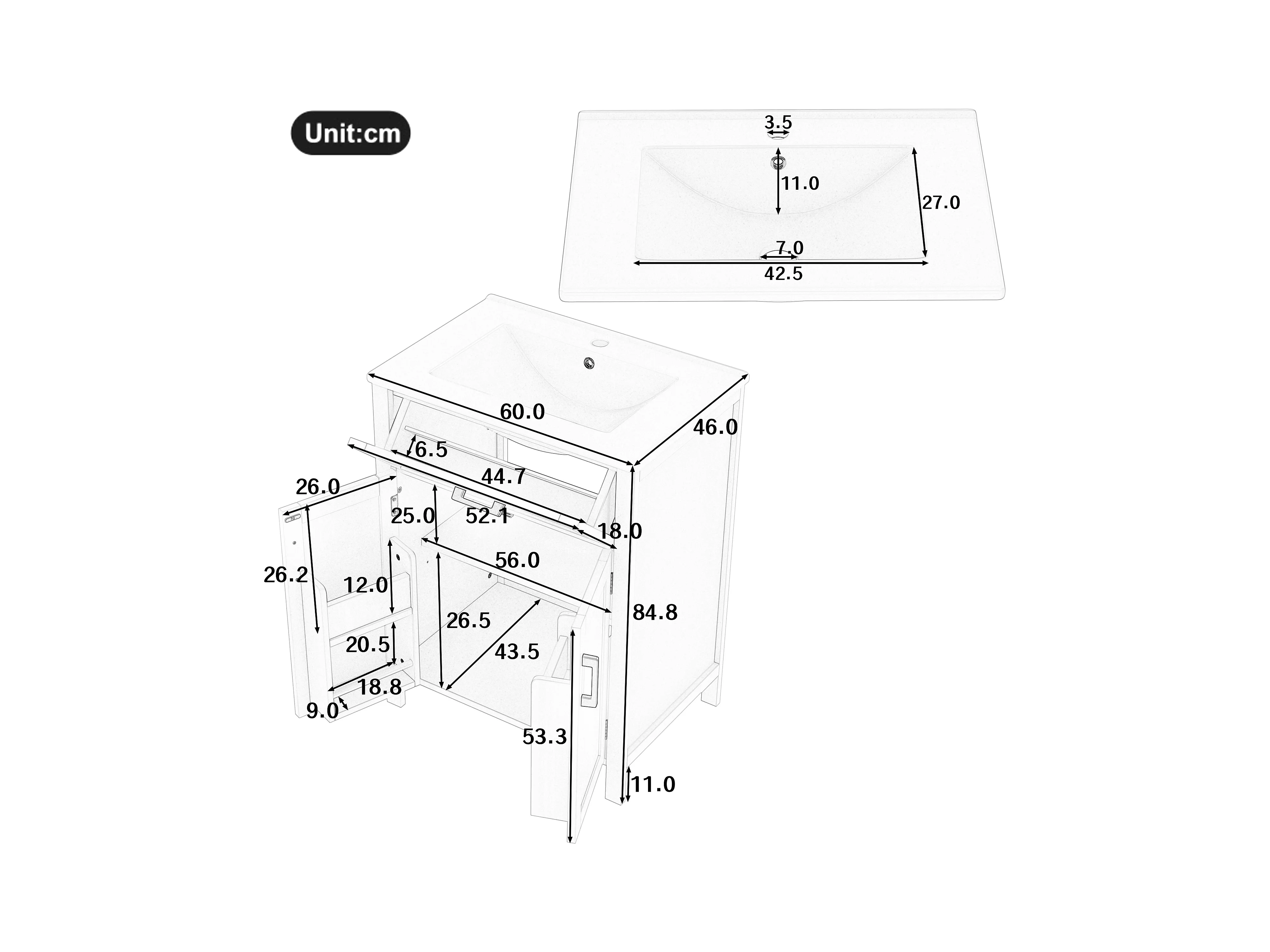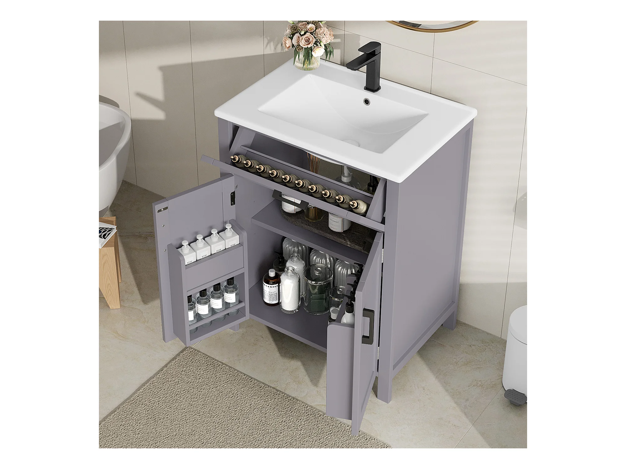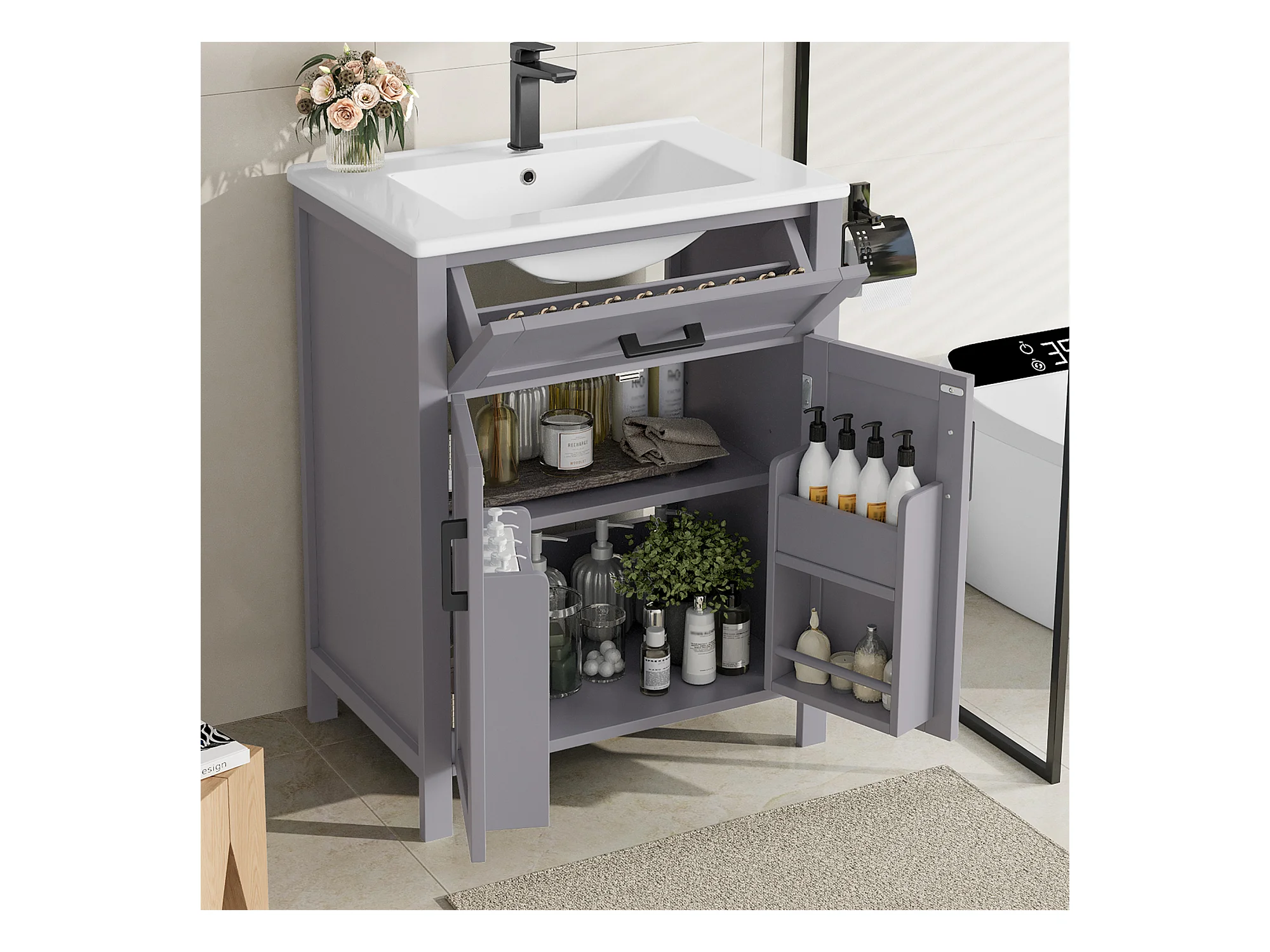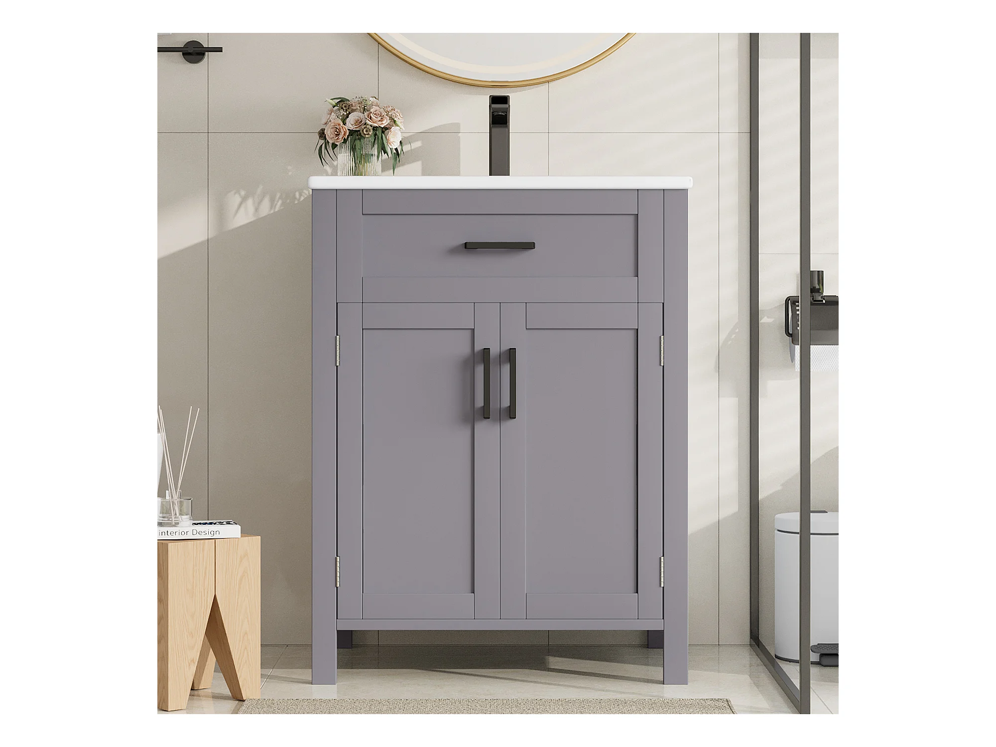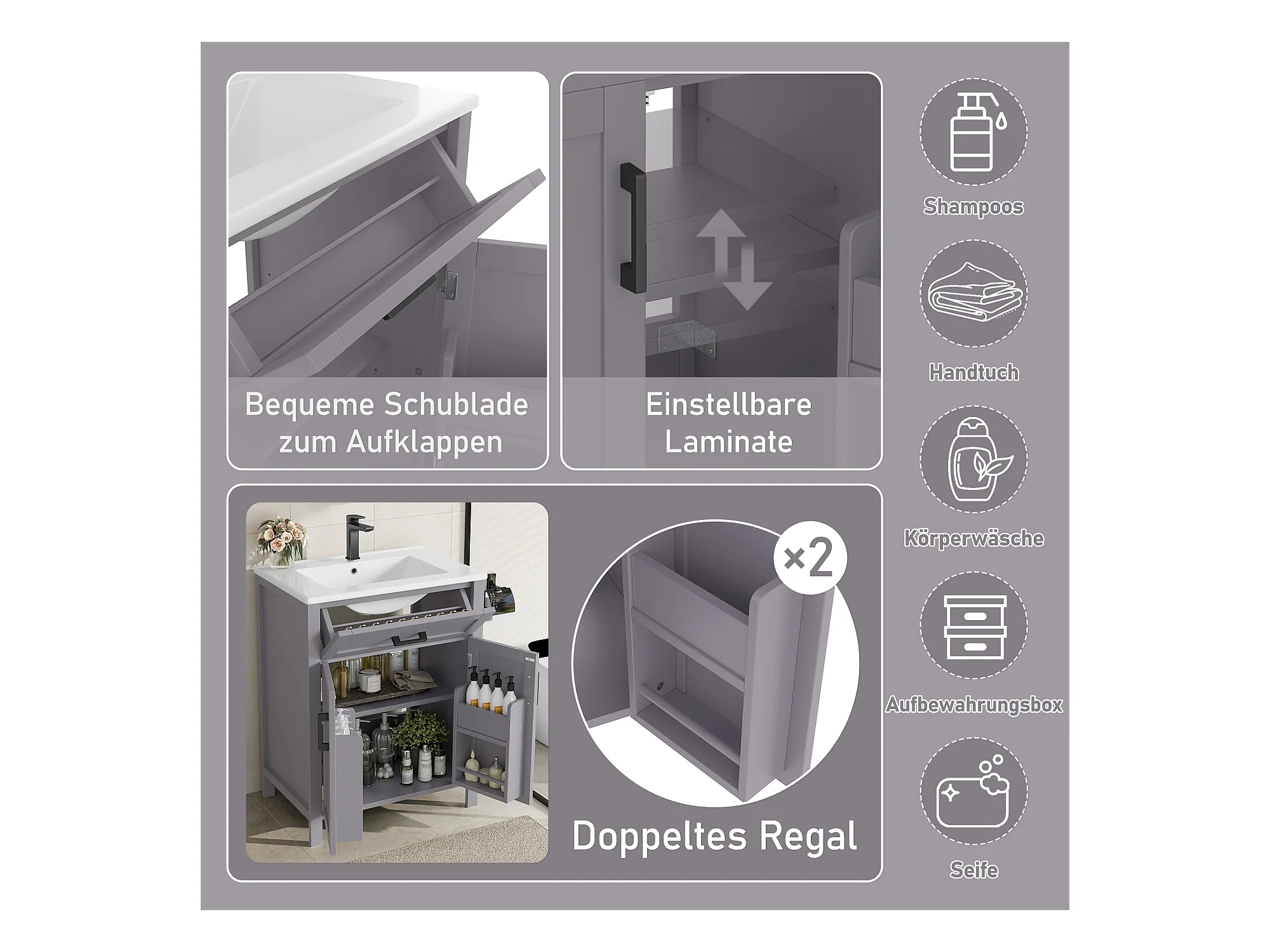 Meuble simple vasque posé au sol - 60 x 46 x 84 cm - avec vasque céramique - avec rangements - Céramique + MDF - gris (Robinet non inclus)