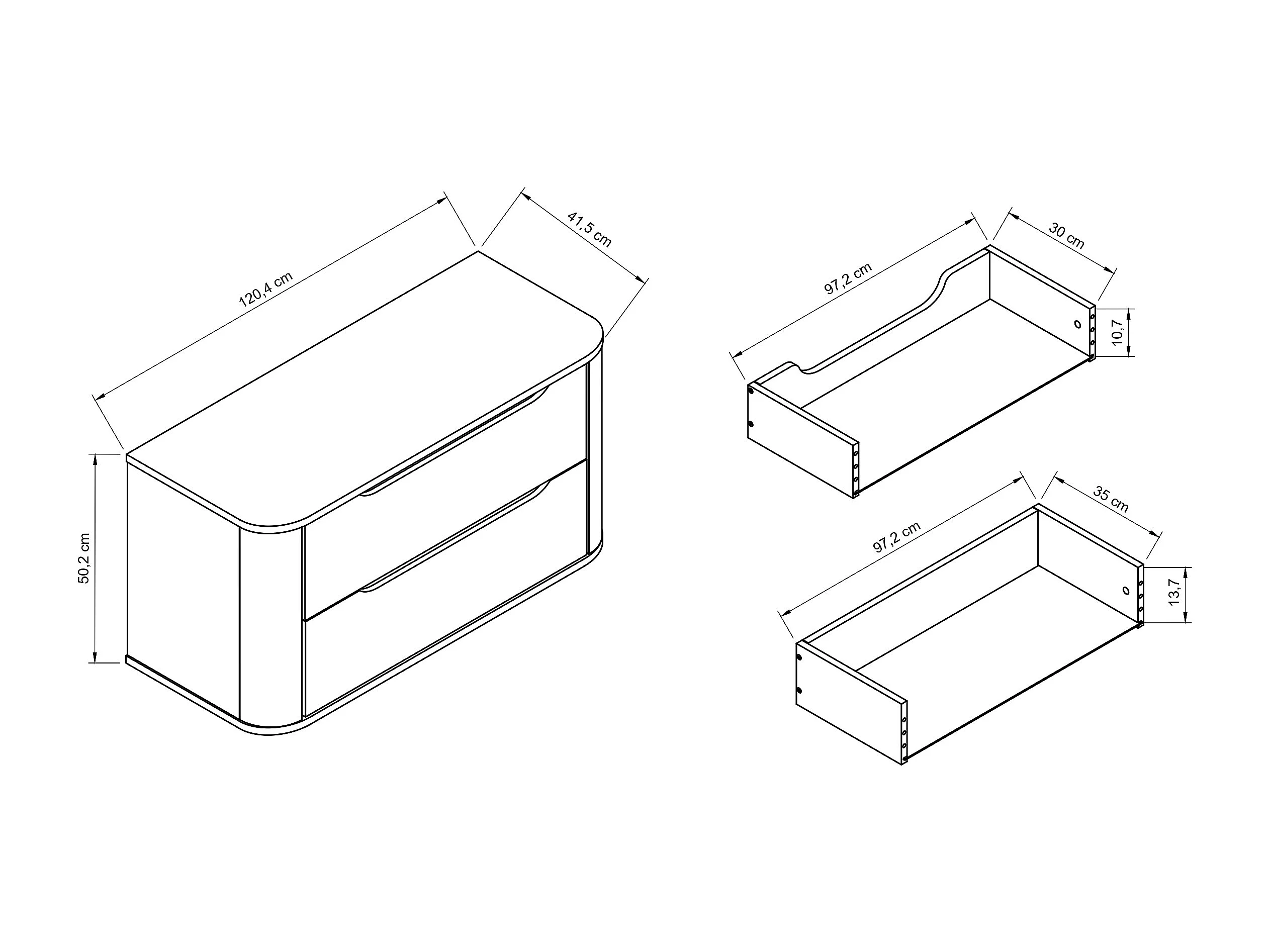 Meuble sous lavabo en cachemire avec plateau 120 cm, côtés arrondis et plateau