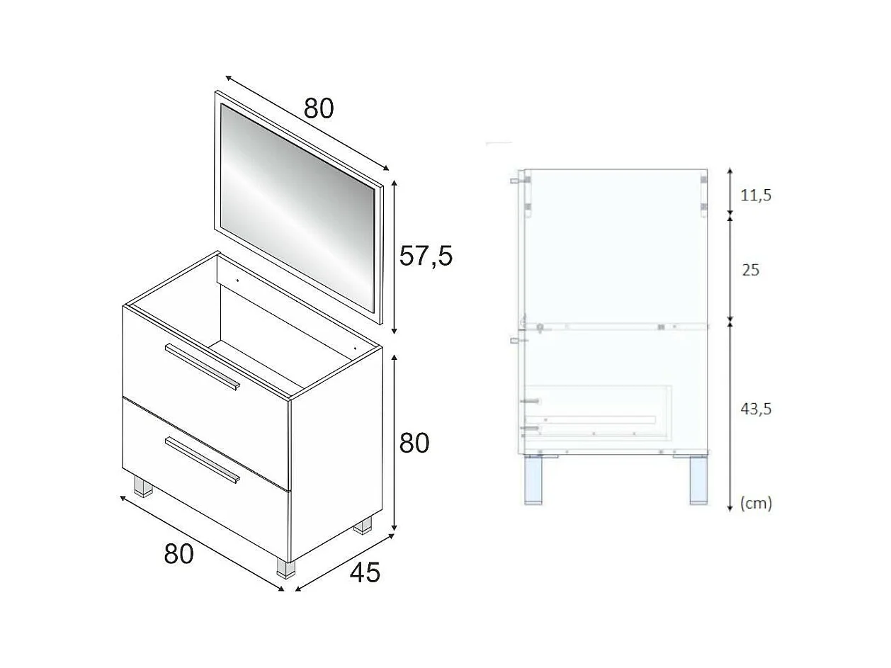 Meuble sous-vasque Dfarago, Meuble de salle de bain, Armoire avec 2 tiroirs et miroir, lavabo non inclus, 80x45h80 cm, Blanc brillant