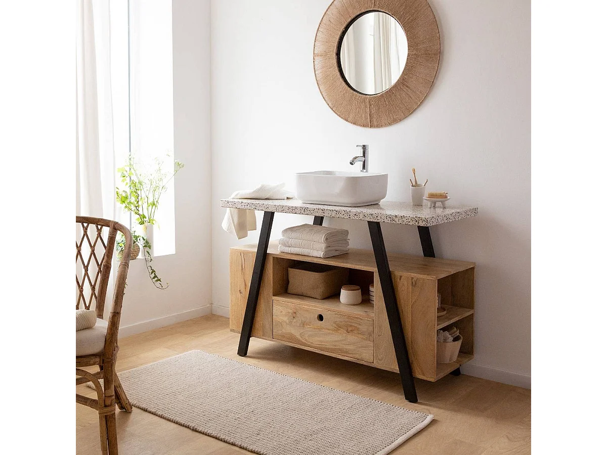 Meuble sous vasque en bois de manguier, métal et terrazzo Sandro