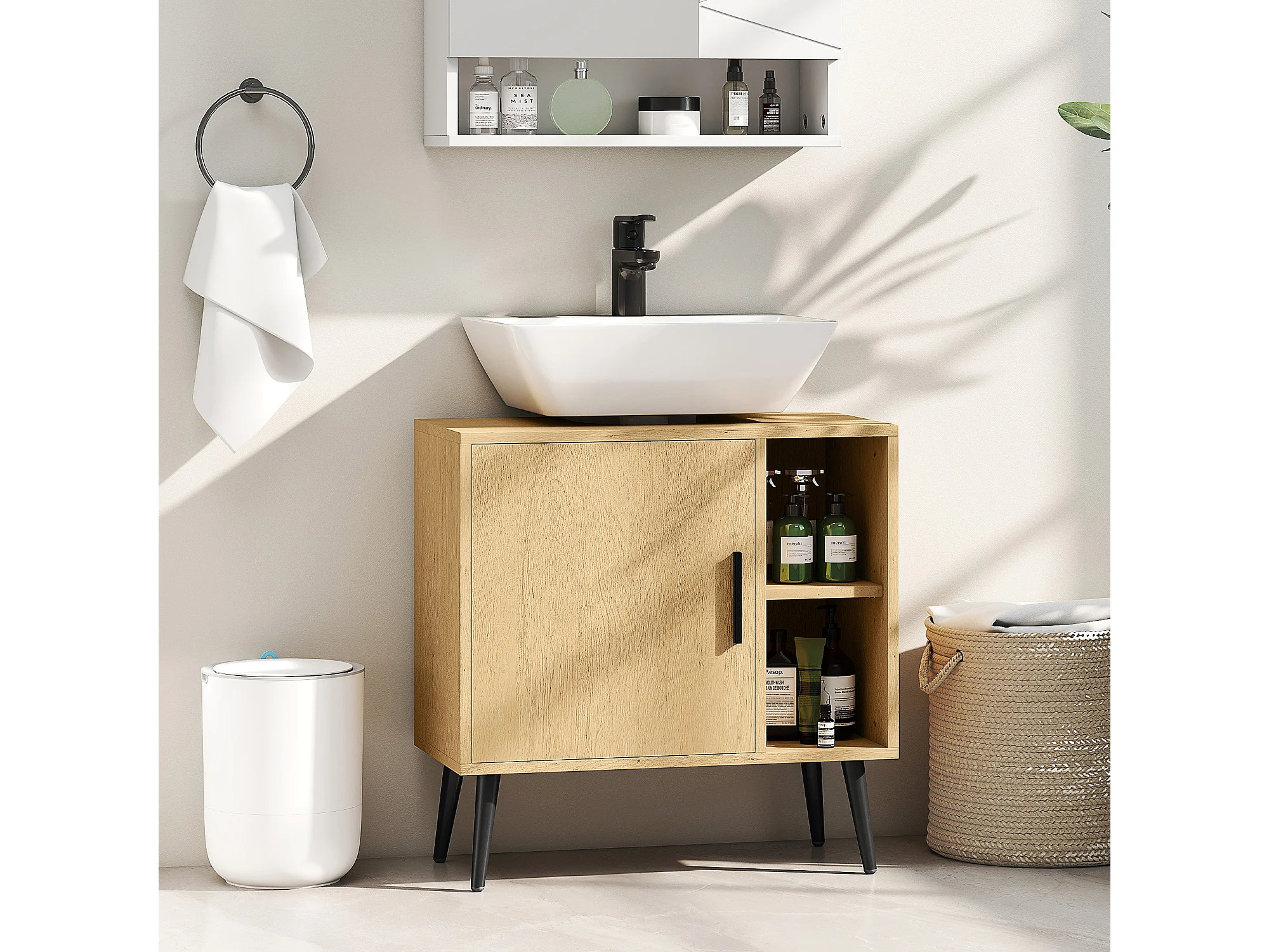Meuble sous vasque style nordique dim. 60 x 30 x 59,5 cm - porte, 2 niches - piètement métal noir effet bois clair