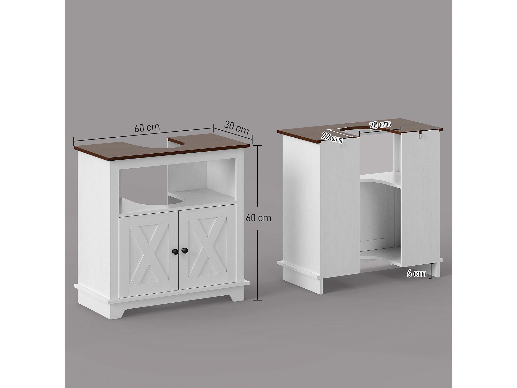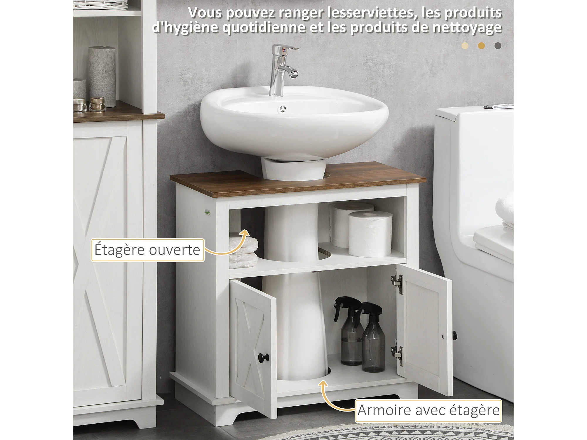 Meuble sous vasque style rural chic - 2 portes, niche - poignées boutons métal noir - aspect bois blanc noyer