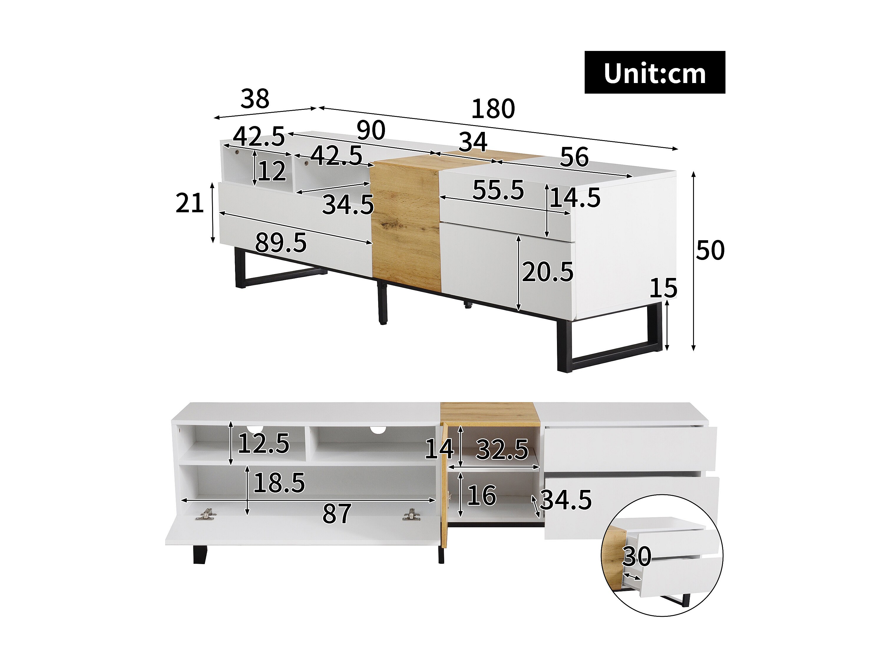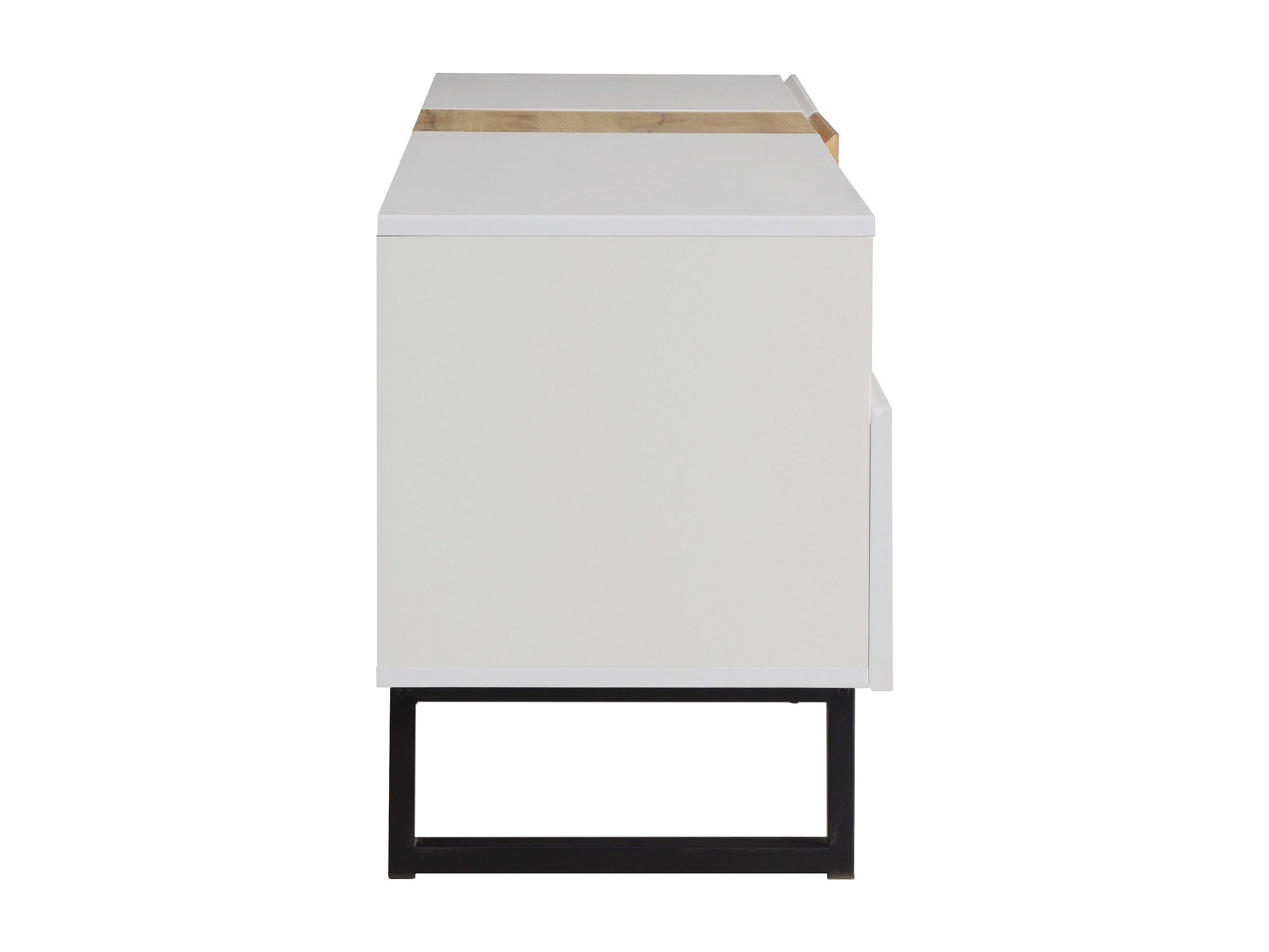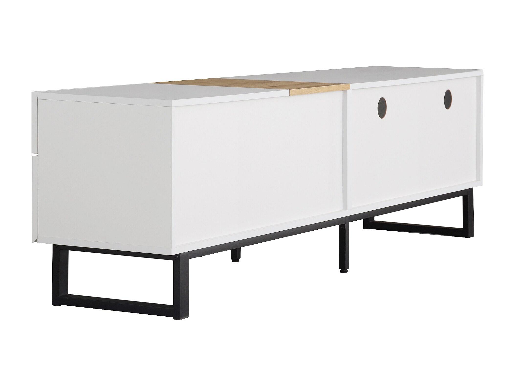 Meuble Télé de Salon avec 2 Portes, 2 Tiroirs et 2 Compartiments, avec Pieds en Métal, Blanc + Bois
