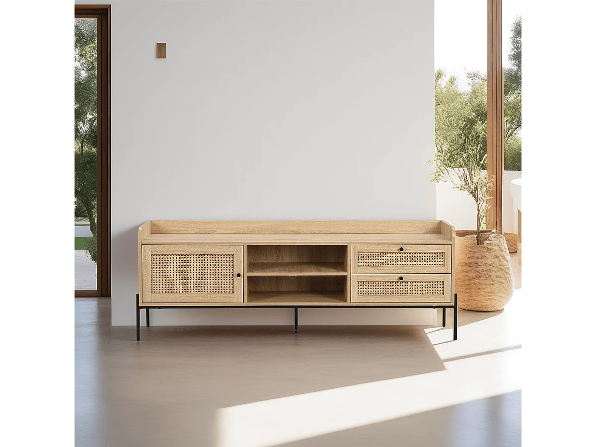 Meuble TV 1 porte 2 tiroirs en cannage naturel et effet chêne 160 cm - Iri