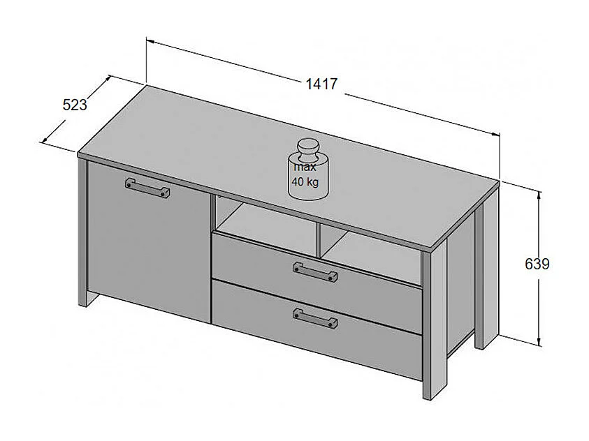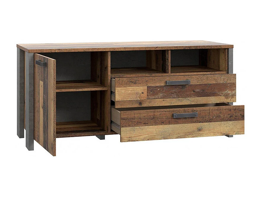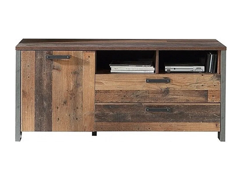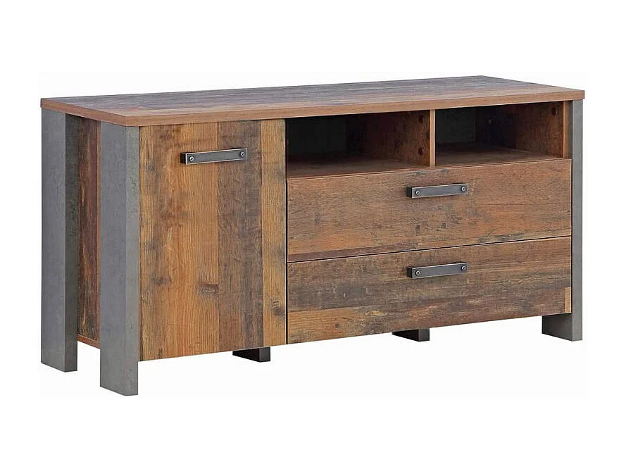 Meuble TV 1 porte et 2 tiroirs effet bois vieilli et béton gris - BUCK