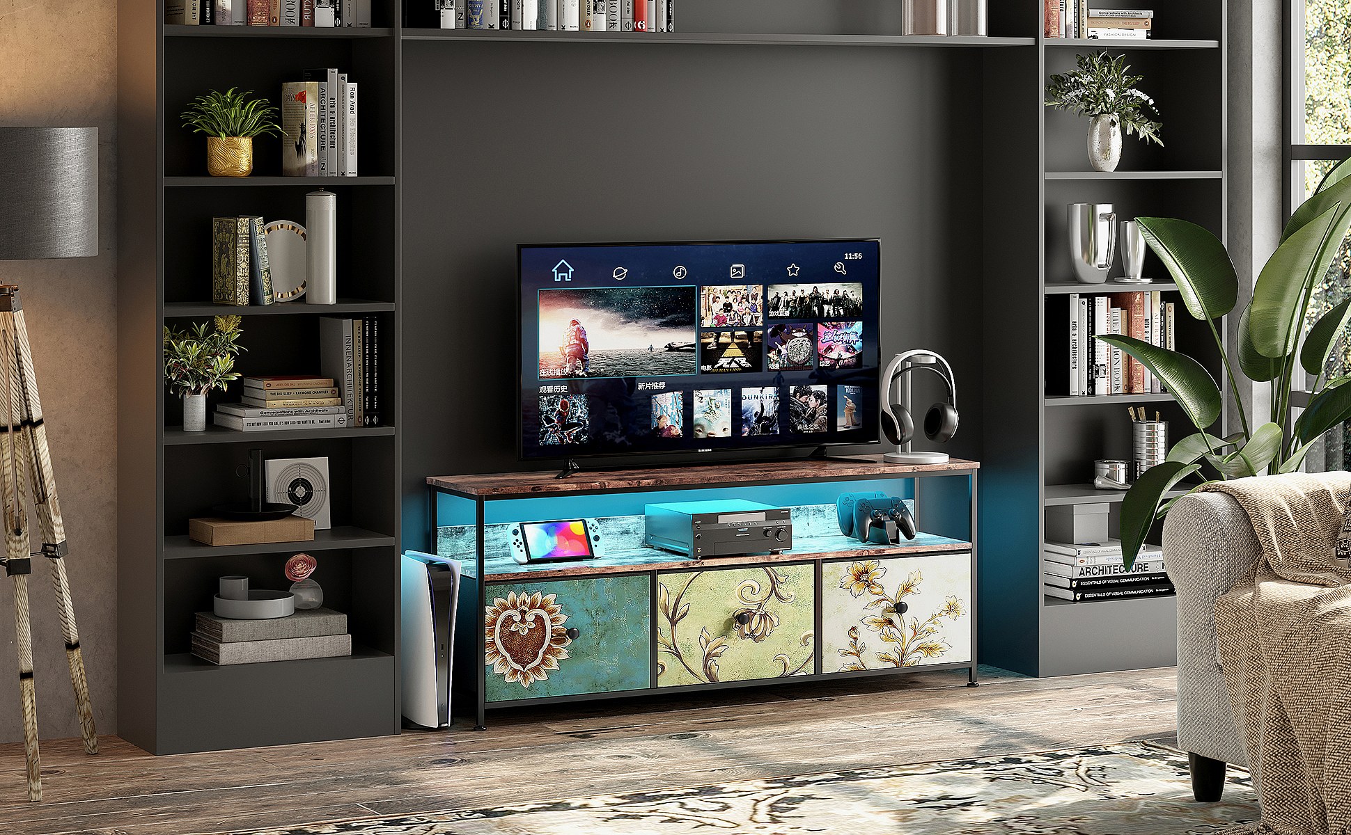 Meuble TV 108 cm avec éclairage LED, 4 tiroirs en tissu imprimé, plateau bois tigre, cadre métal, pieds ajustables
