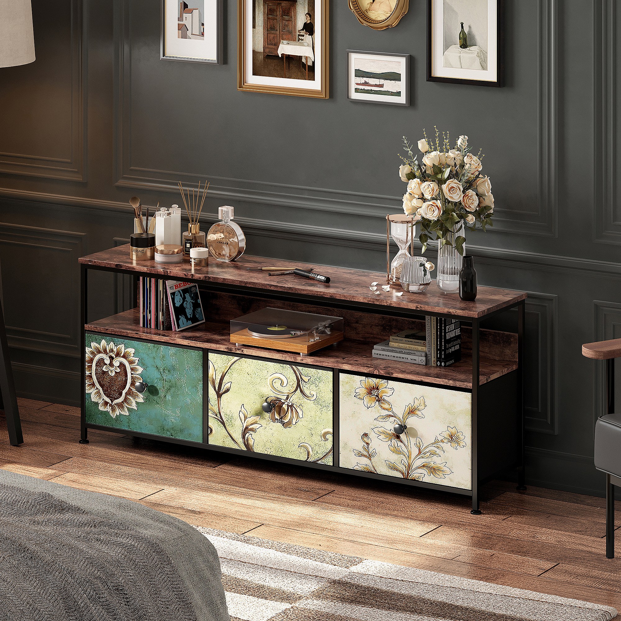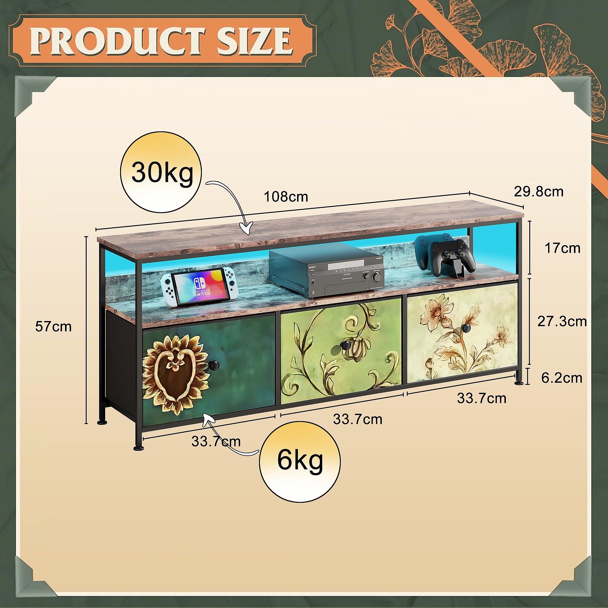 Meuble TV 108 cm avec LED, plateau effet bois tigre, 4 tiroirs en tissu coloré, cadre en métal, rangement moderne avec pieds réglables