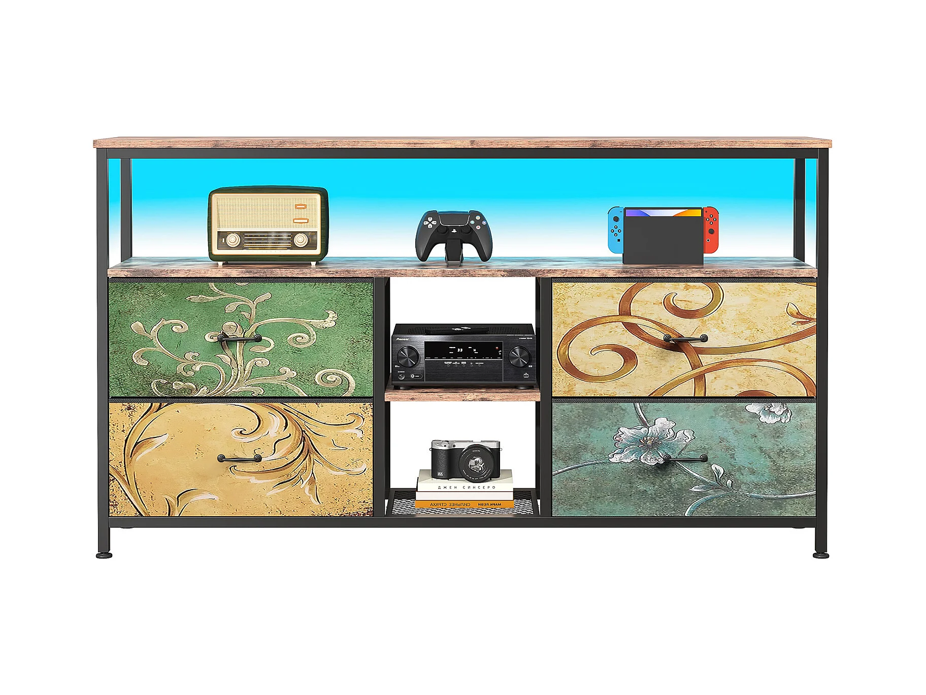 Meuble TV - 108x30x78cm - Éclairage LED - 4 Tiroirs PU Coloré - Métal noir et tissu coloré