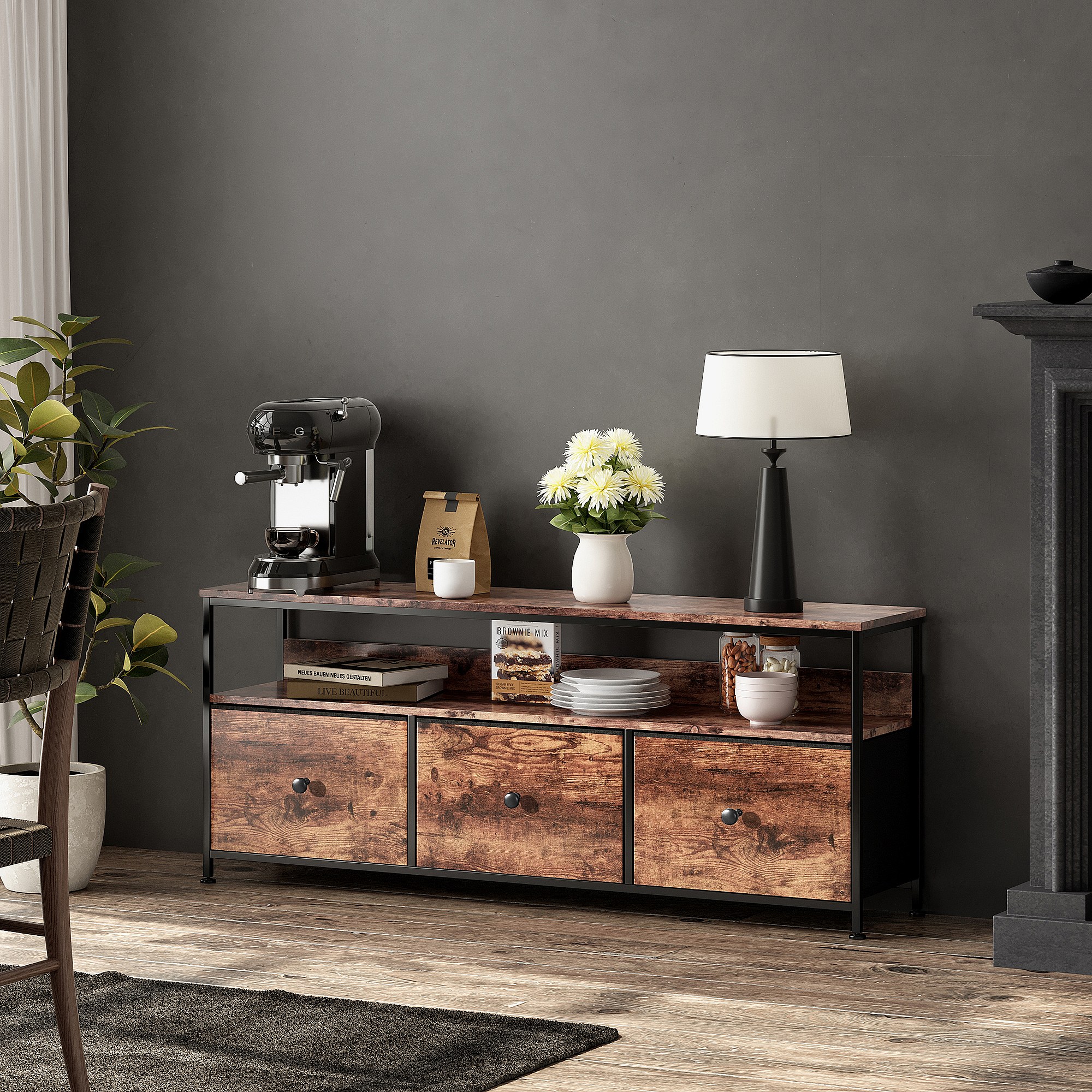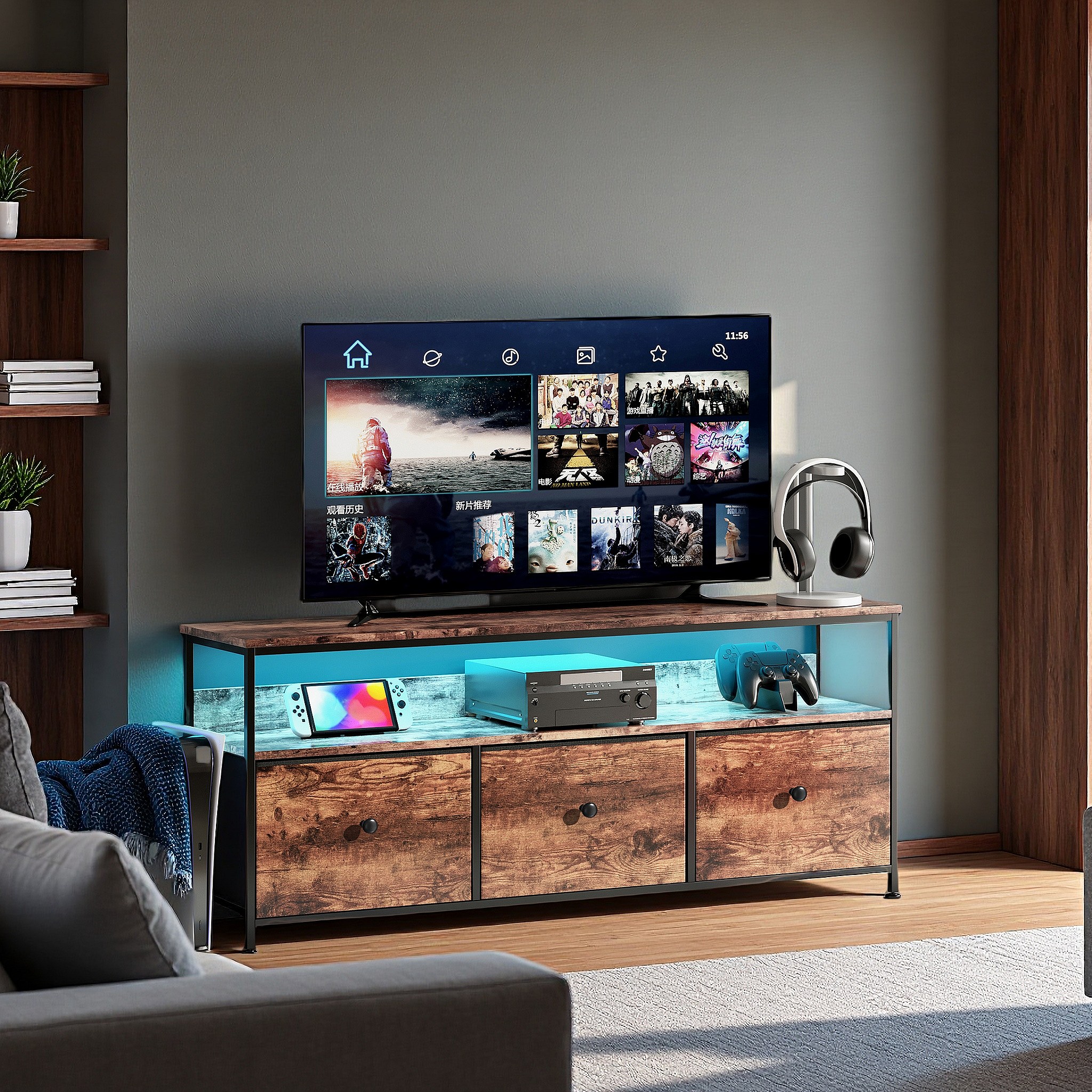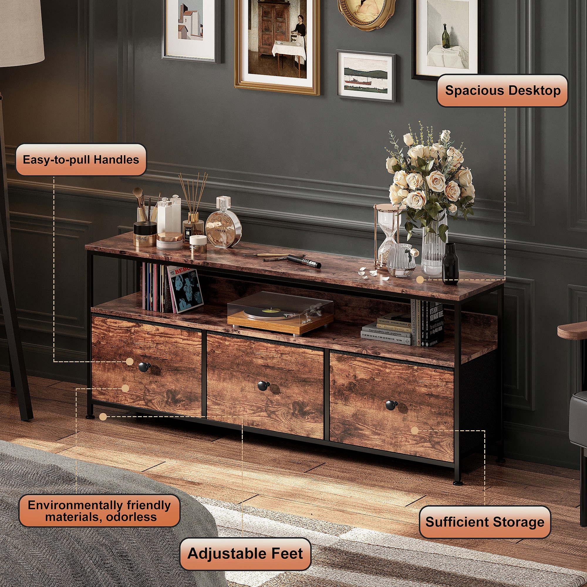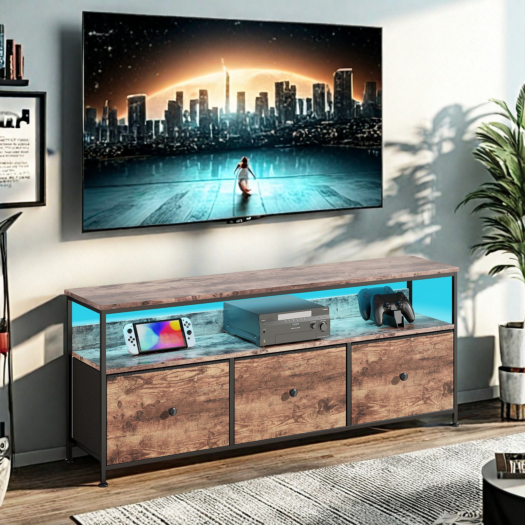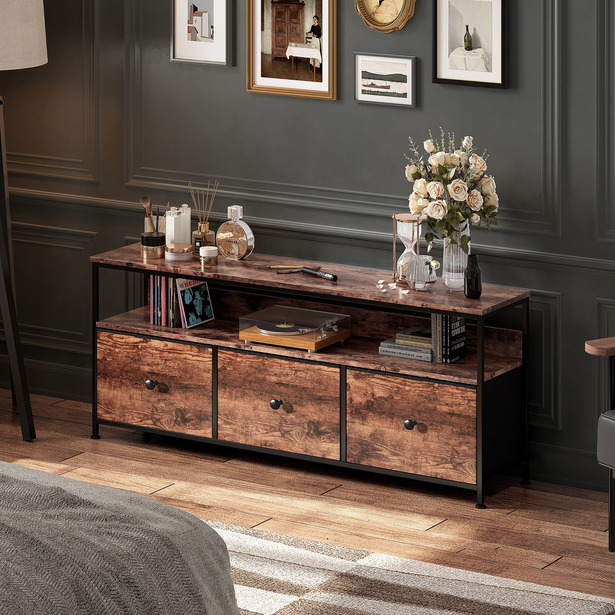 Meuble TV 137 cm LED, plateau effet bois tigre, 3 tiroirs tissu vintage, cadre métal robuste, pieds réglables, style rétro-moderne