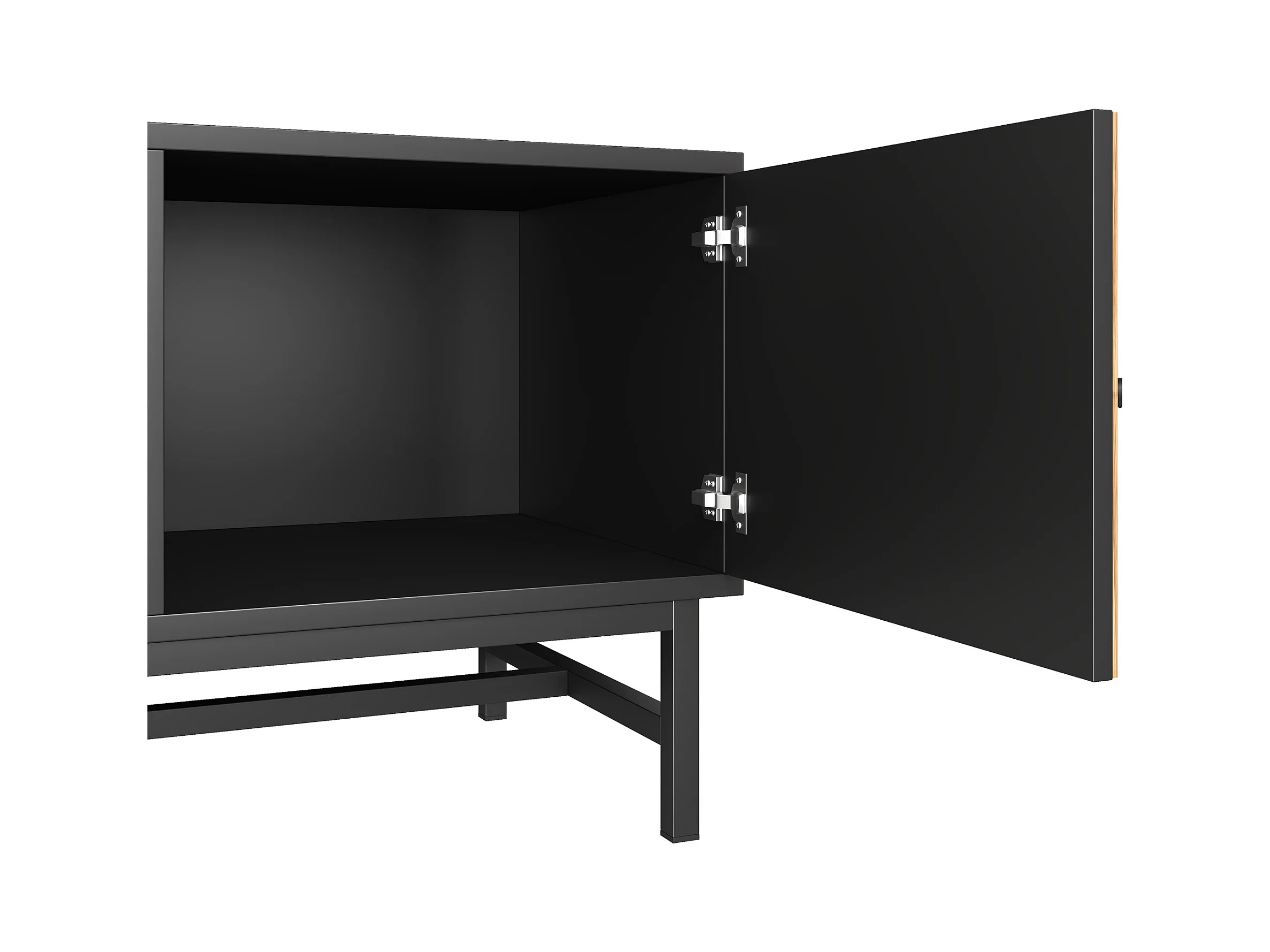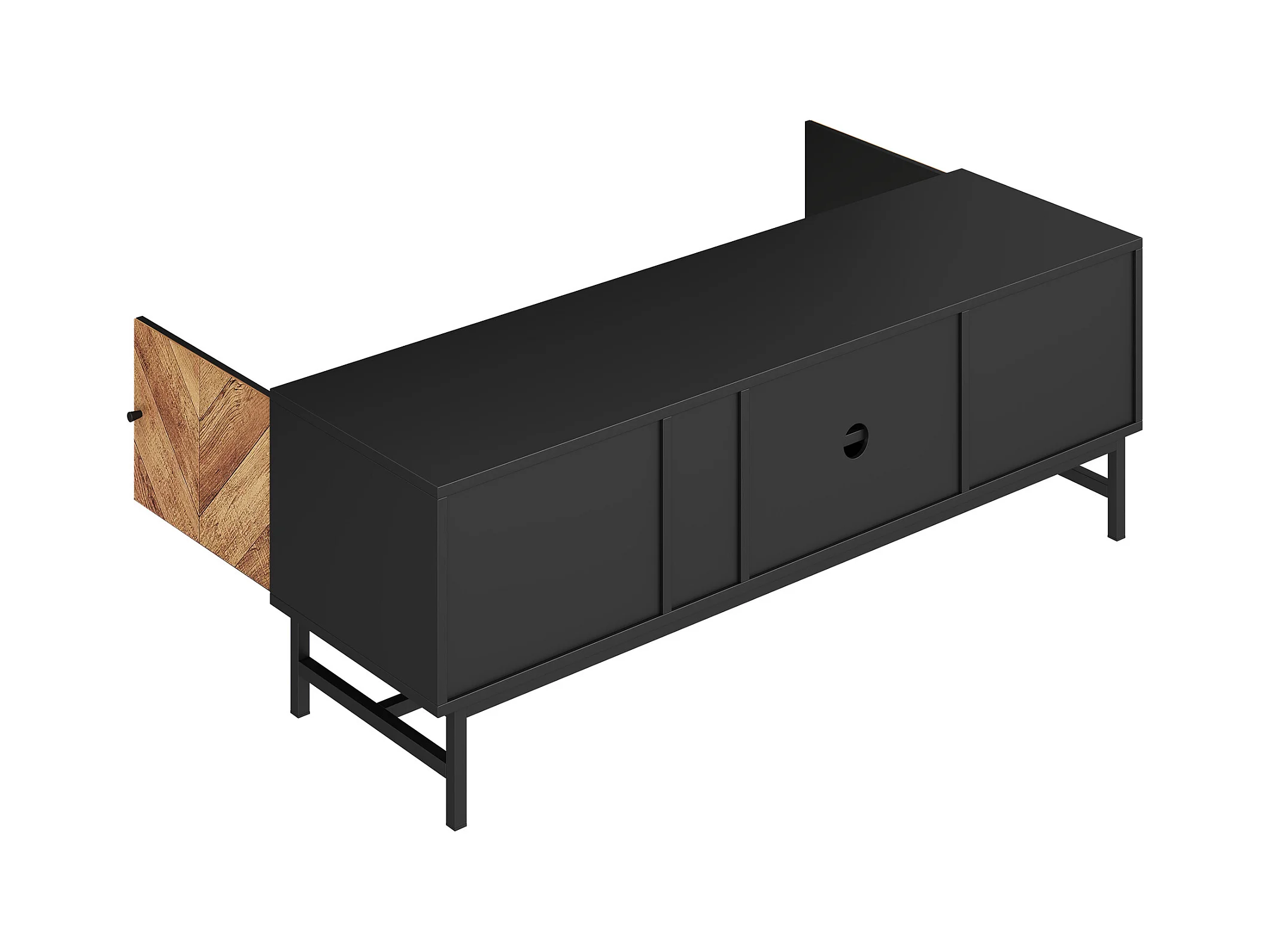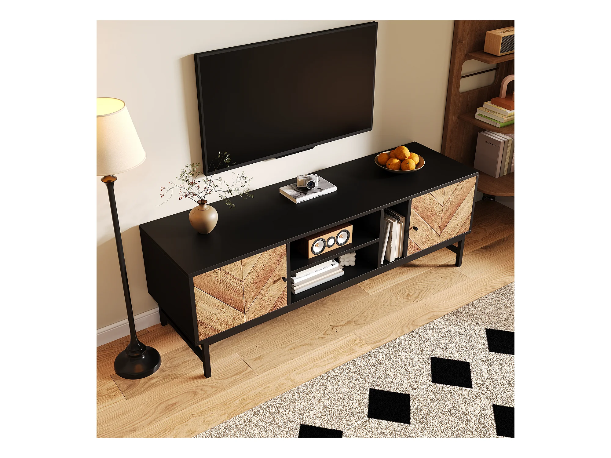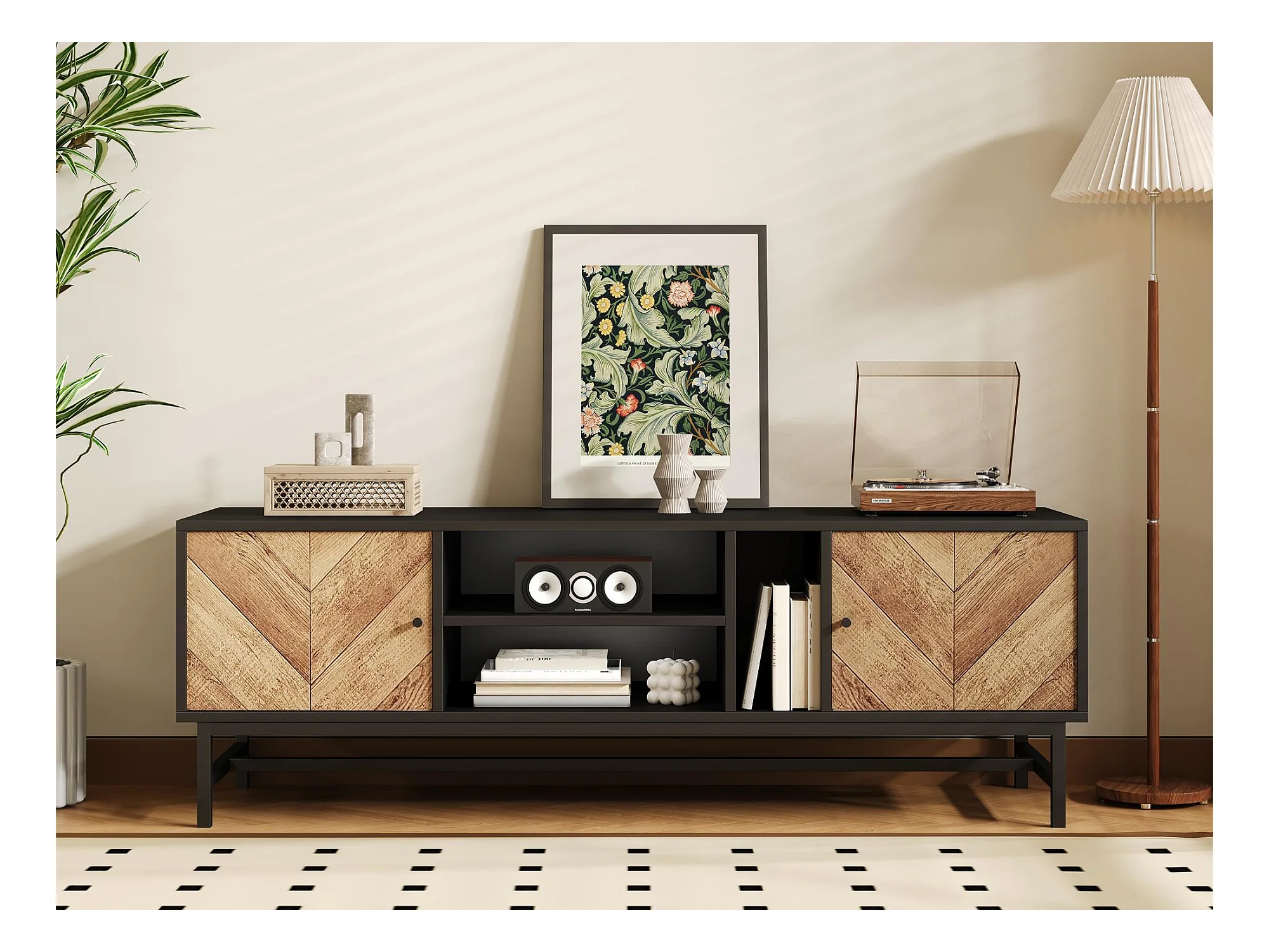 Meuble TV 150x38x55cm - avec étagères et 2 portes - Naturel + Noir