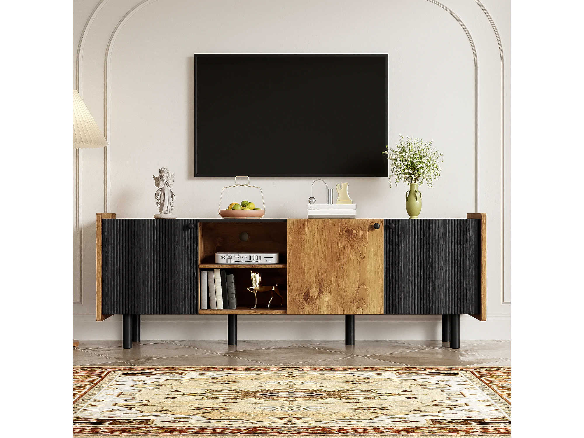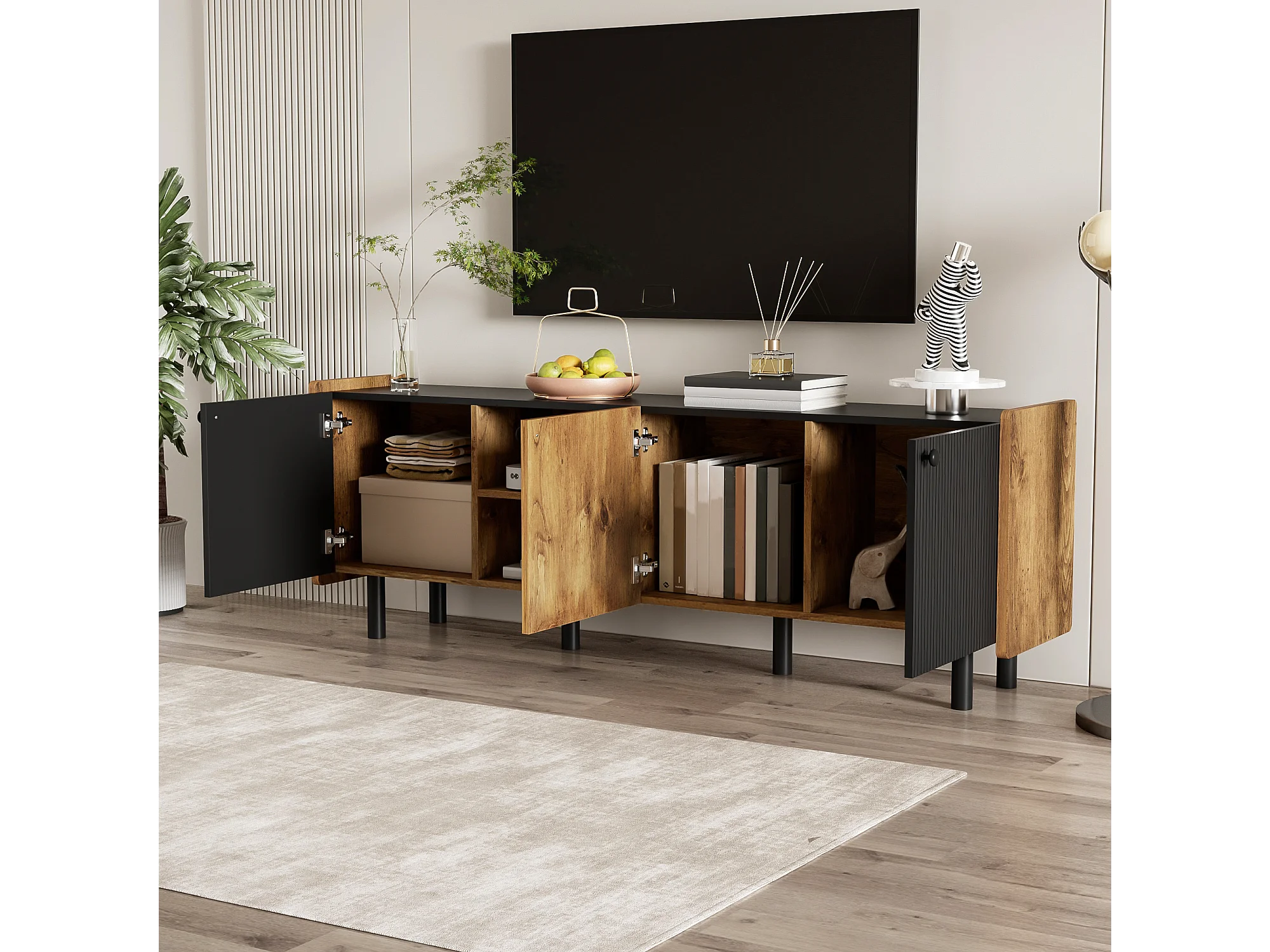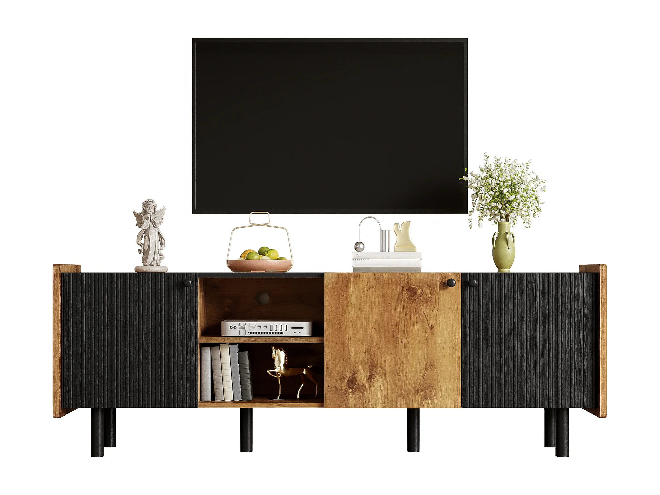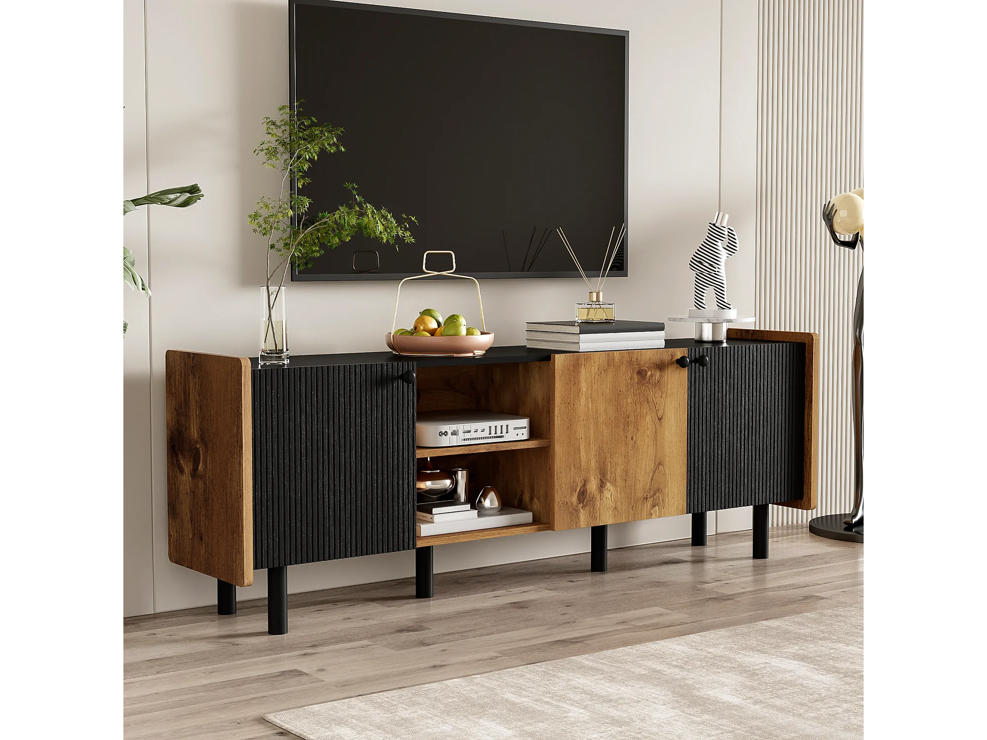 Meuble TV 160 cm avec 3 portes et 2 compartiments ouverts - Panneaux de particules et MDF - Style Moderne - Noir et bois