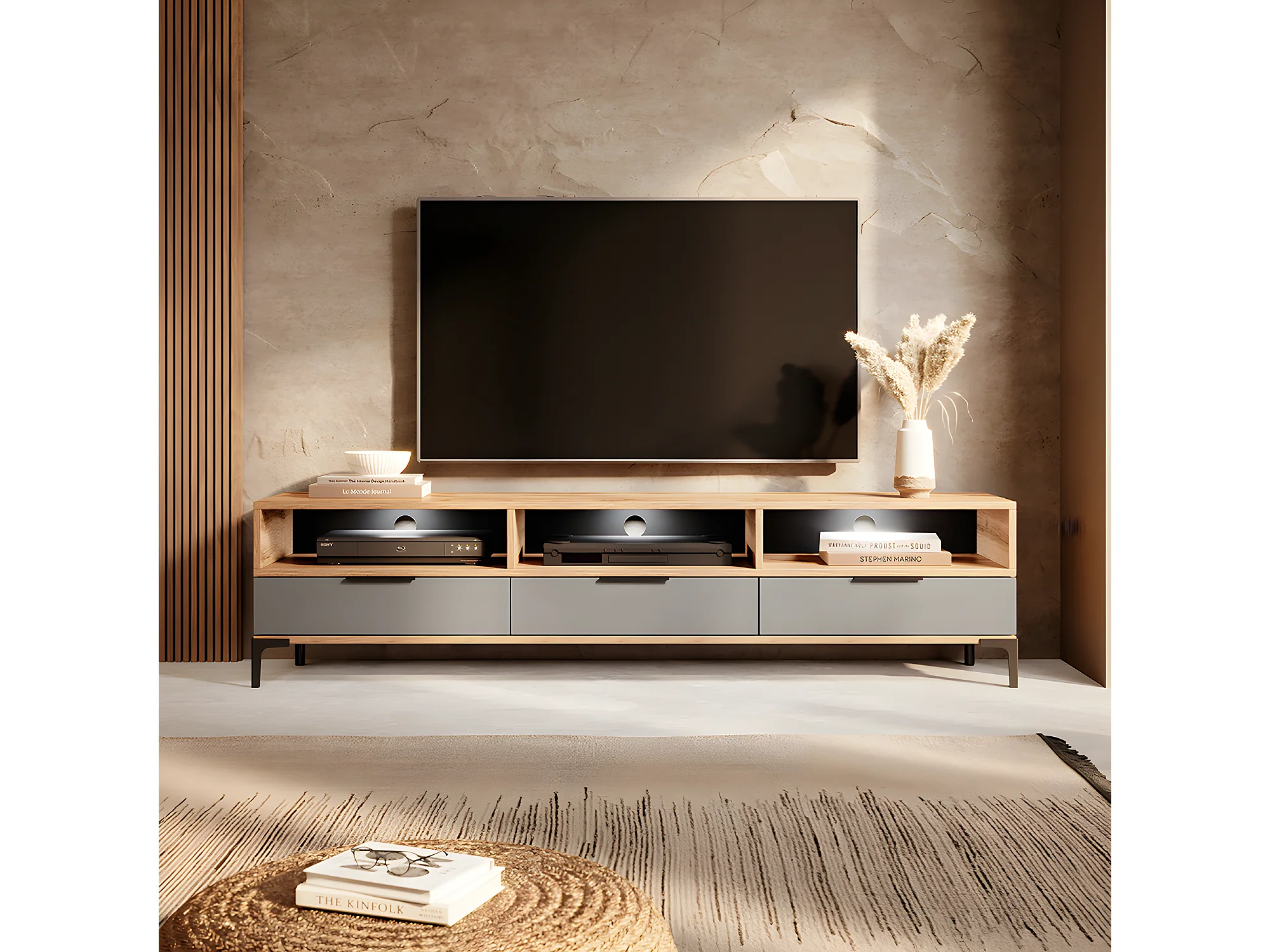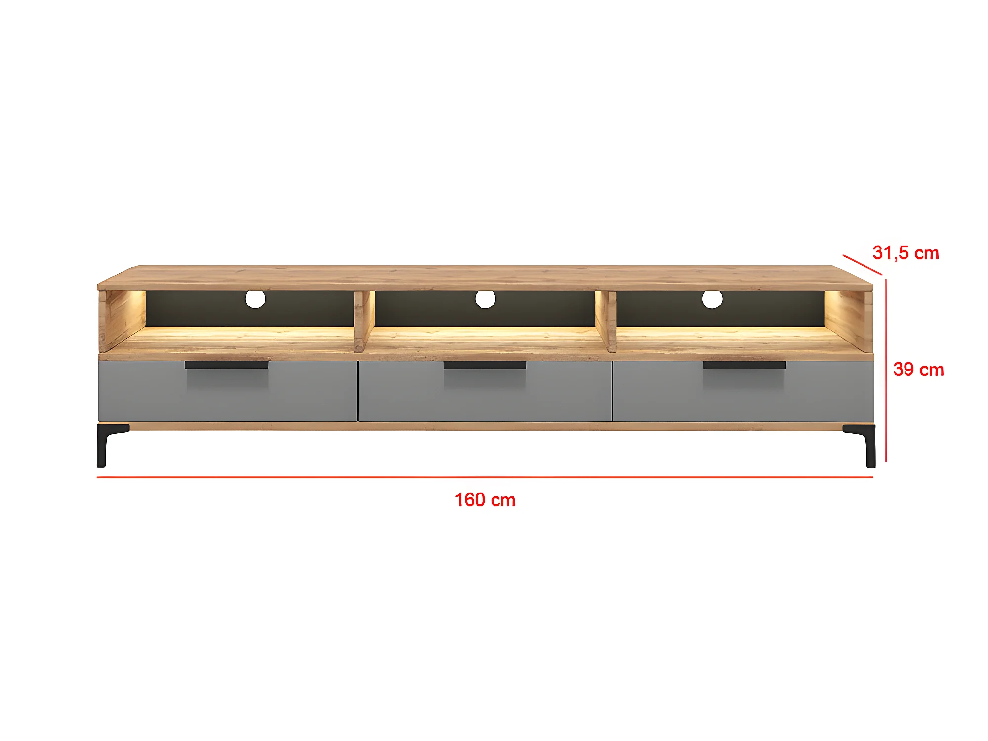 Meuble TV - 160 cm - chêne wotan / gris brillant - avec LED- RIKKE