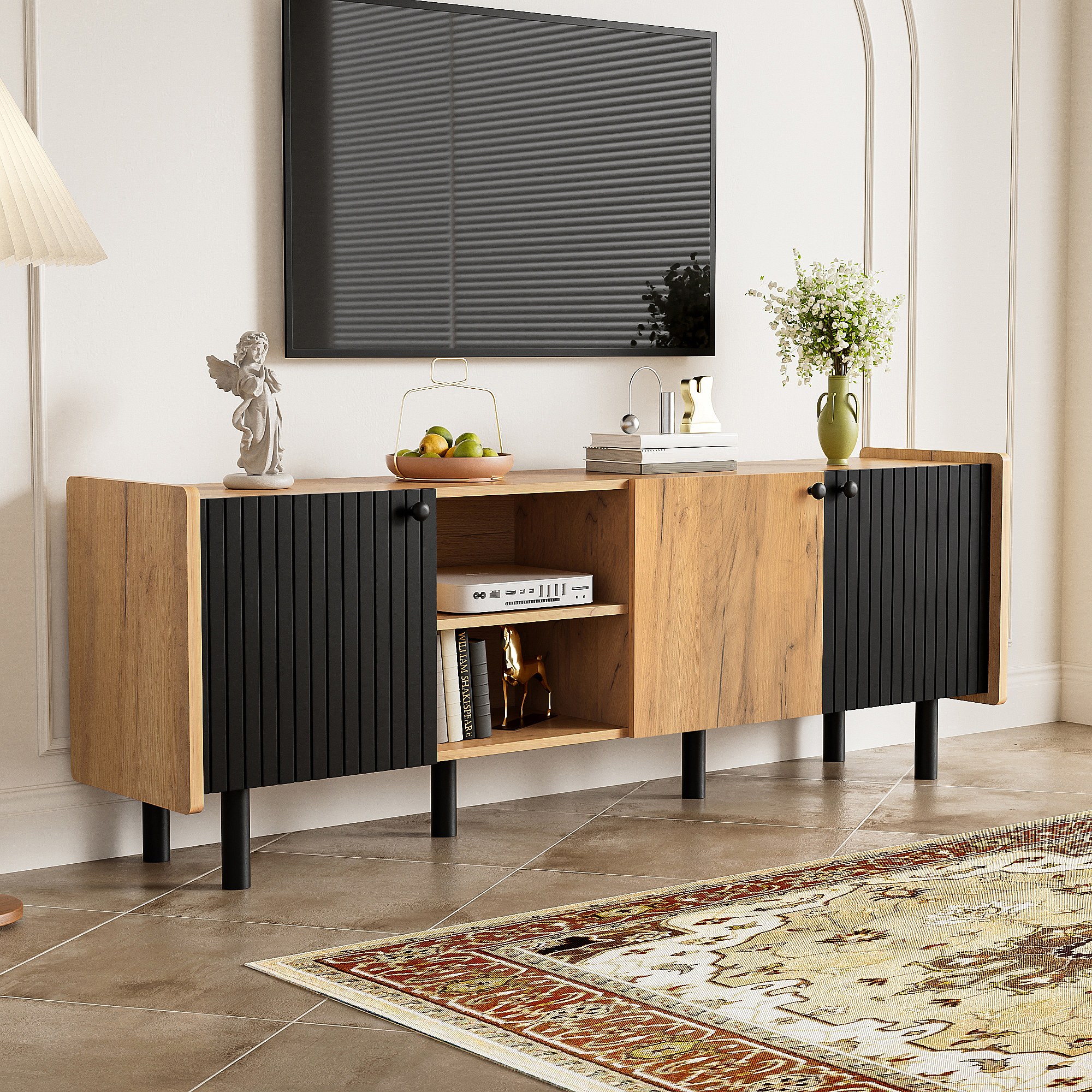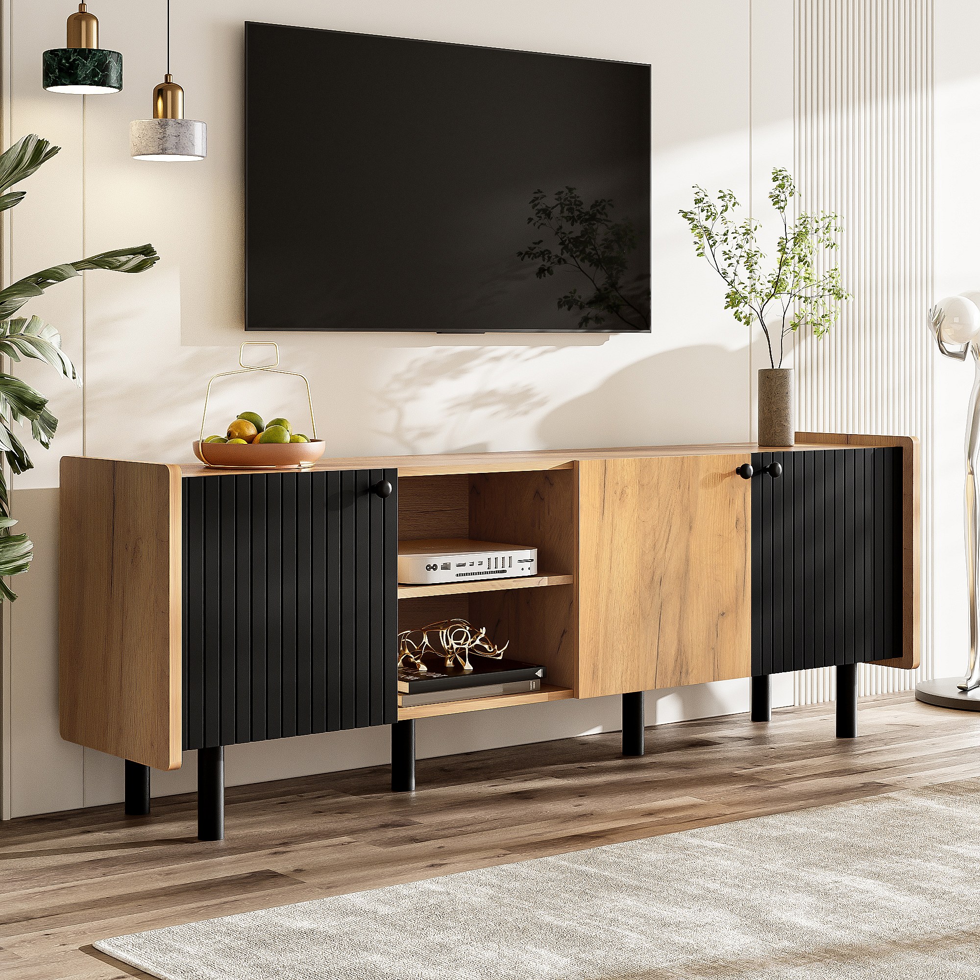 Meuble TV 160 cm noir et bois, style moderne avec trois portes et deux compartiments ouverts, design élégant pour le salon.