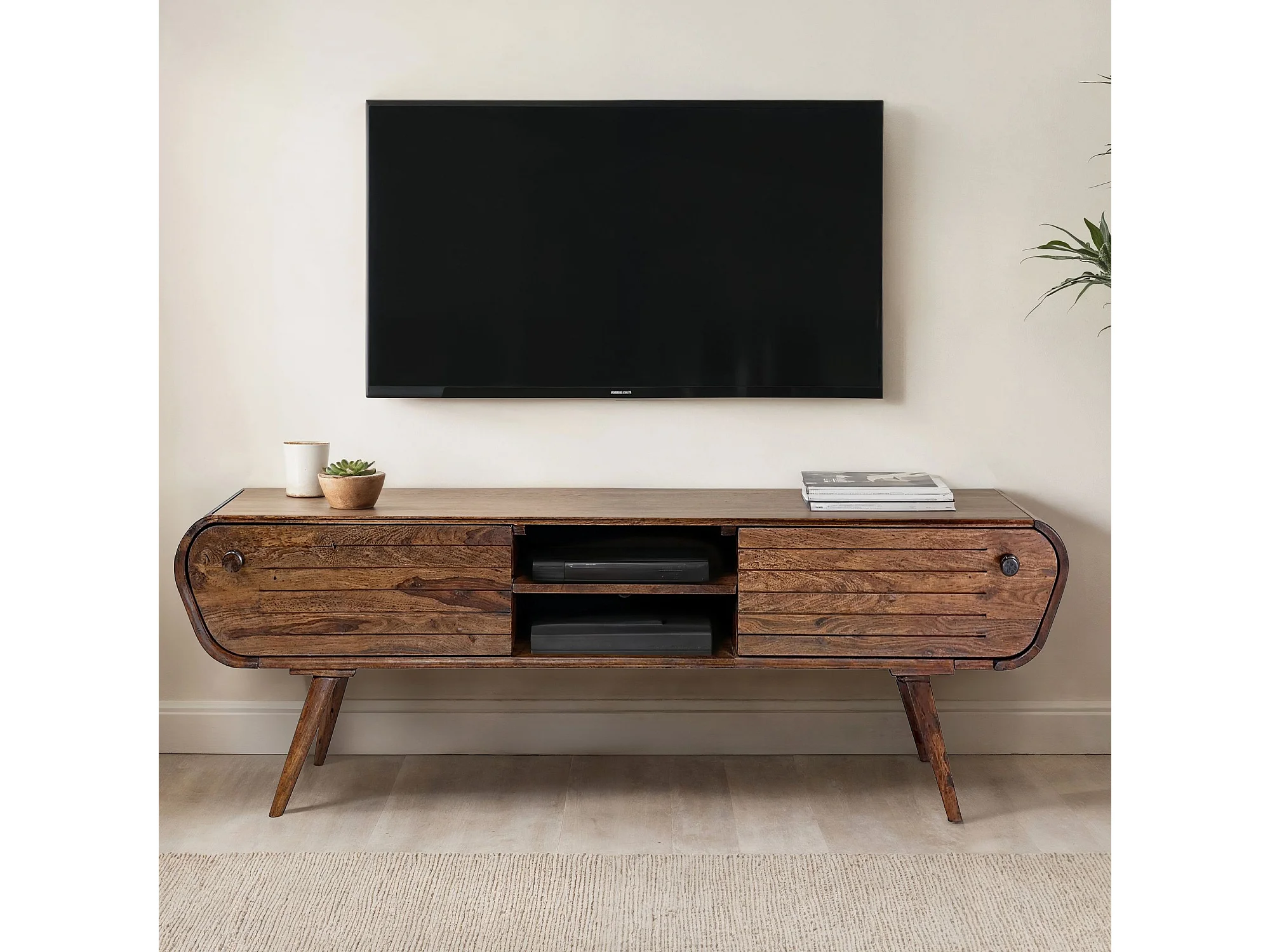 Meuble TV 160 cm Sheesham Massif Tiroirs Compartiments Salon Vintage