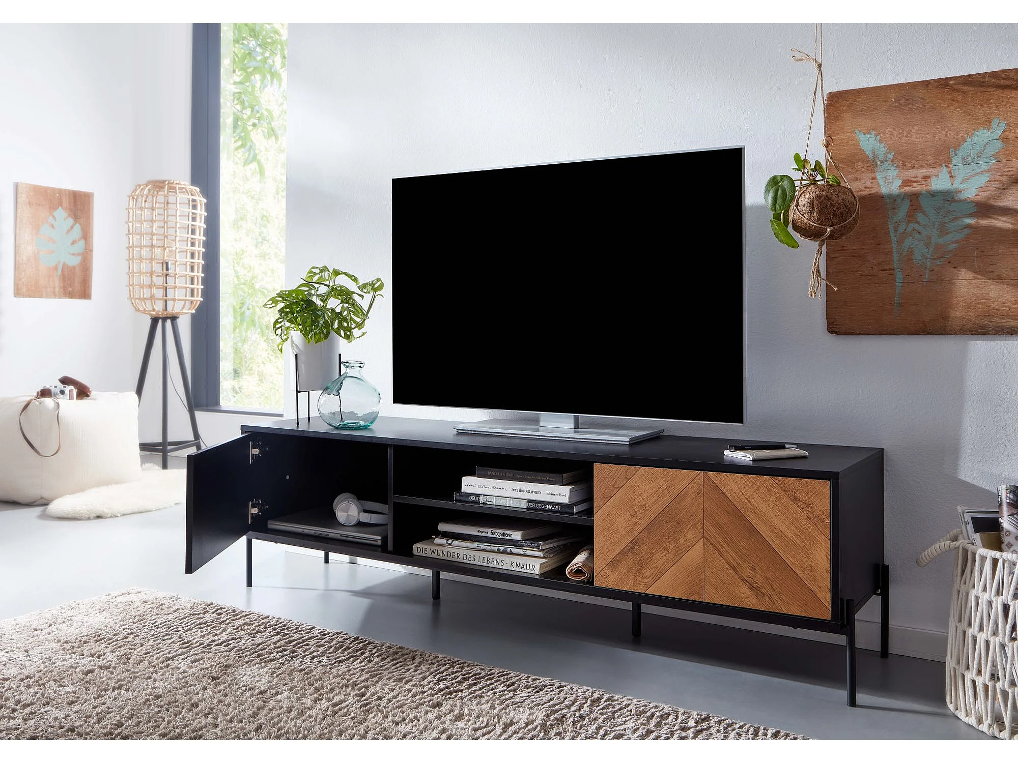 Meuble TV 163x45x40 cm Bois Noir Chêne Lowboard Panneau de Télévision