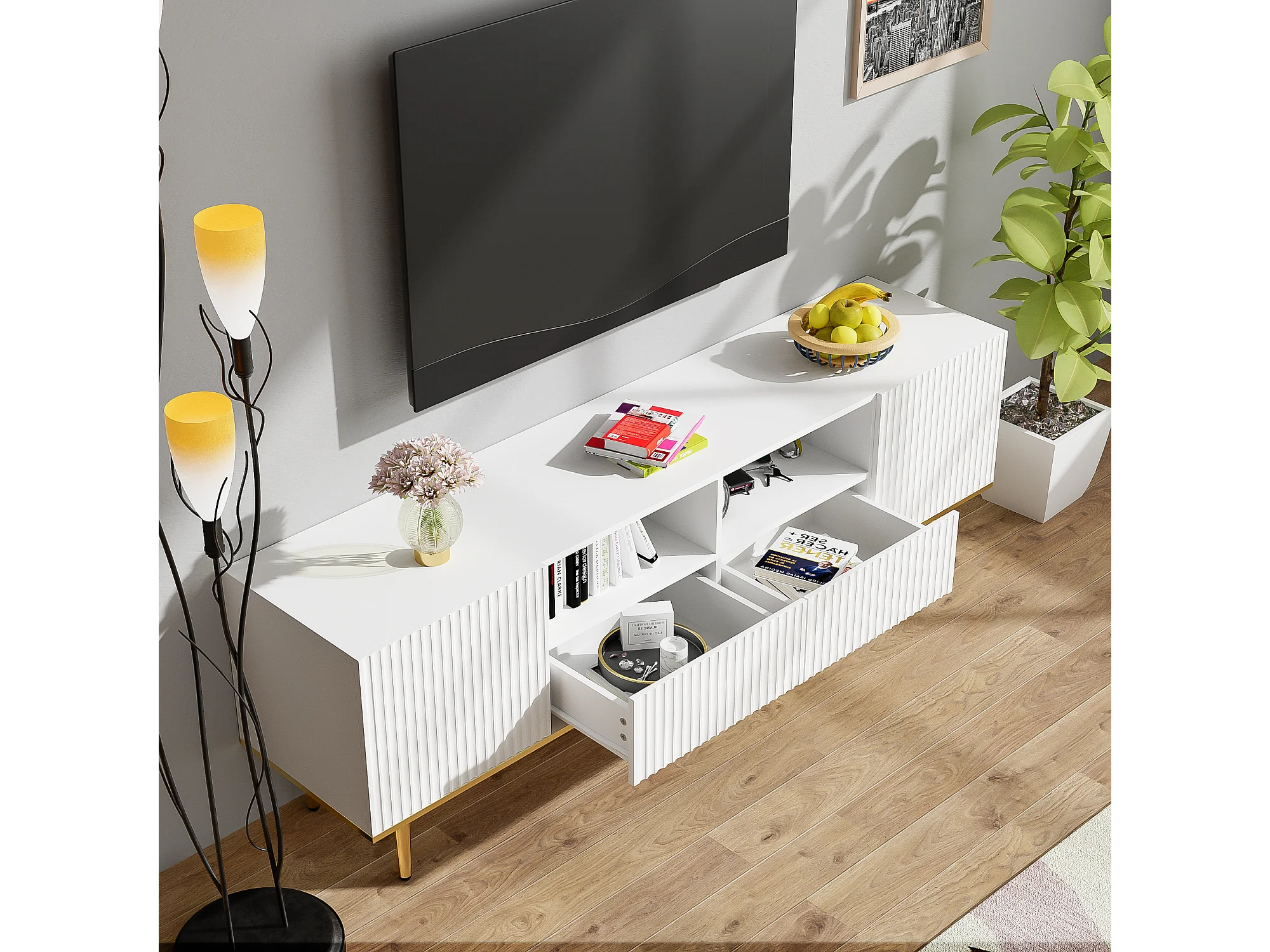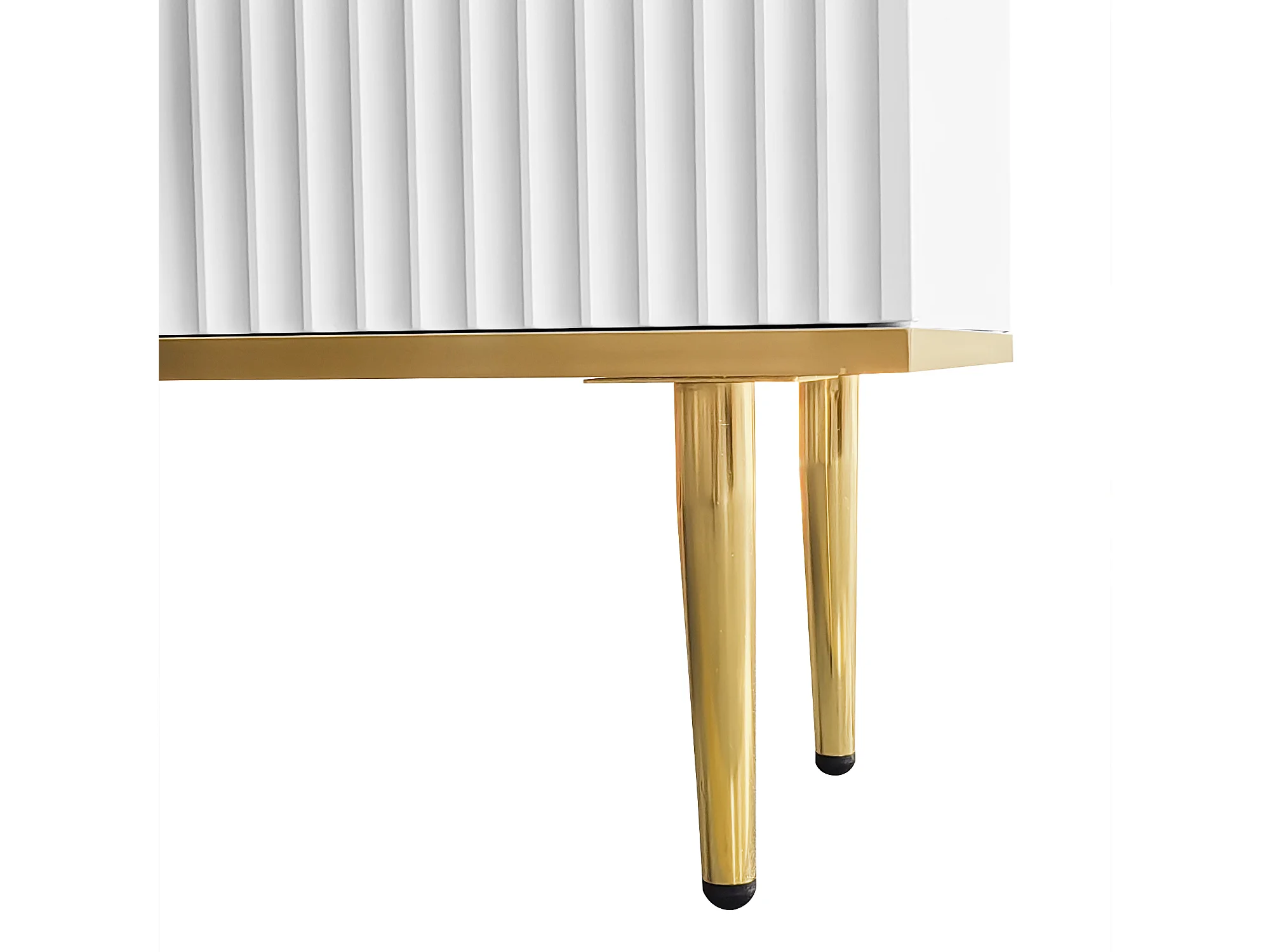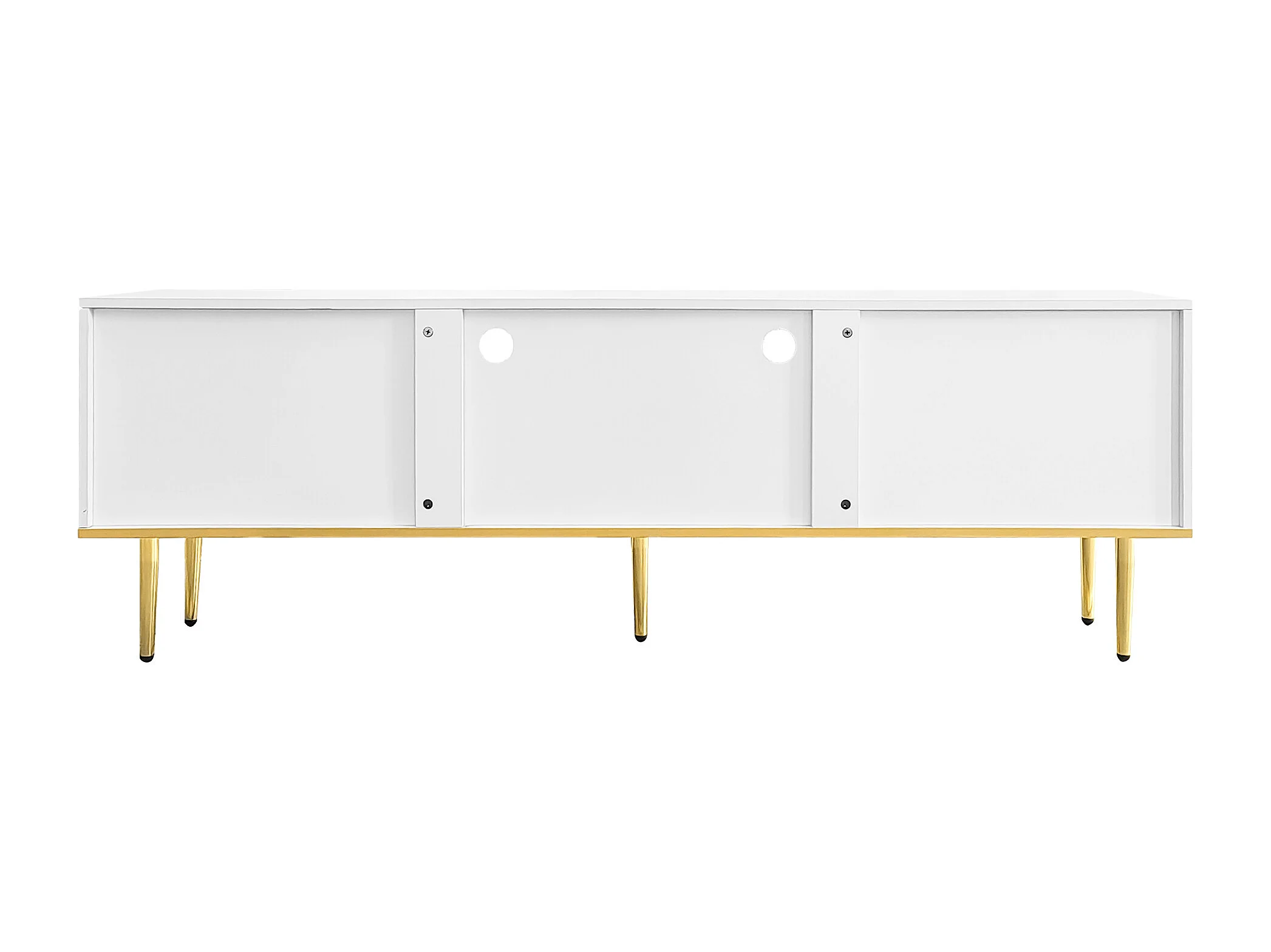 Meuble TV 165x36x55 cm, 2 compartiments, 2 tiroirs, accents dorés, panneau de particules, blanc