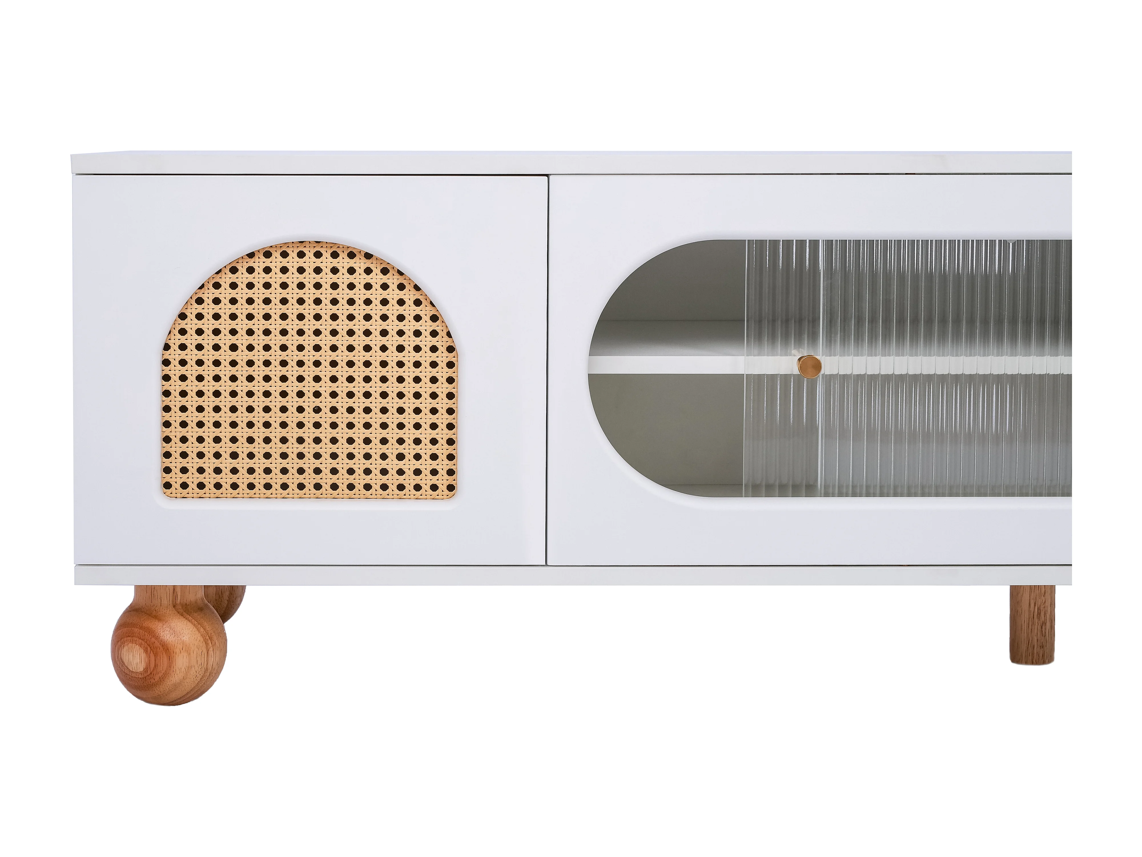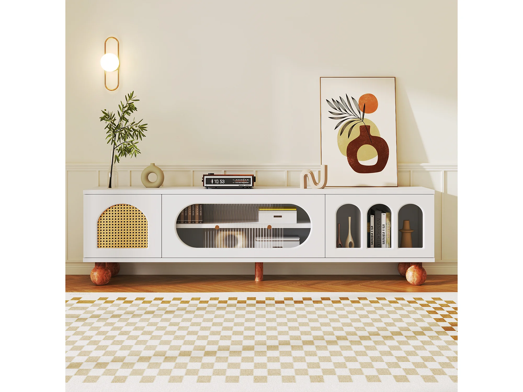 Meuble TV 170x47x37 cm, portes variées dont rotin et porte vitrine, porte coulissante en verre, panneau de particules blanc