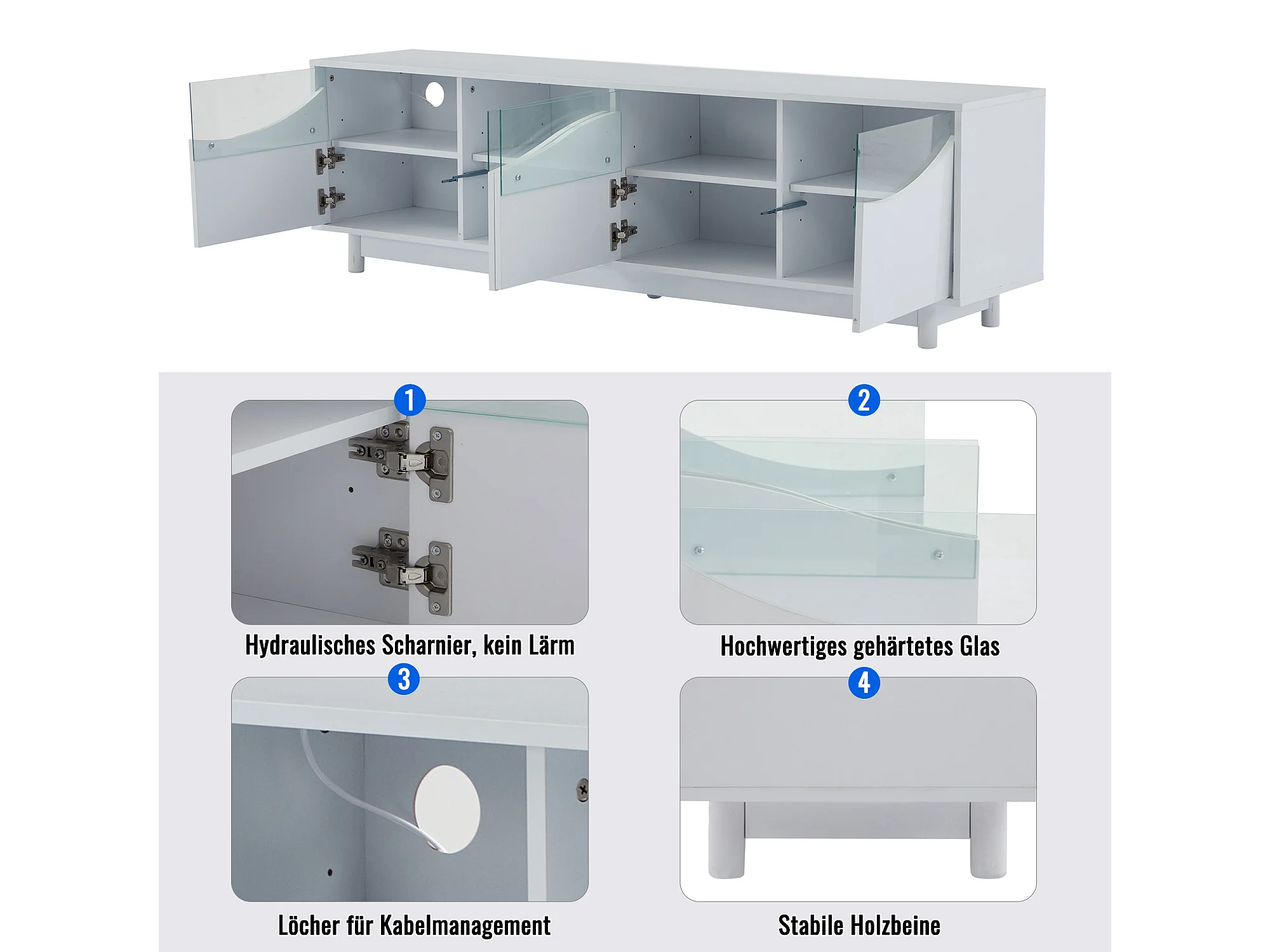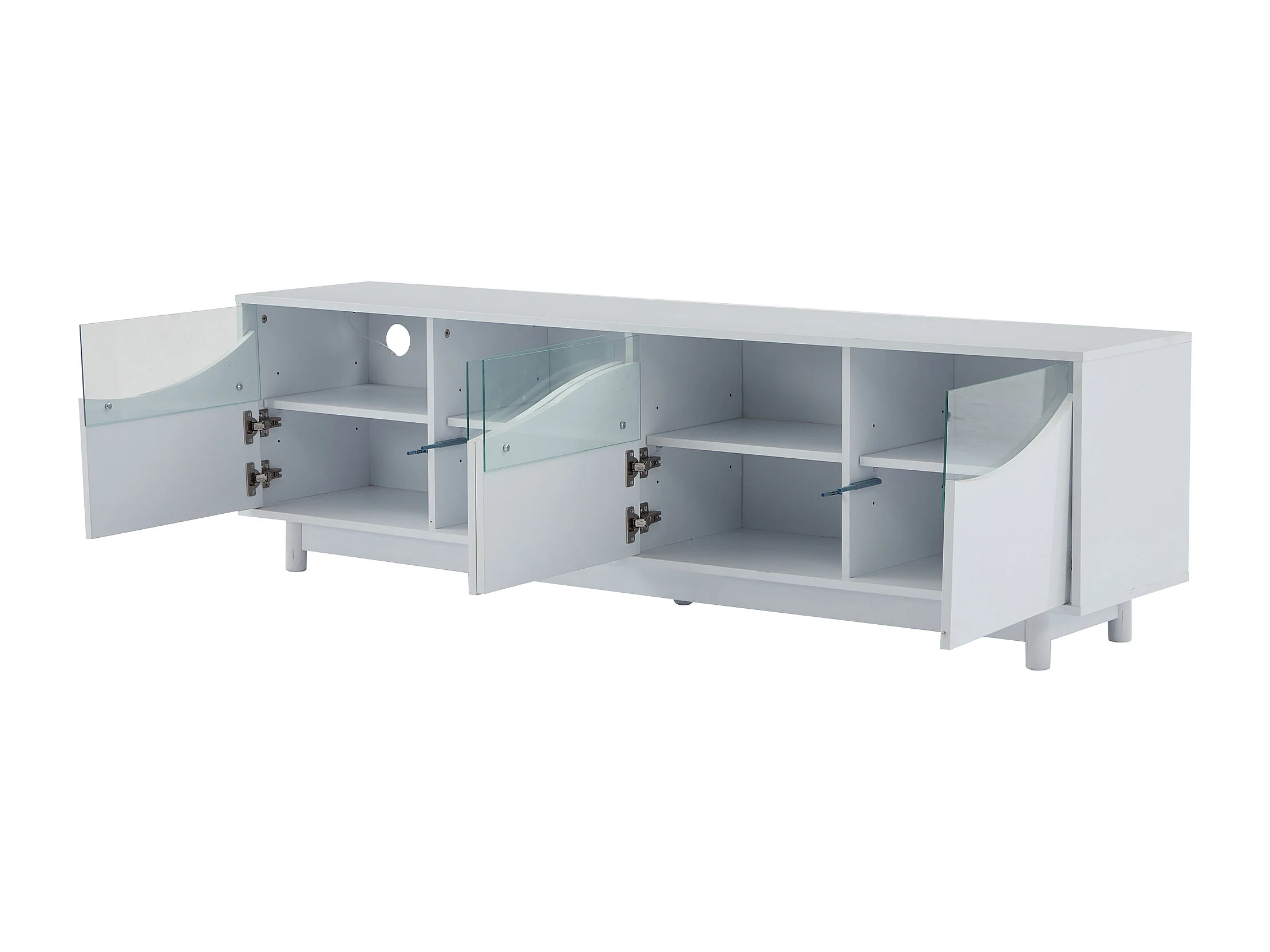Meuble TV 175x38x51cm, courbé, blanc brillant, façade en verre, éclairage LED