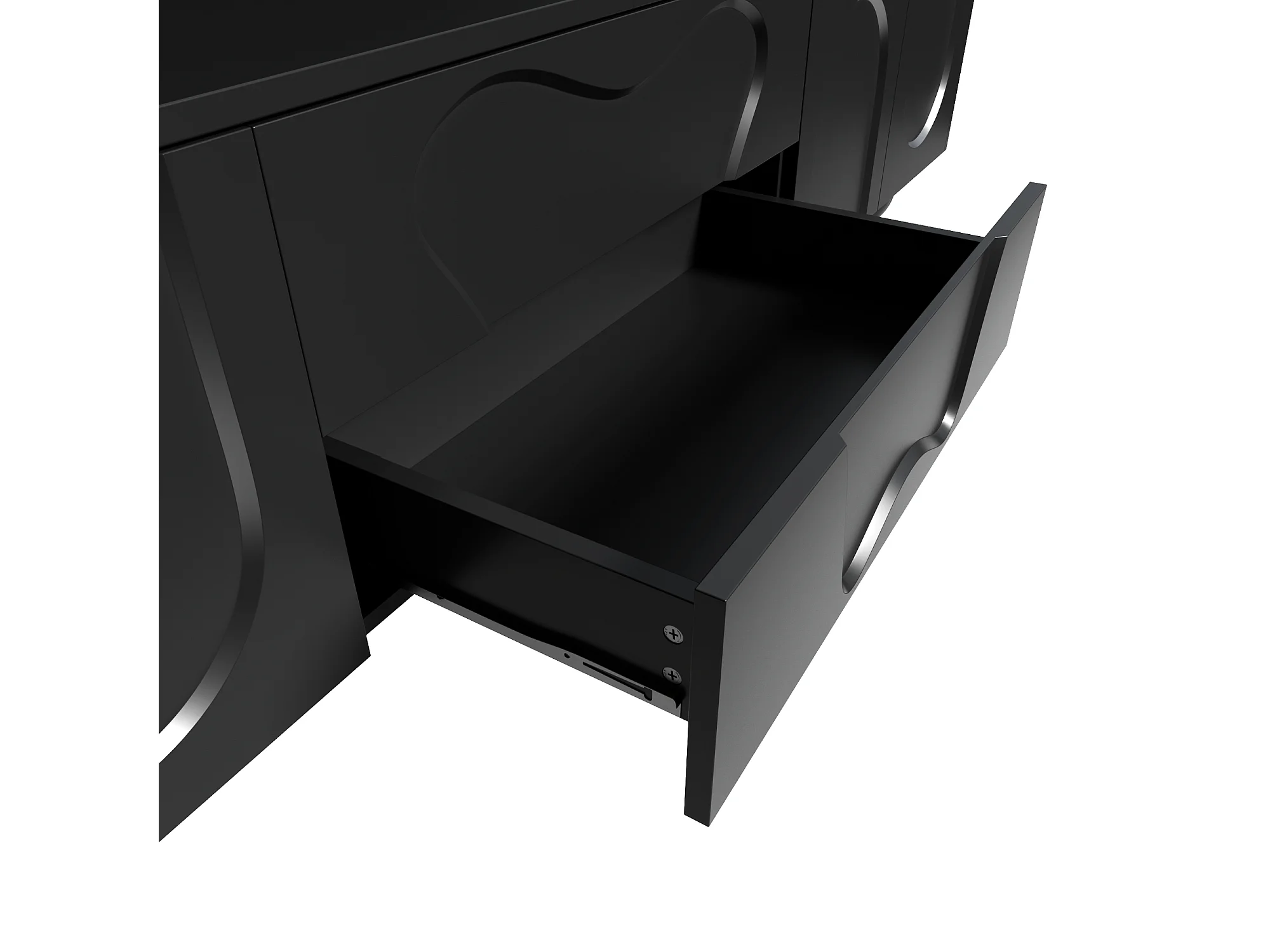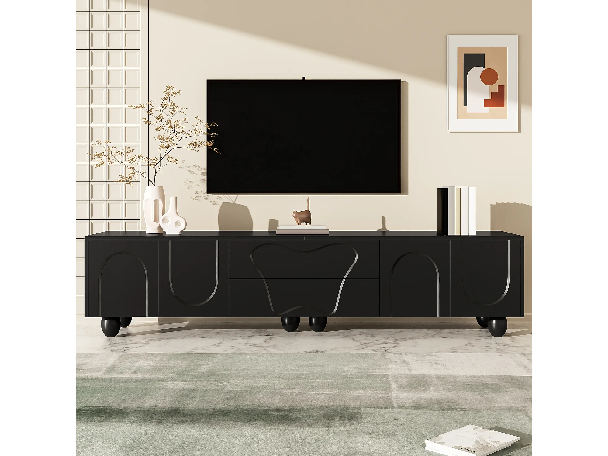 Meuble TV 180 cm noir avec pieds en bois, design minimaliste et élégant, grand espace de rangement, design unique et solutions de stockage flexibles pour salon.