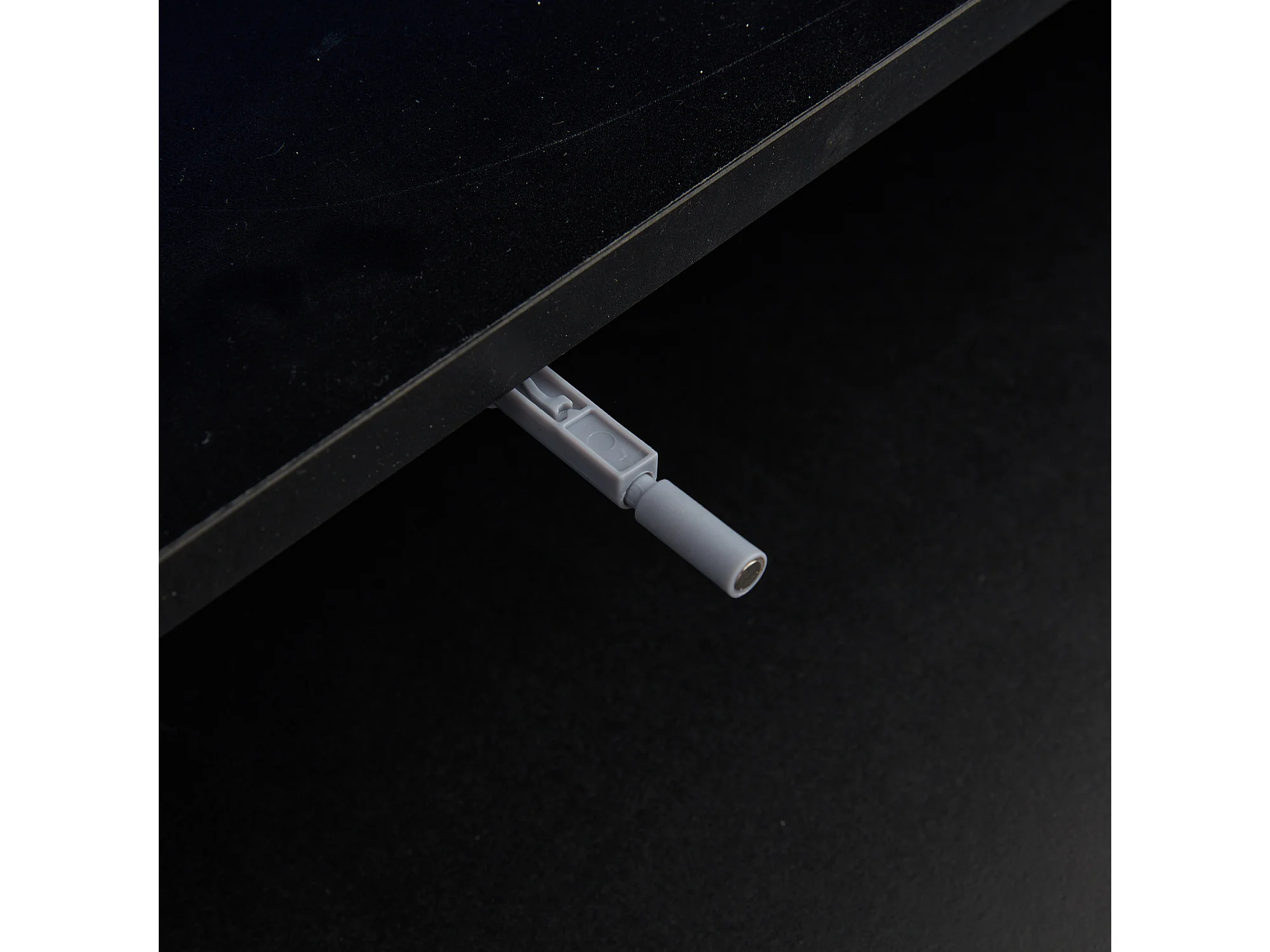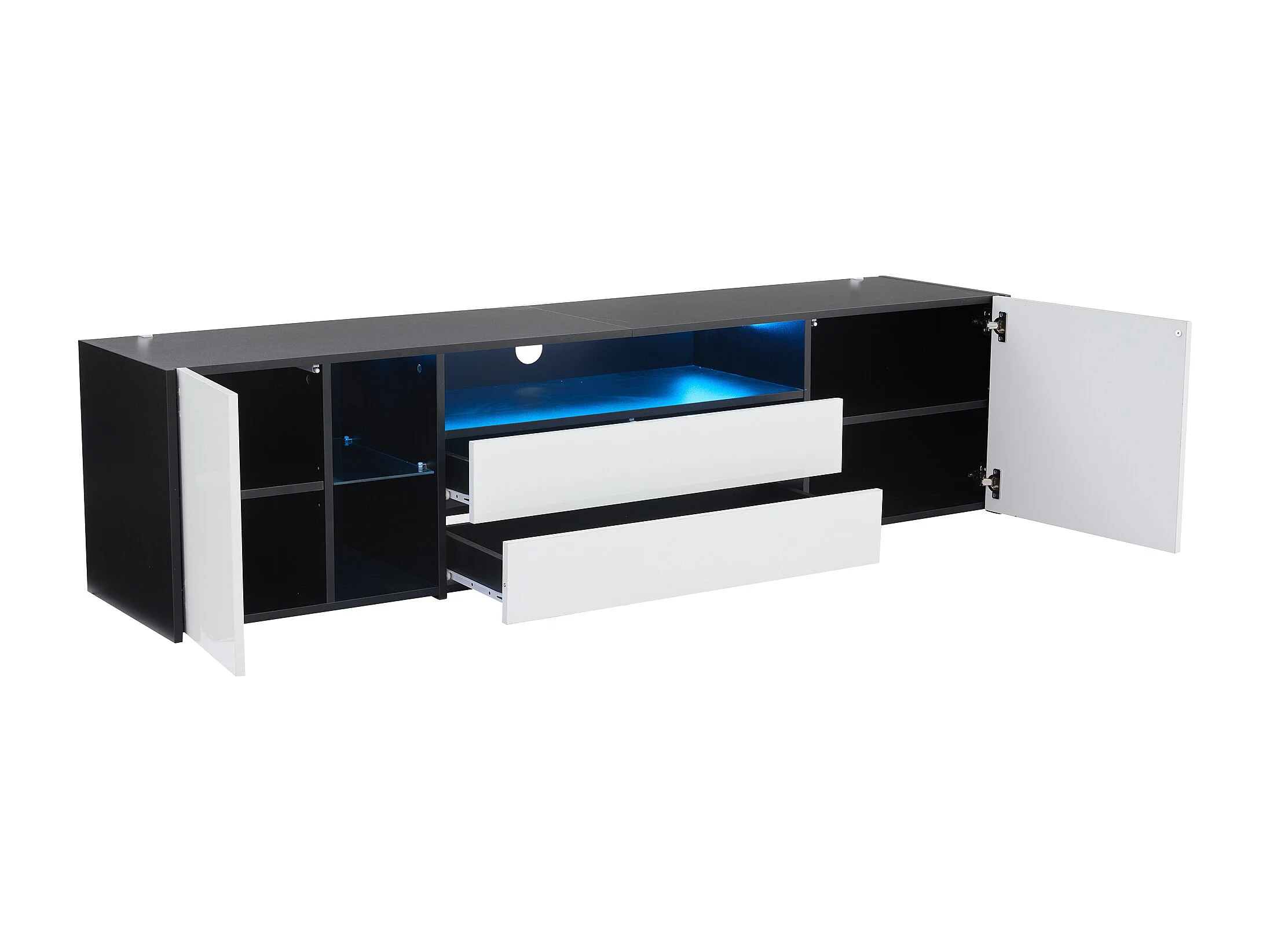 Meuble TV 180x40x45cm avec 2 portes et 2 tiroirs, LED inclus, corps en blanc et noir laqué brillant