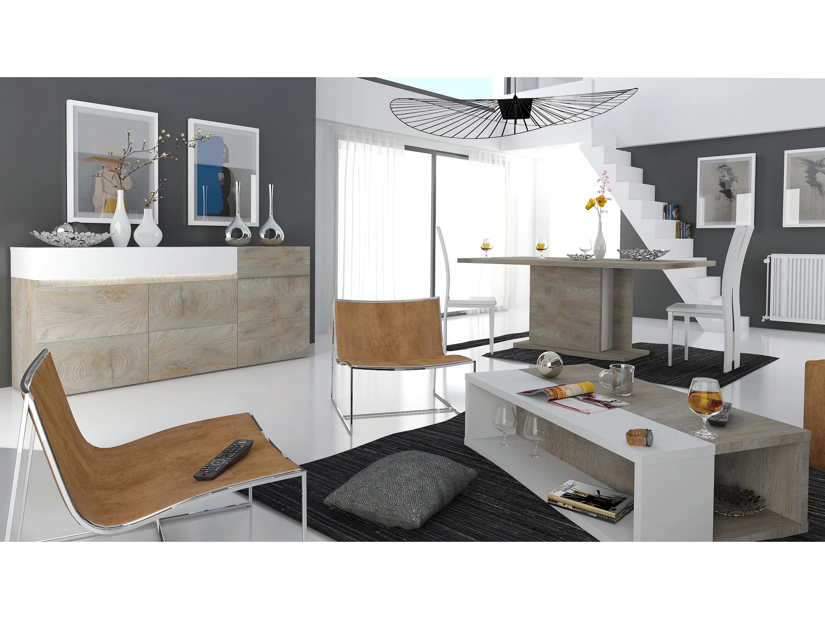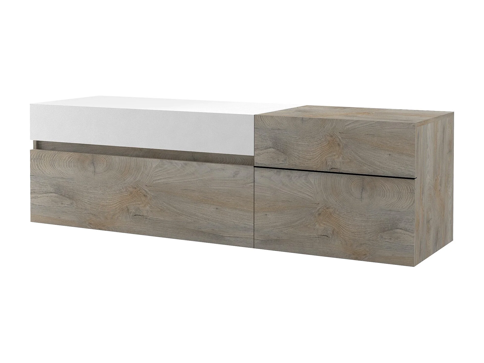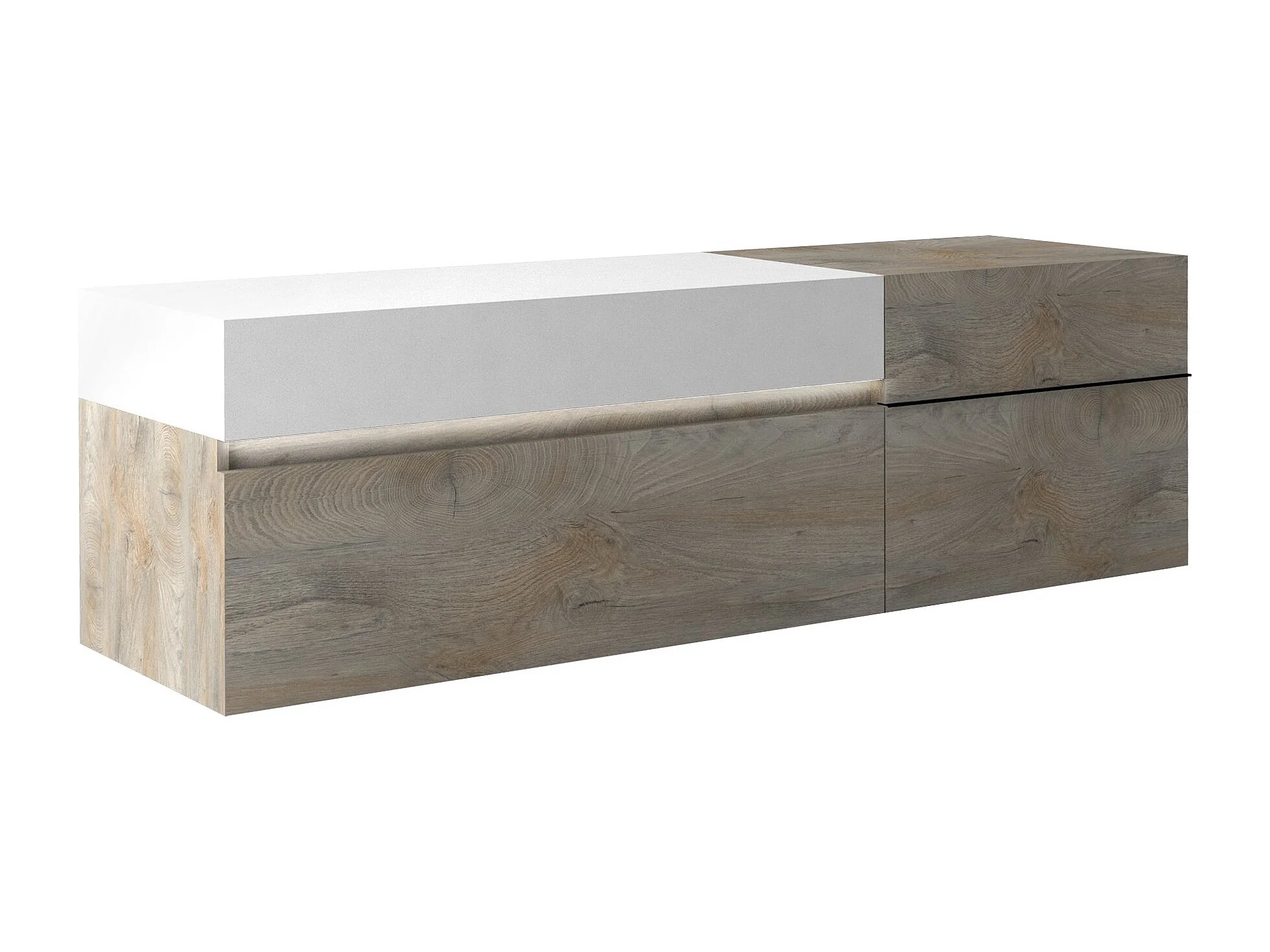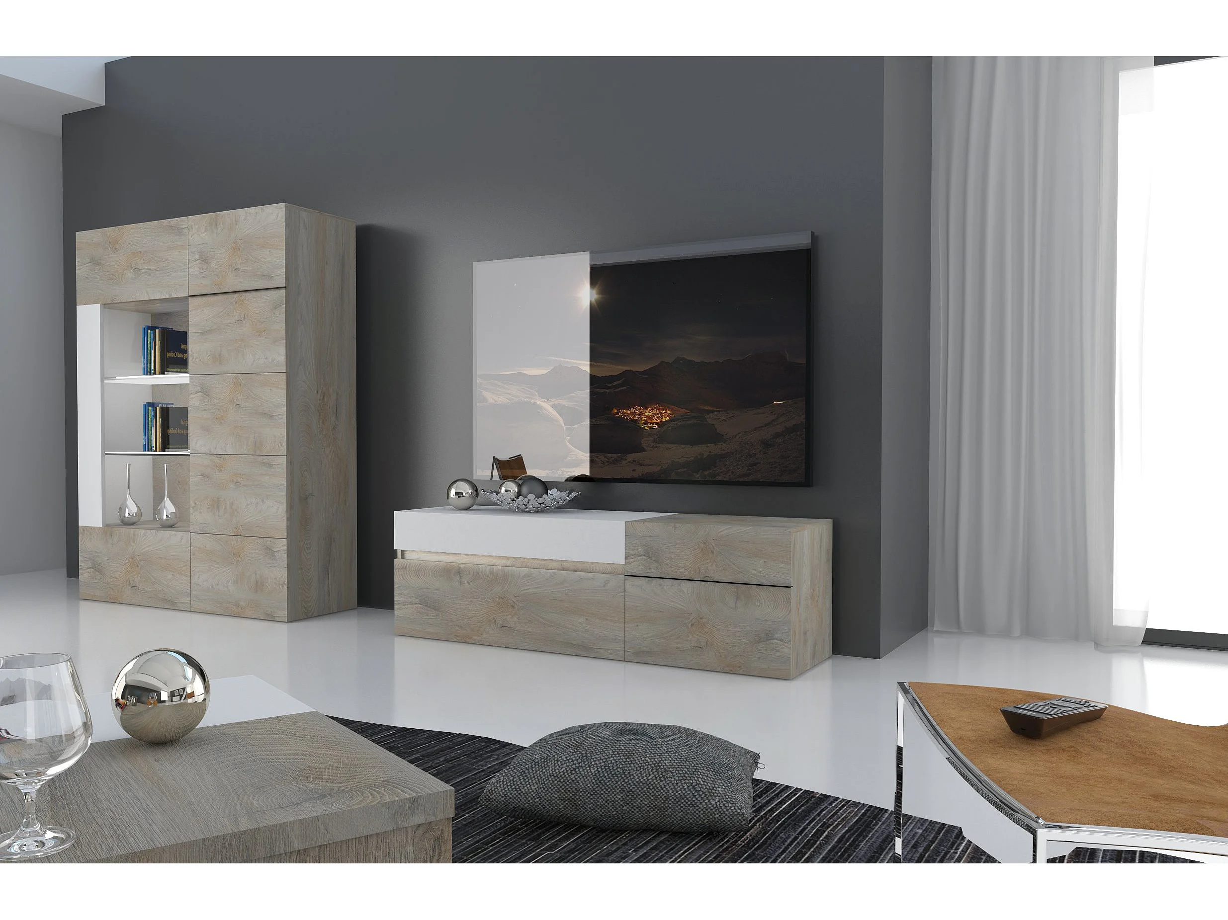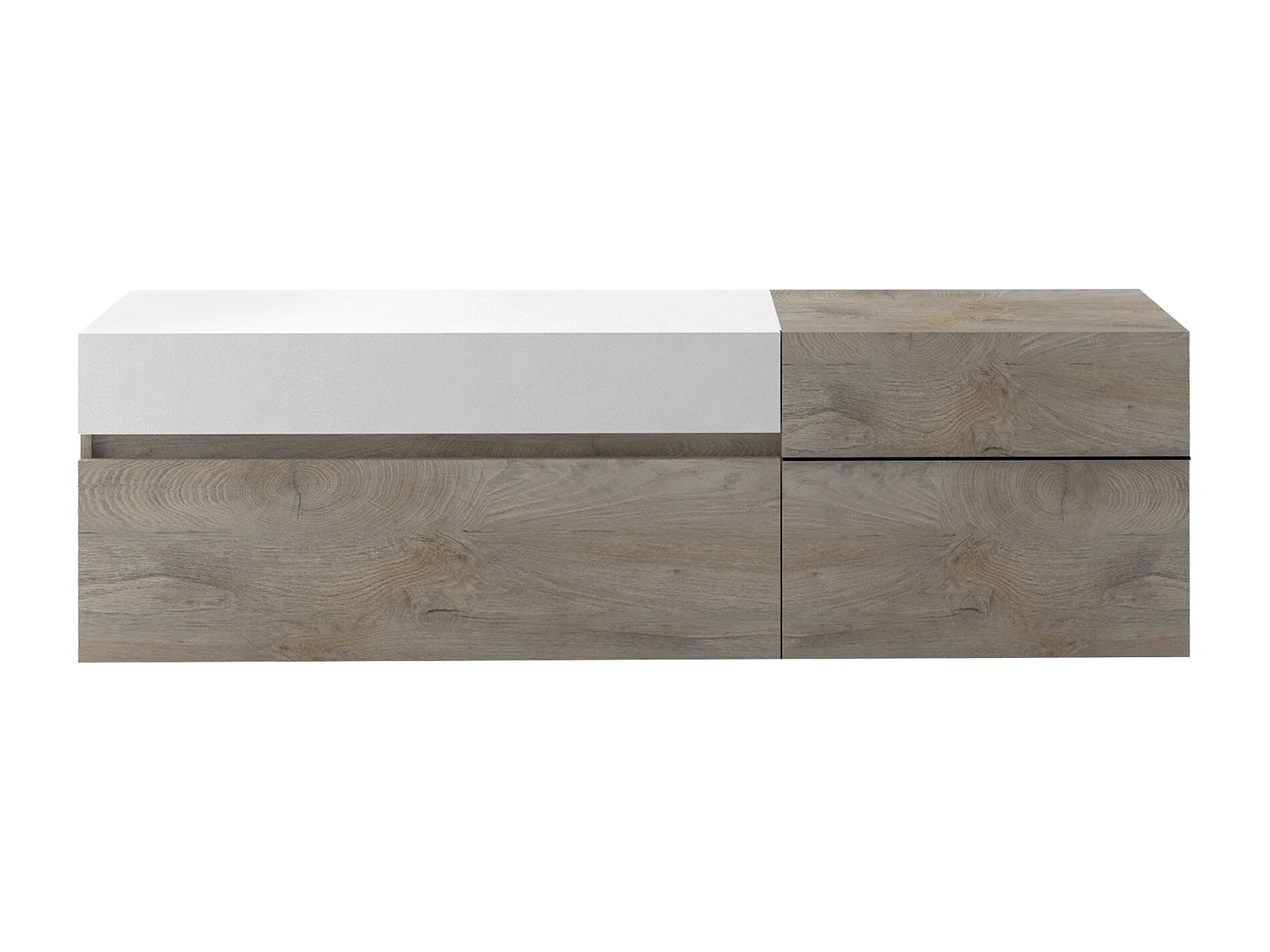 Meuble TV 2 porte 1 tiroir laqué blanc mat et bois chêne clair Baite