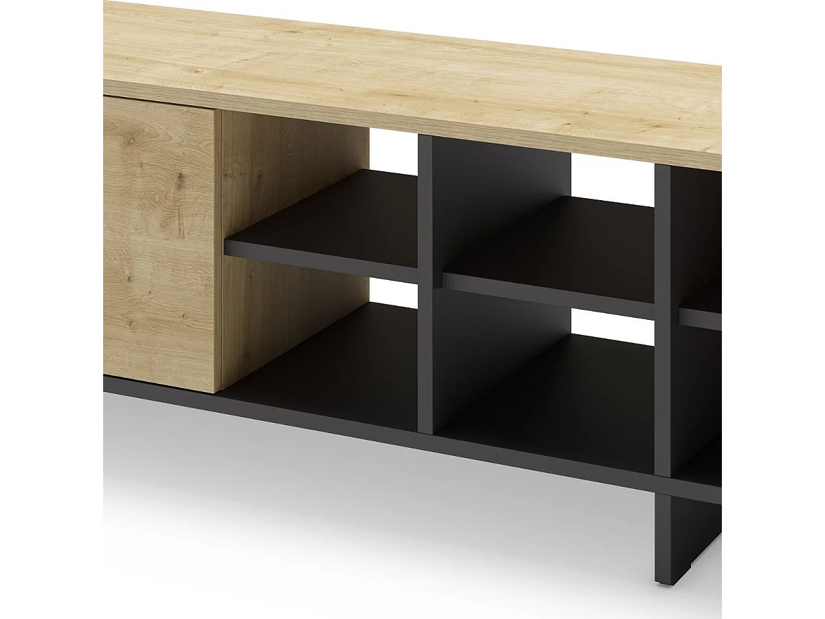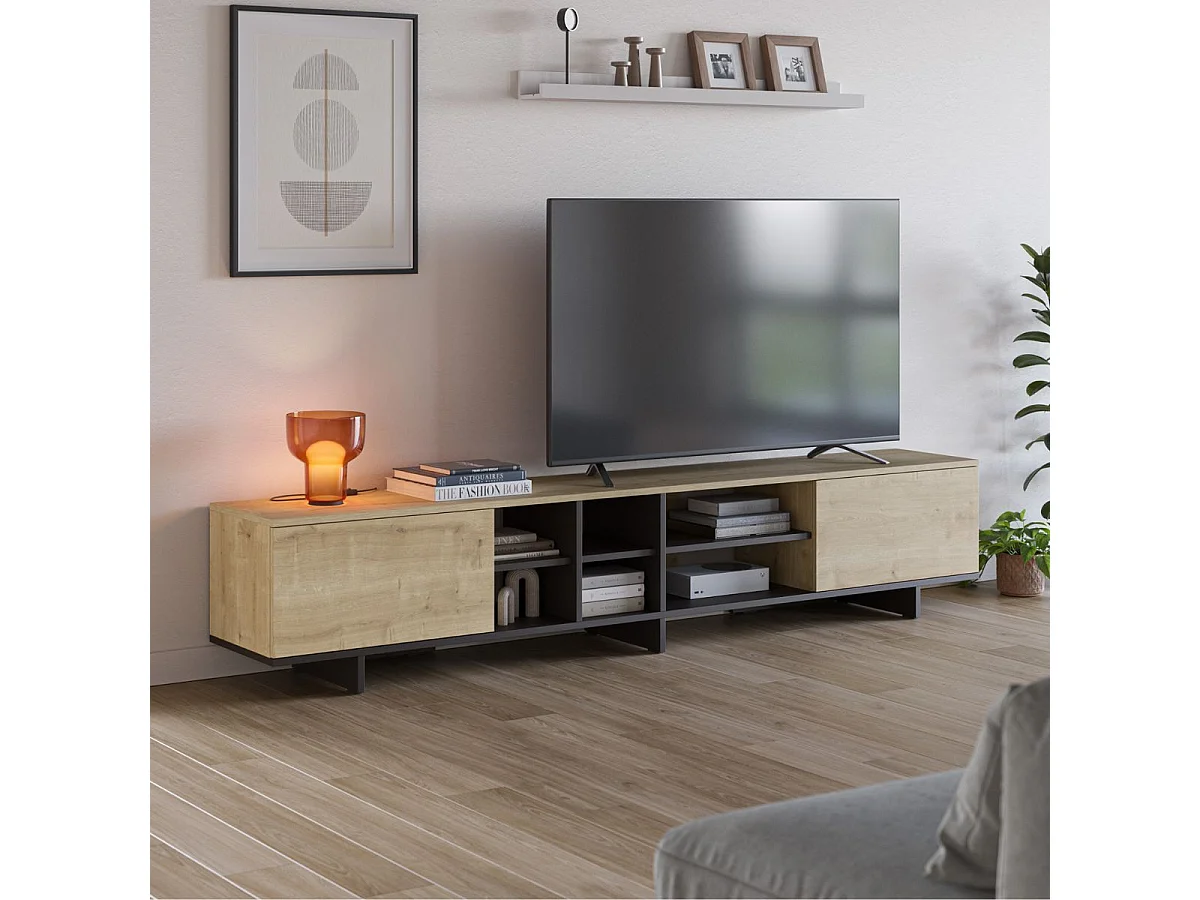 Meuble TV 2 portes 230cm en mélaminé imitation bois et noir - ESQUISSE