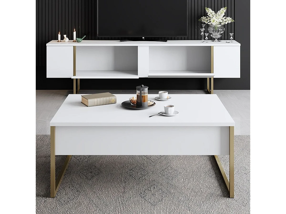 Meuble TV 2 portes blanc, piètement doré 180 cm - Celia