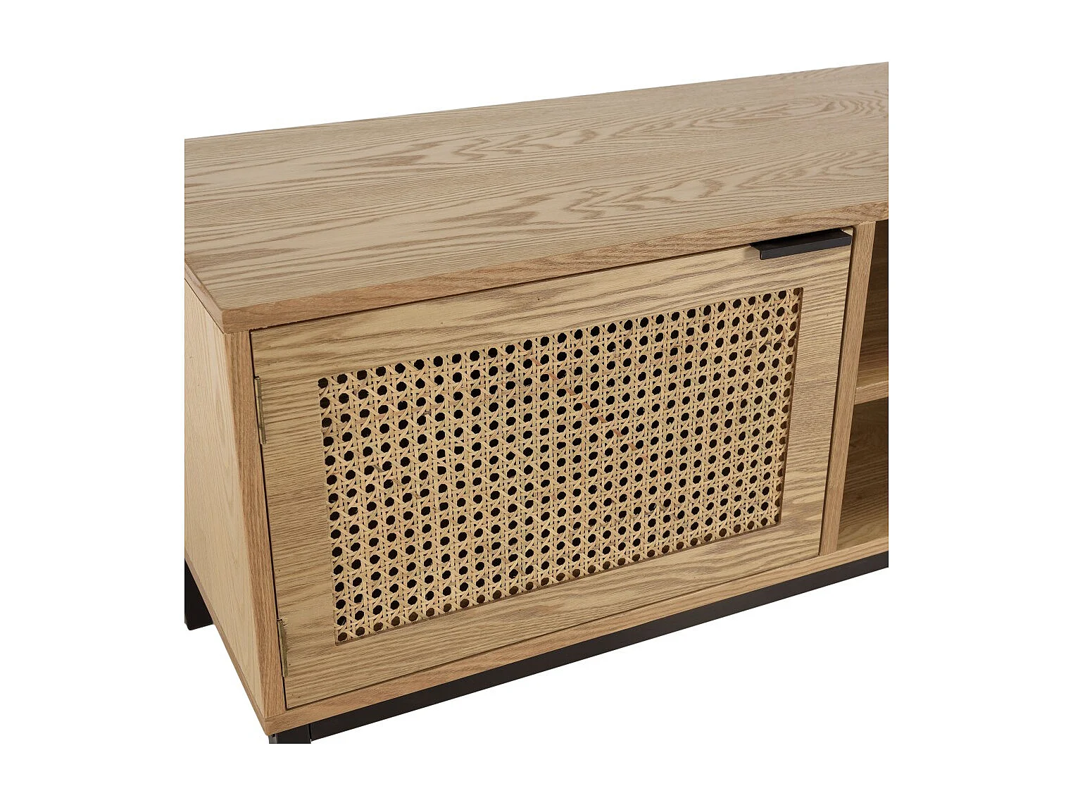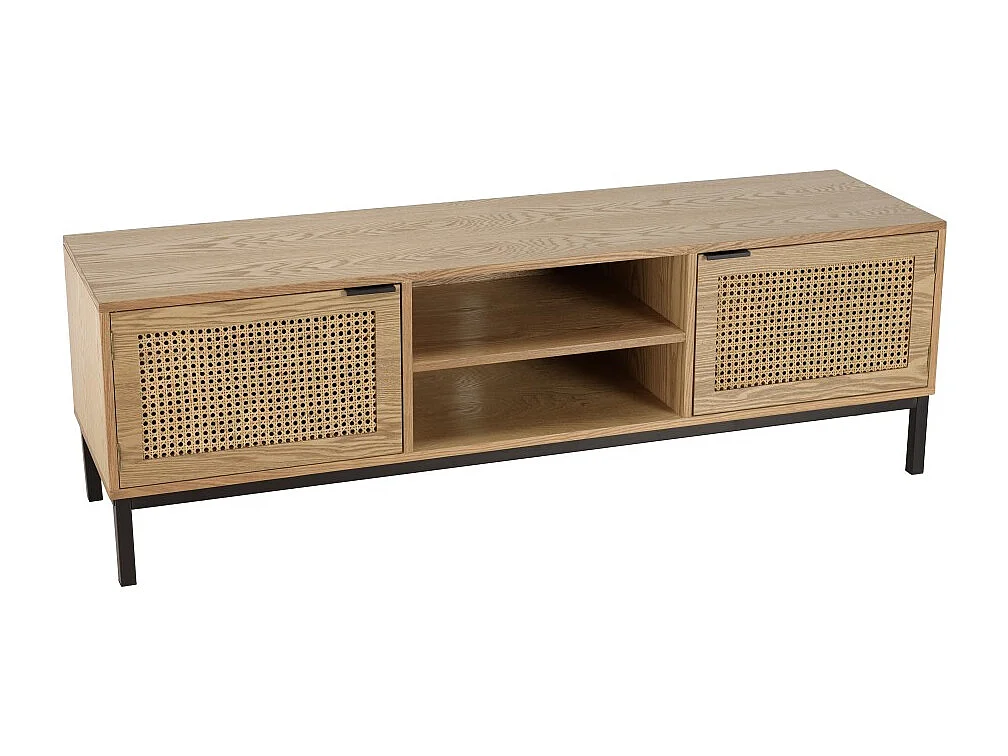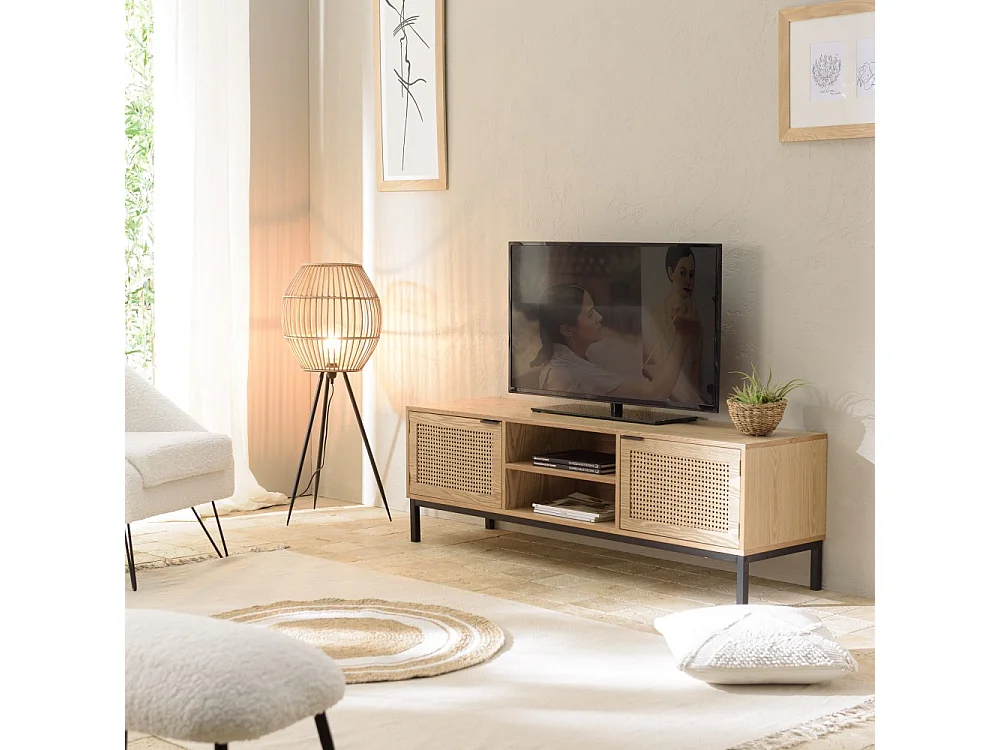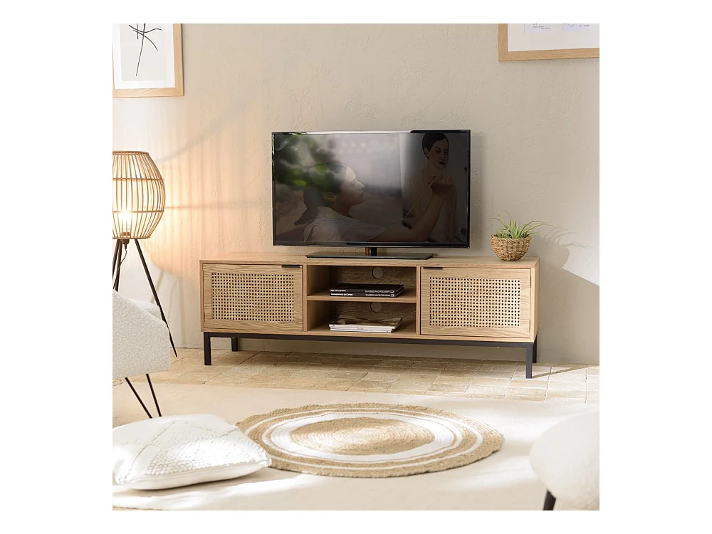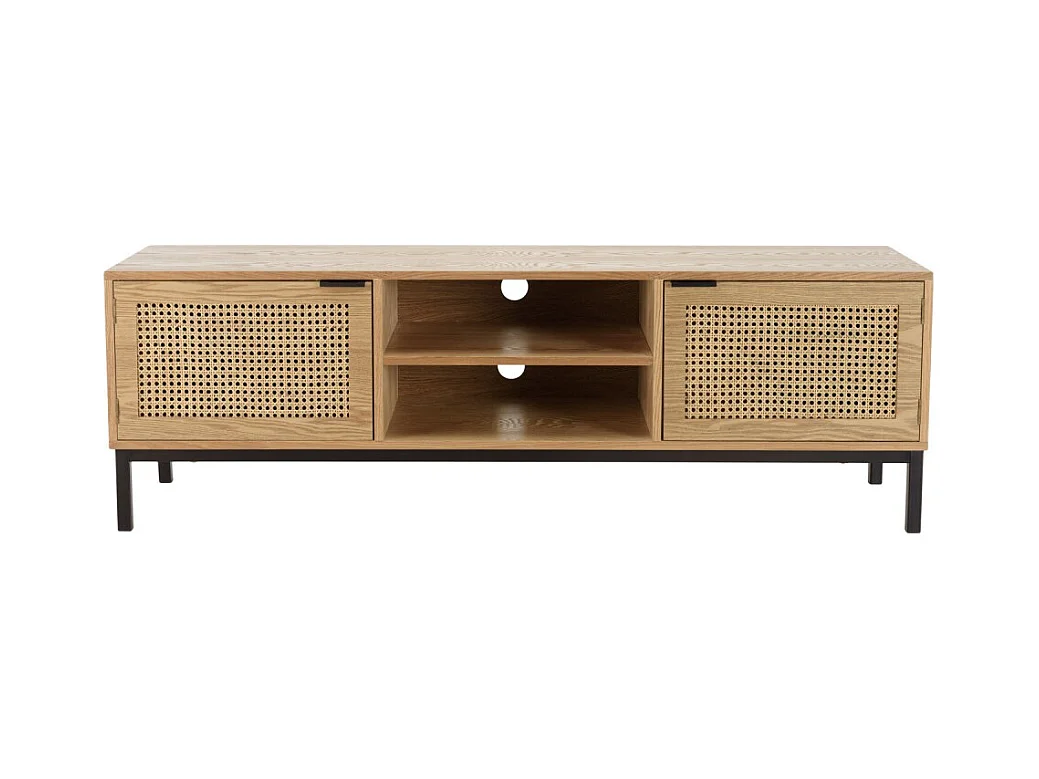 MARCEAU - Meuble TV en bois 2 portes cannage naturel pieds métal noir