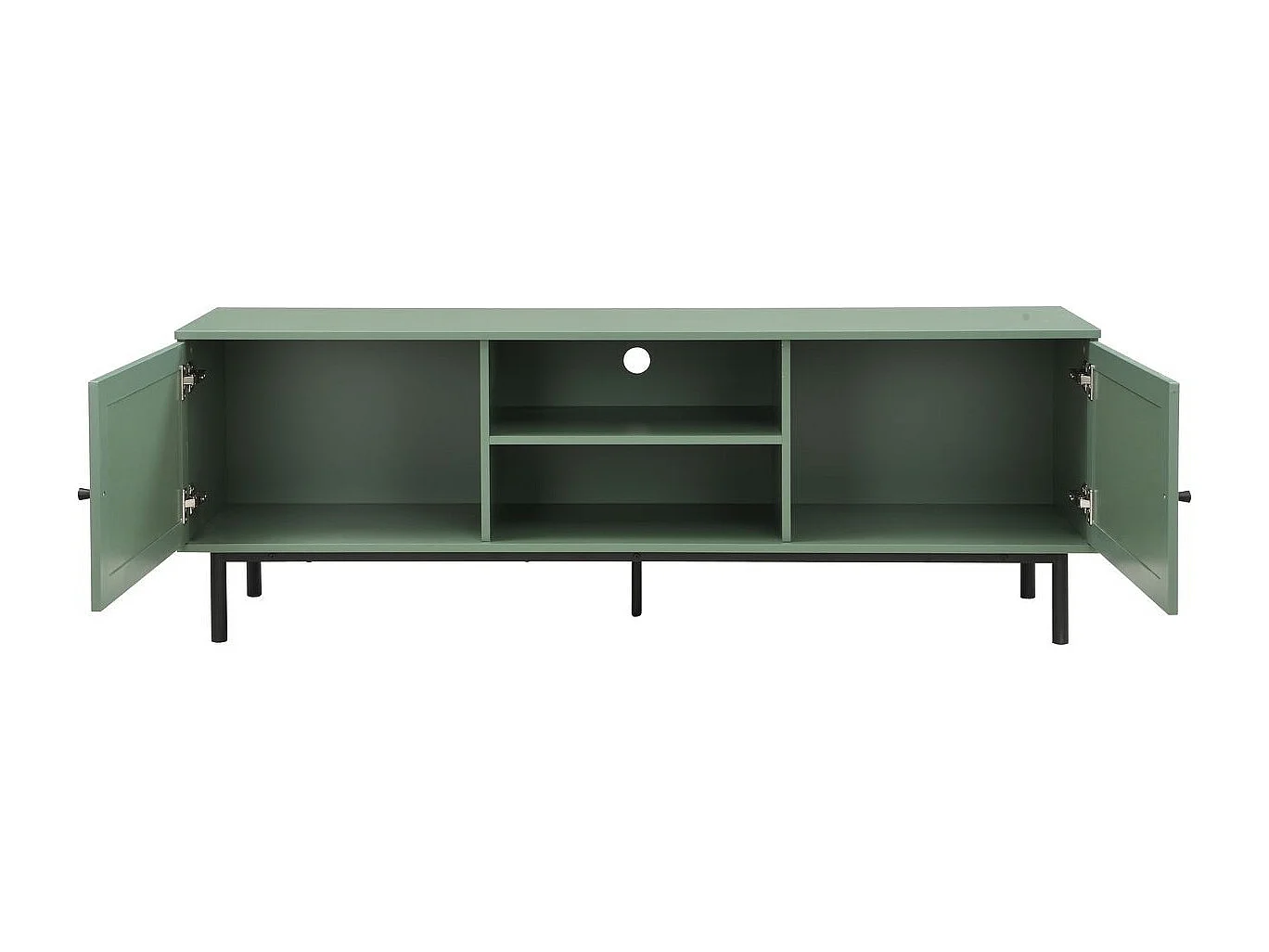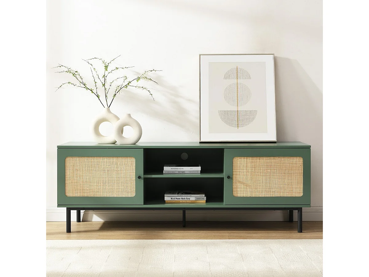 Meuble TV 2 portes vert et cannage 160 cm - Luma