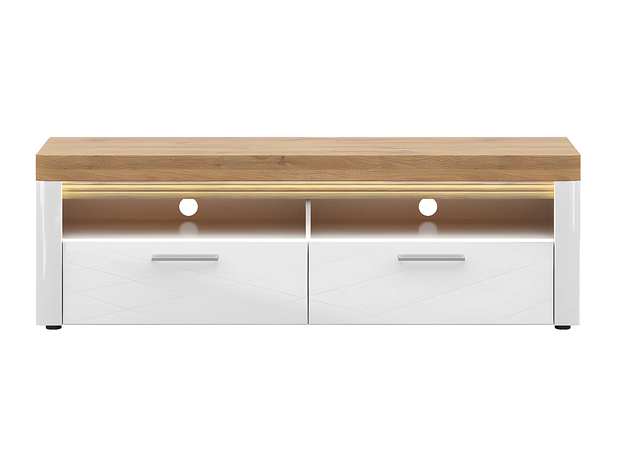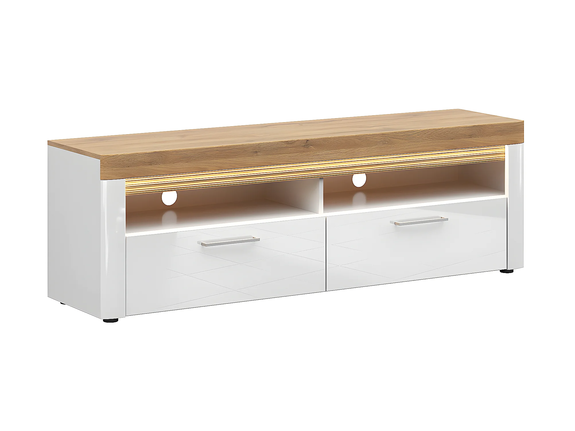 Meuble TV 2 tiroirs 2 niches 166 cm avec LED Nara Blanc et Bois