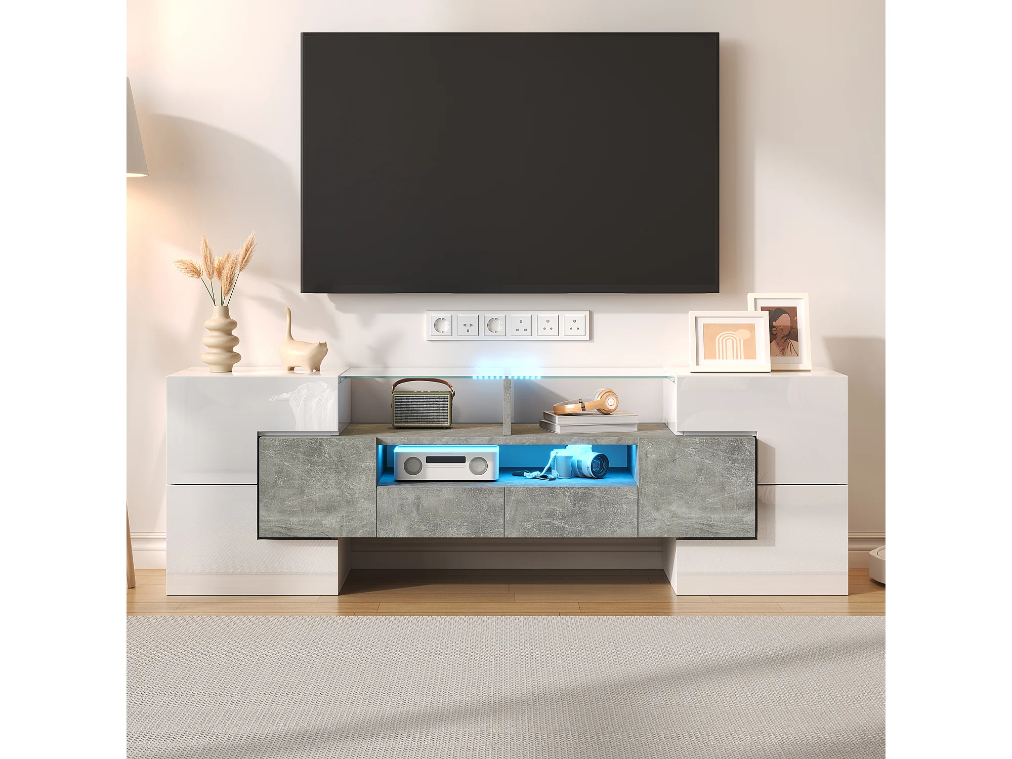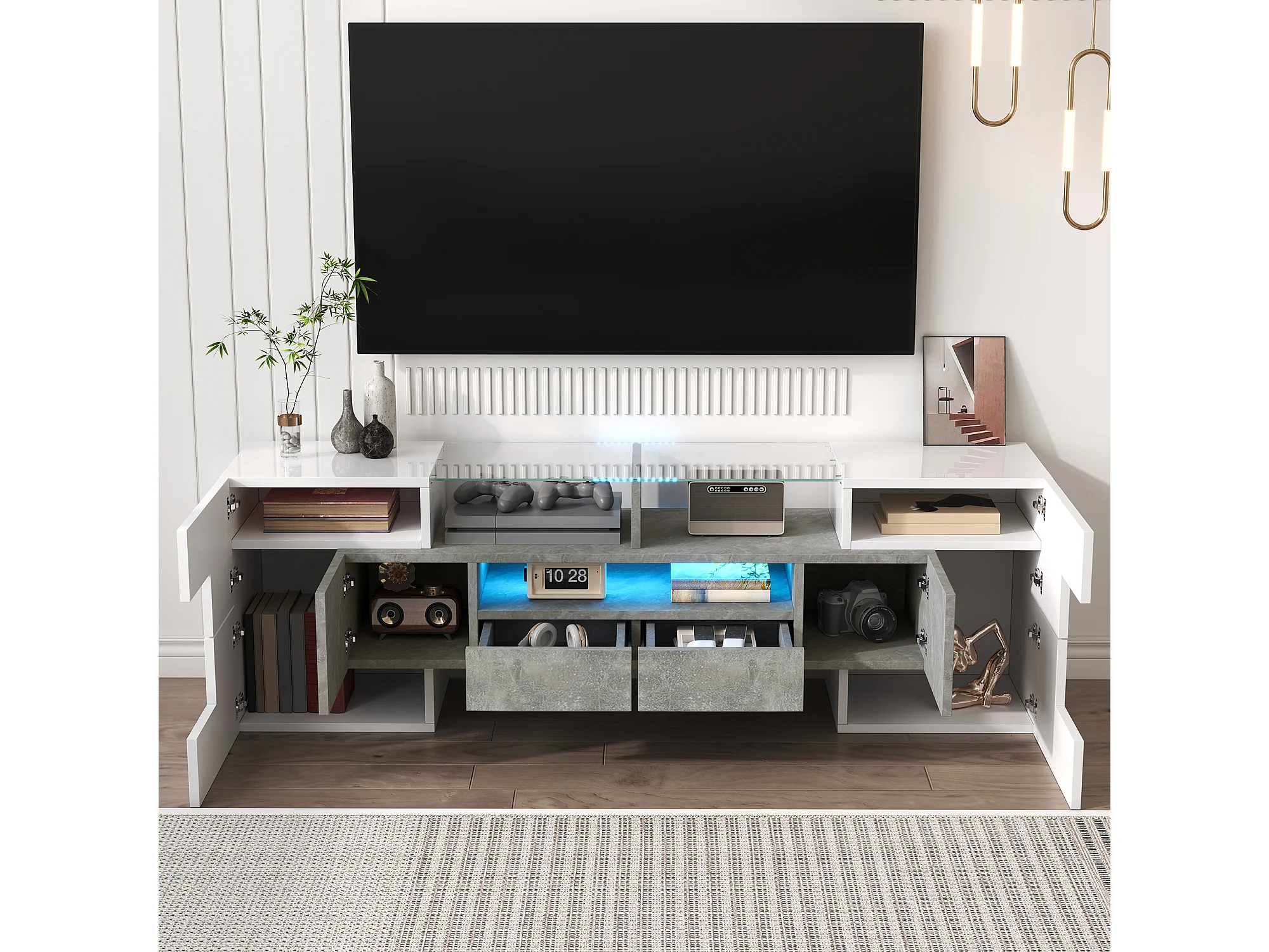 Meuble TV - 200x30x51 cm - Éclairage LED - 6 Portes 2 Tiroirs et 2 Etagères - Style moderne - Meuble de salon - Blanc