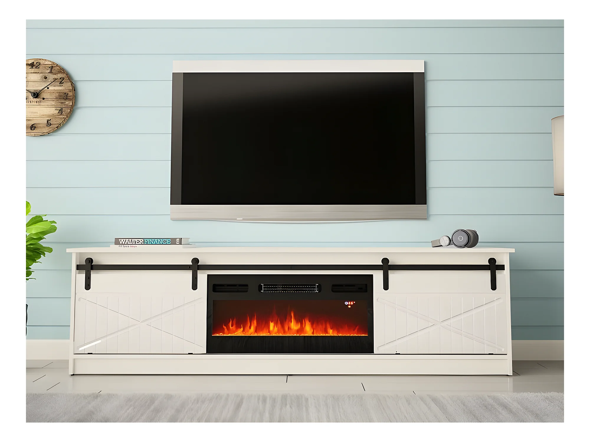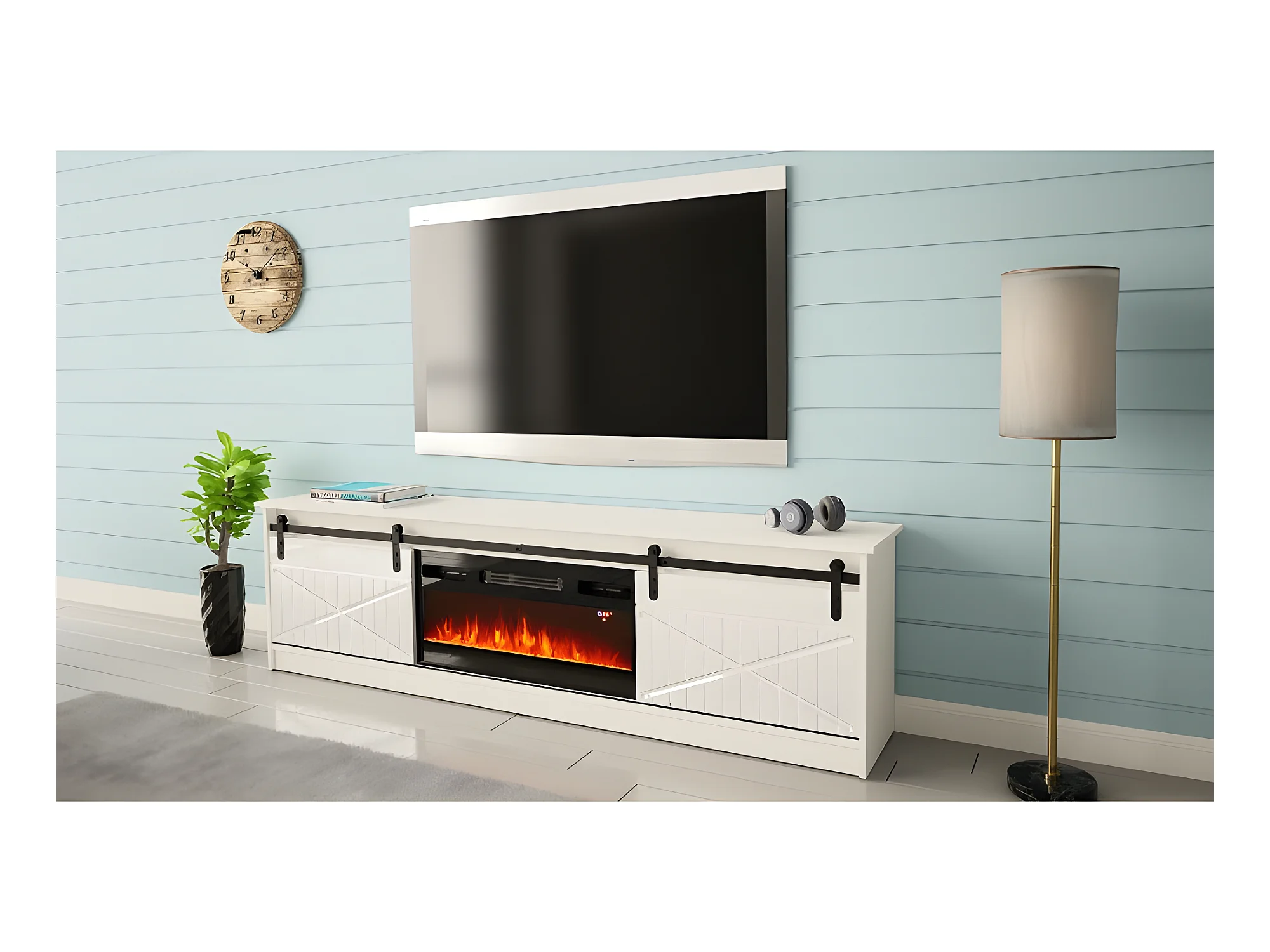 Meuble TV 200x57x35 cm blanc brillant Avec Cheminée chauffante intégrée GRANGE meuble Hi-fi à poser