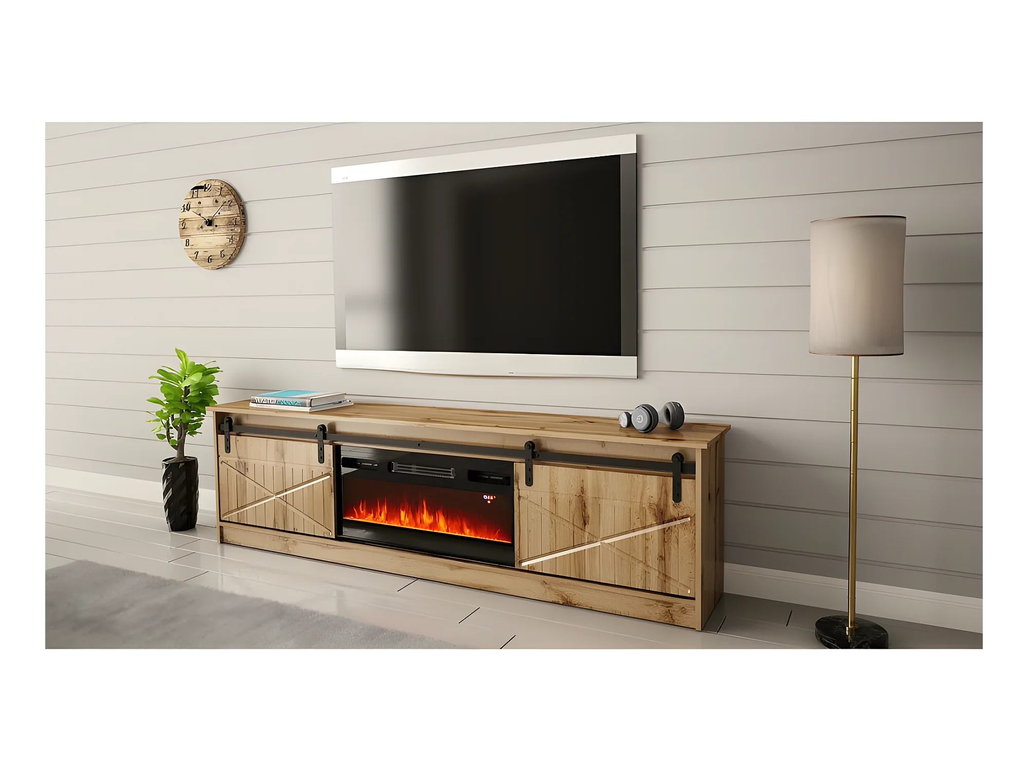 Meuble TV 200x57x35 cm couleur chêne Wotan GRANGE Avec Cheminée chauffante intégrée meuble Hi-fi à poser