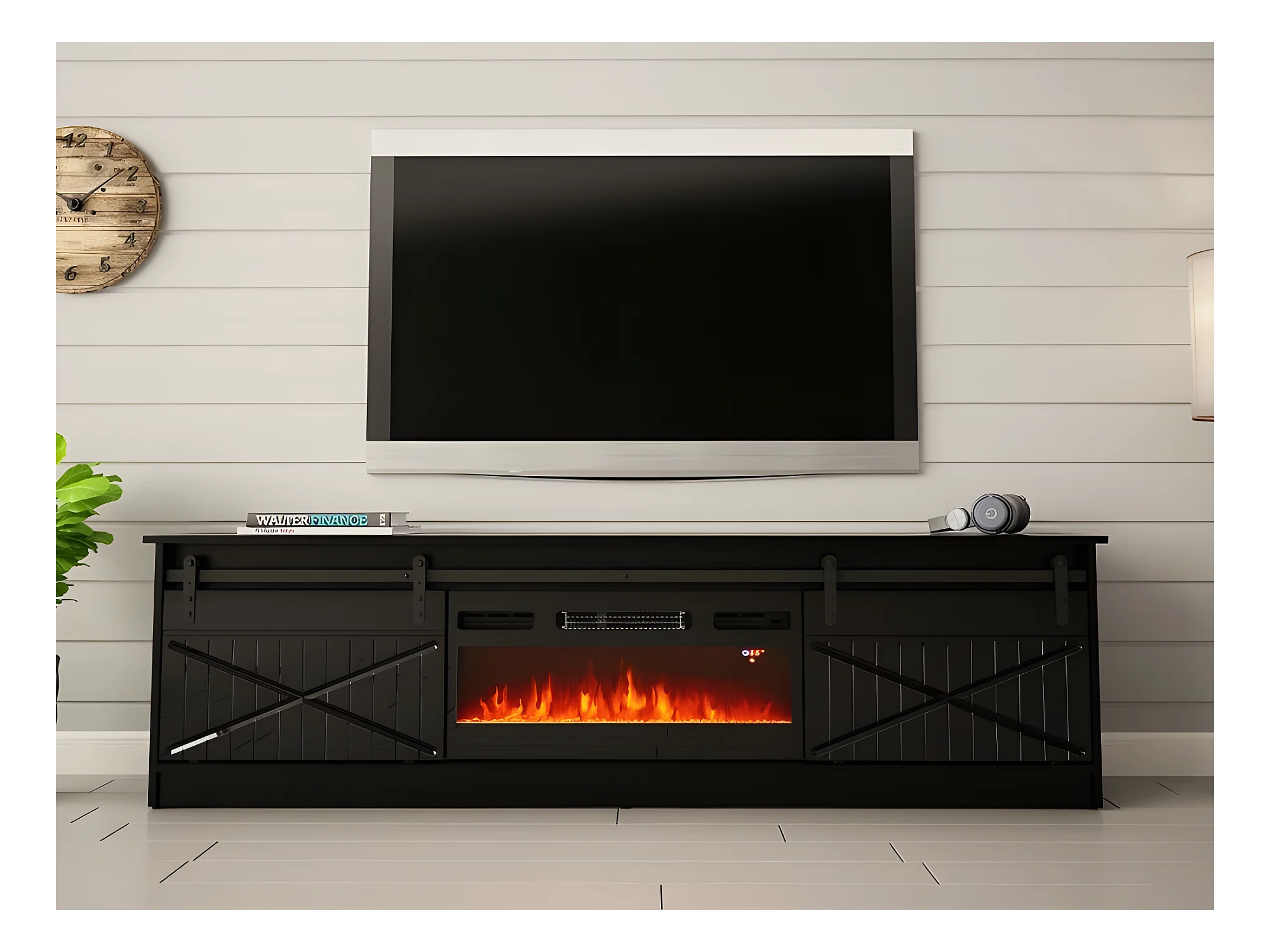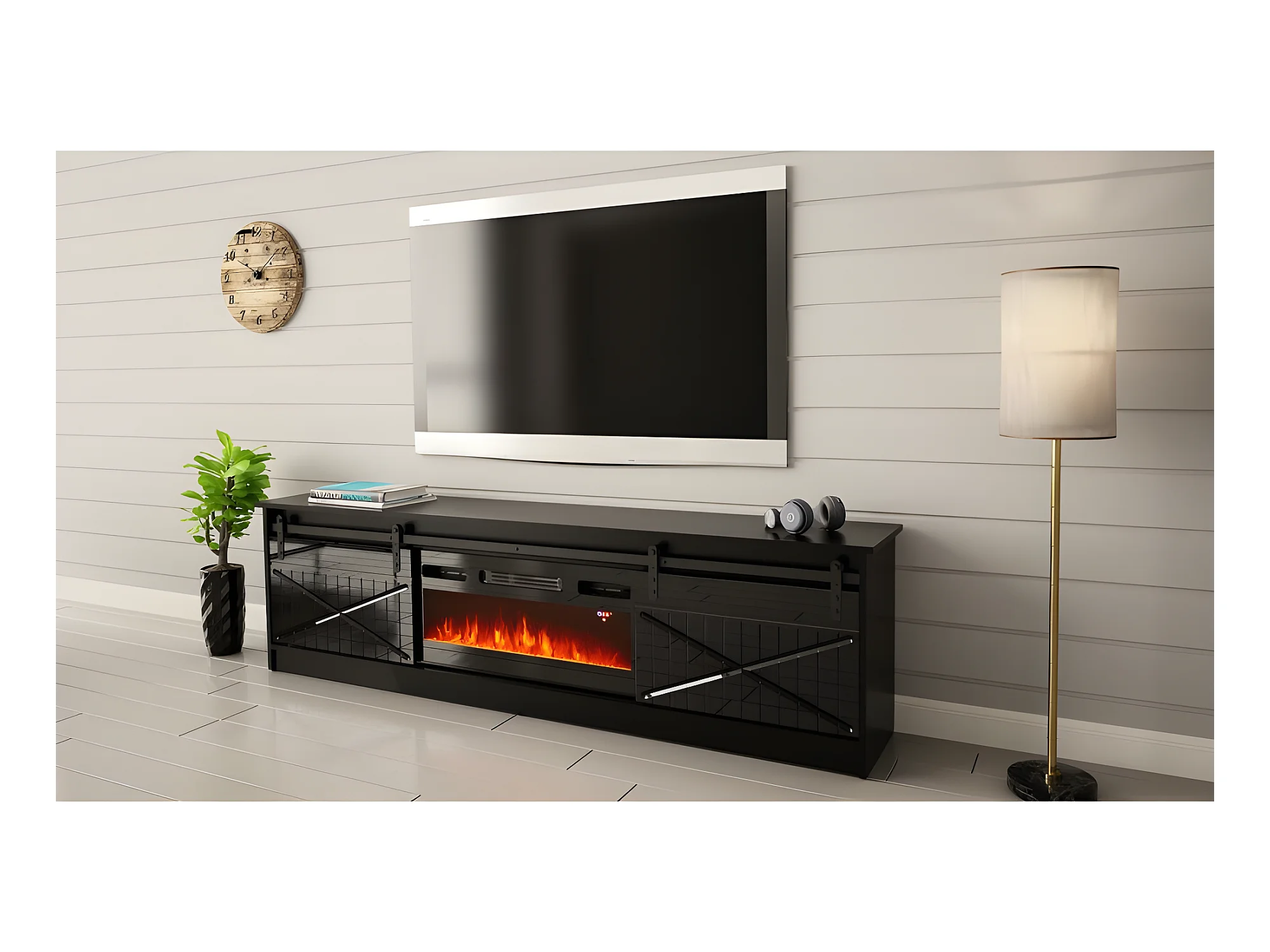 Meuble TV 200x57x35 cm Noir brillant GRANGE Avec Cheminée chauffante intégrée meuble Hi-fi à poser