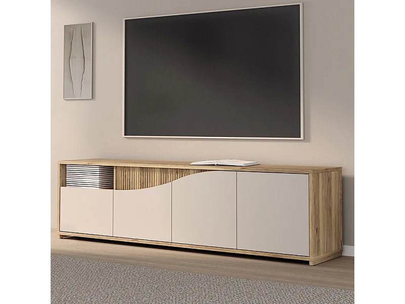 Meuble TV 204 cm décor tasseaux bois et sable avec vagues - RIVAGE