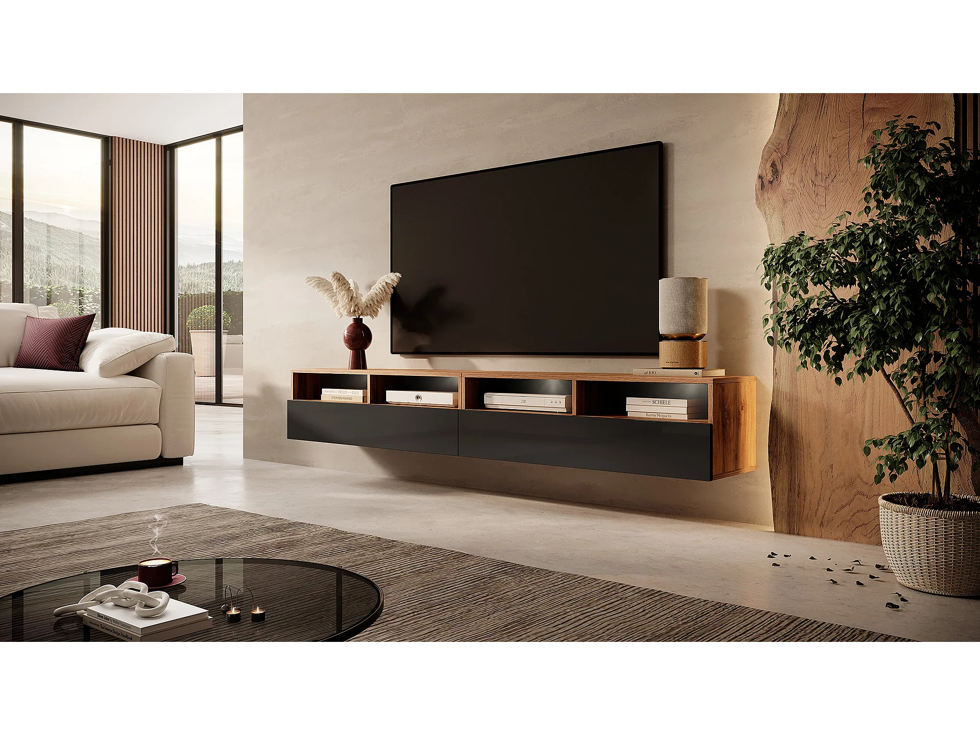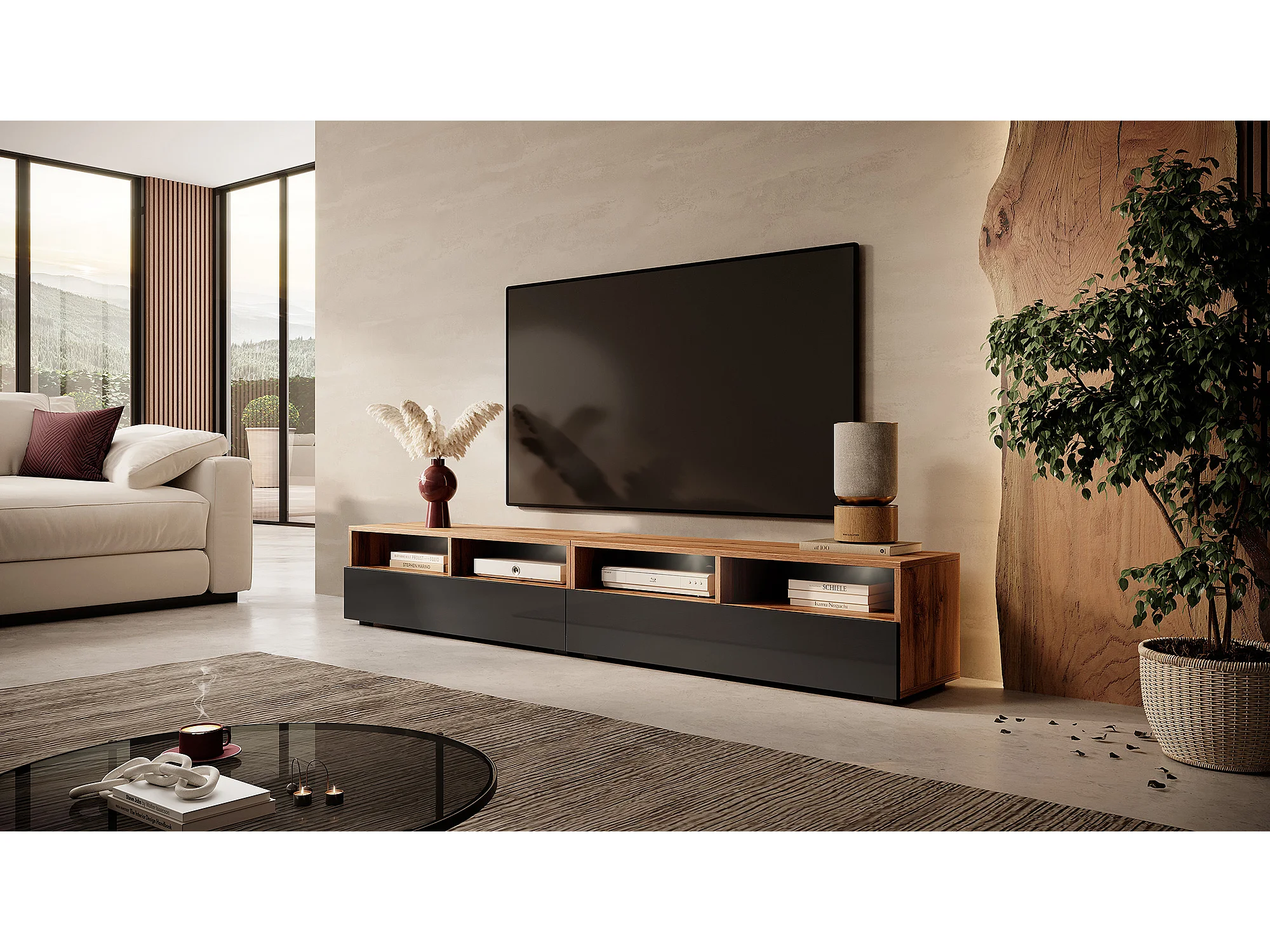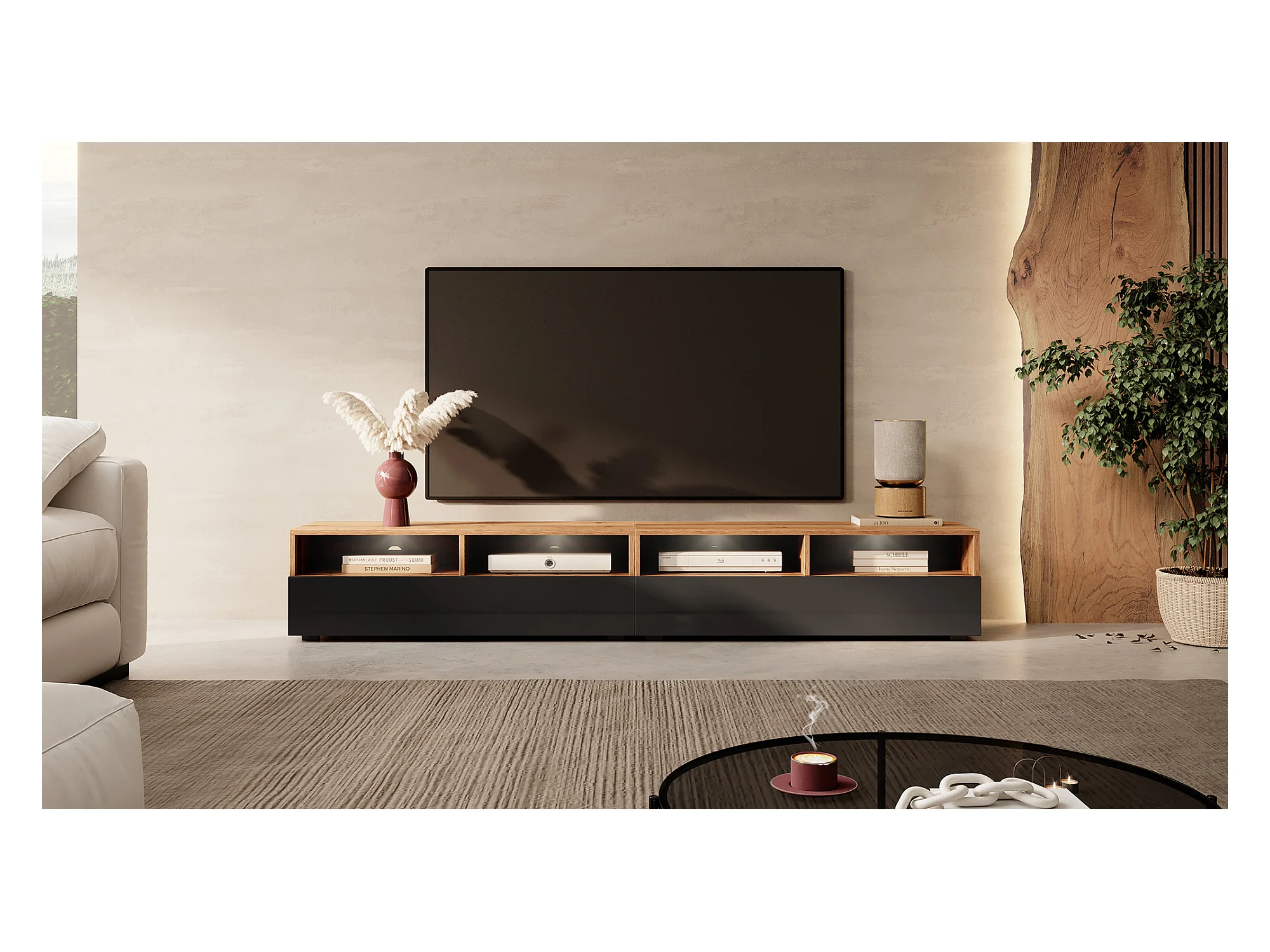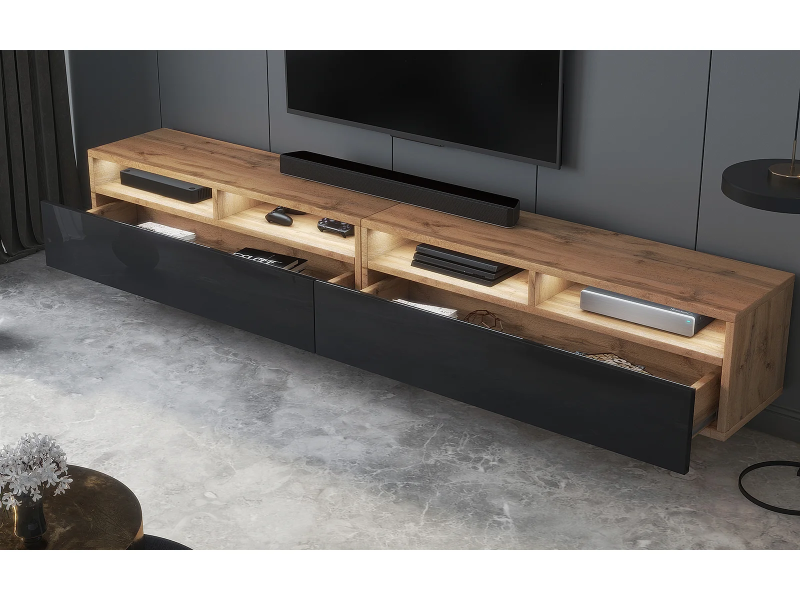Meuble TV - 2x100 cm - chêne wotan / noir brillant - avec LED - REDNAW