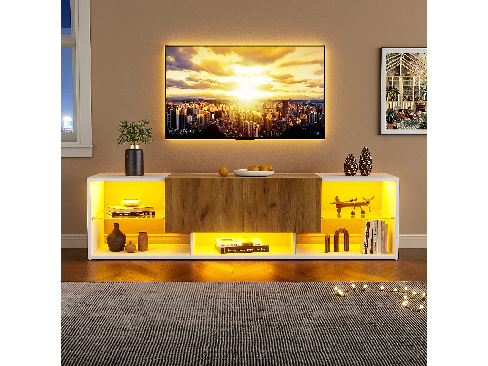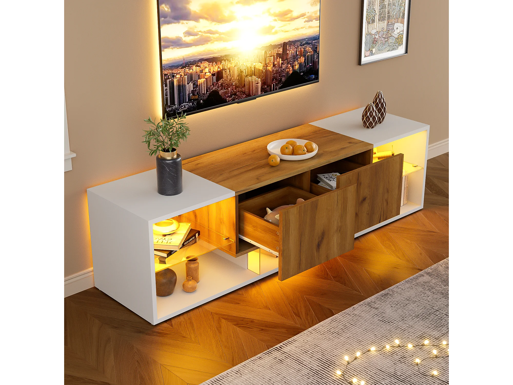 Meuble TV 3 niveaux avec étagères en verre, pour téléviseurs jusqu'à 70 pouces, avec 2 tiroirs, MDF + verre, blanc (160x40x42cm)