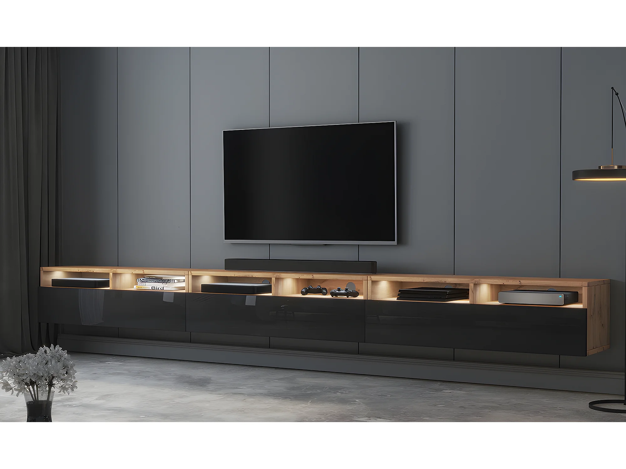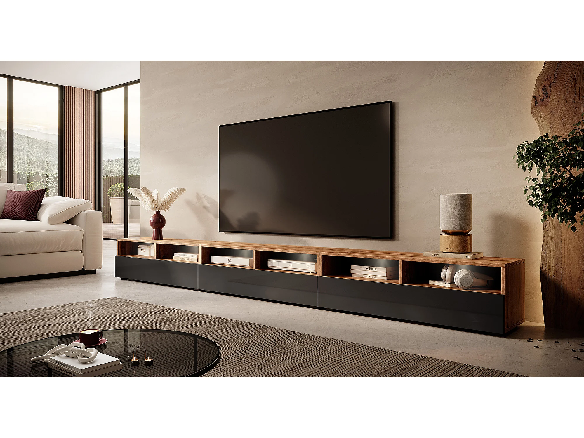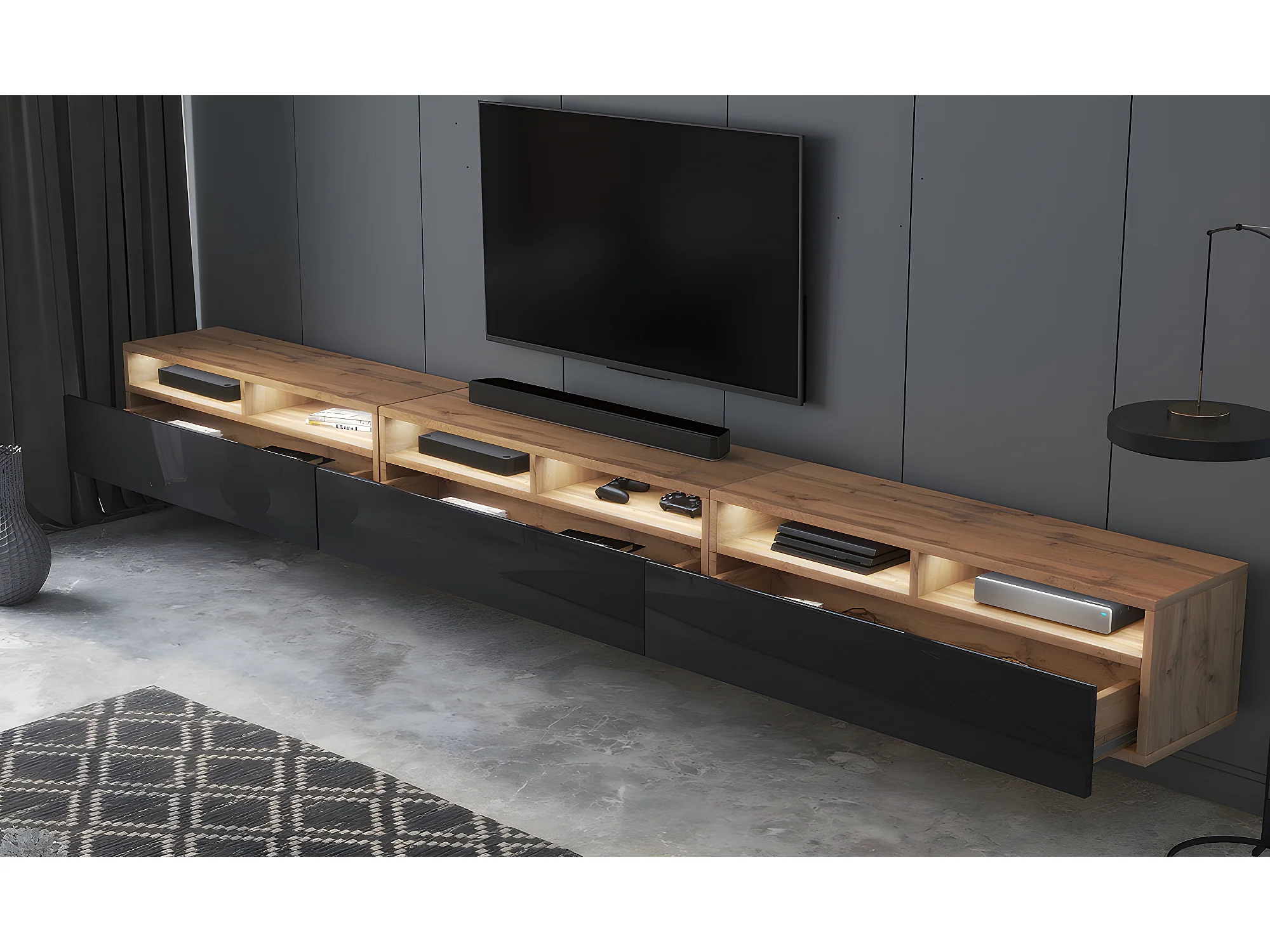 Meuble TV - 3x100 cm - chêne wotan / noir brillant - avec LED - REDNAW