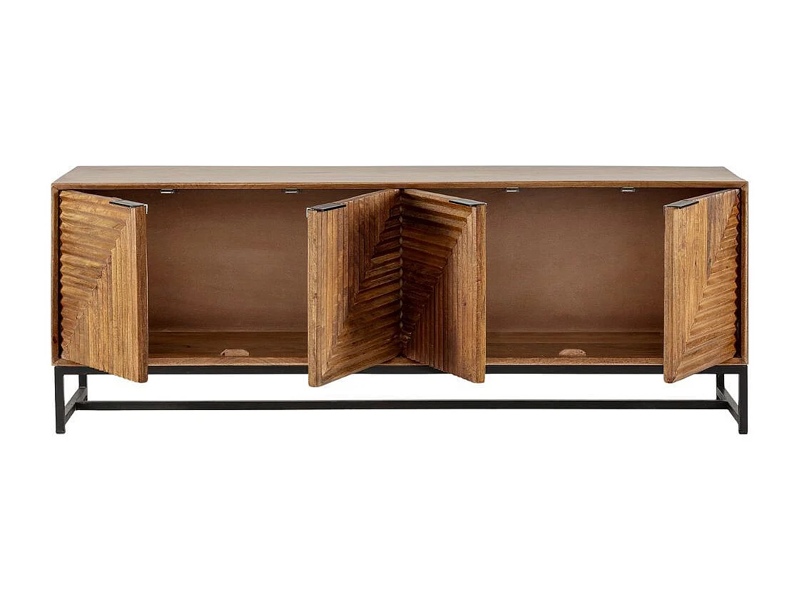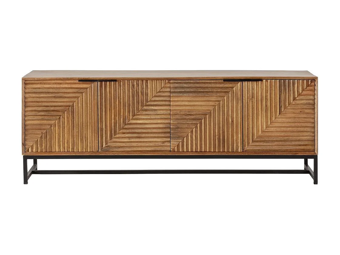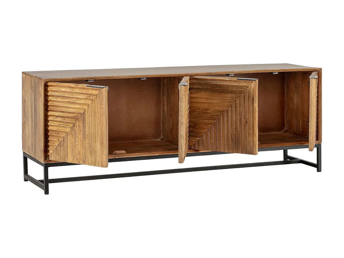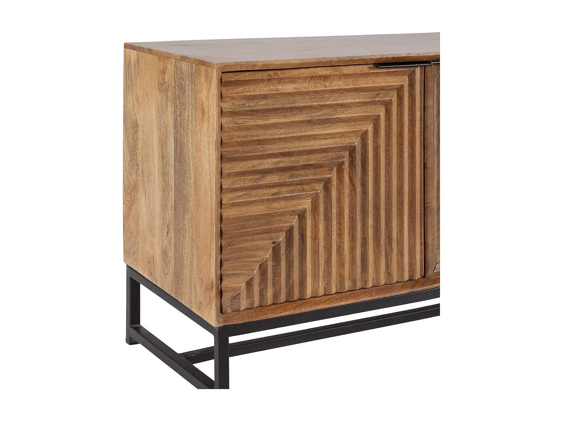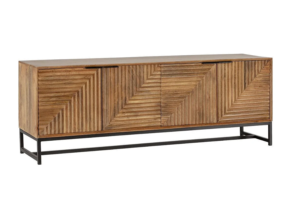 Meuble TV 4 portes en manguier massif relief graphique oblique piètement métal laqué noir - NERIA