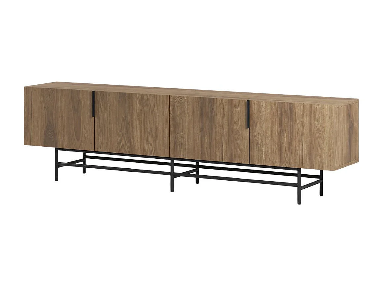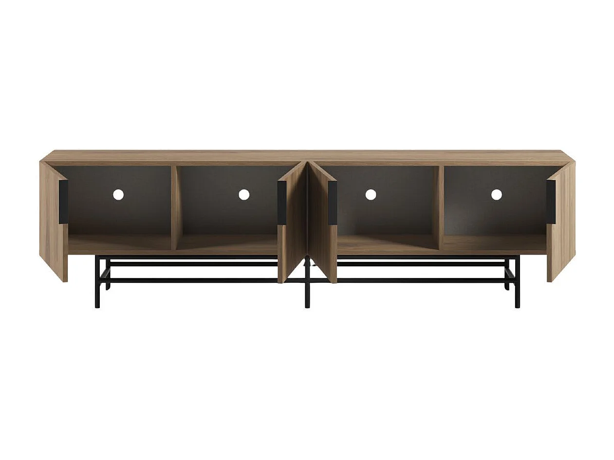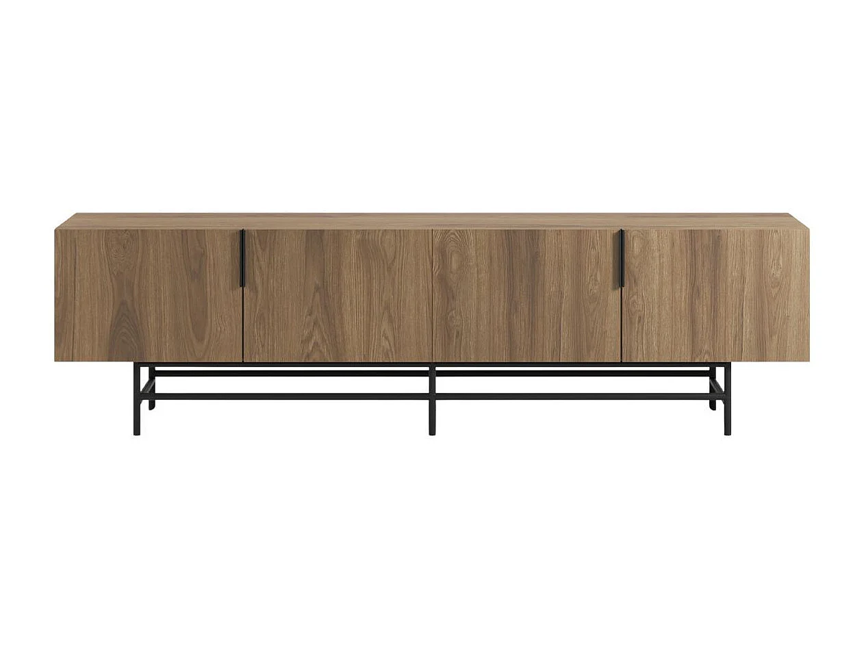 Meuble TV 4 portes en mélaminé imitation bois et piètement et poignées en métal laqué noir - ALDINE