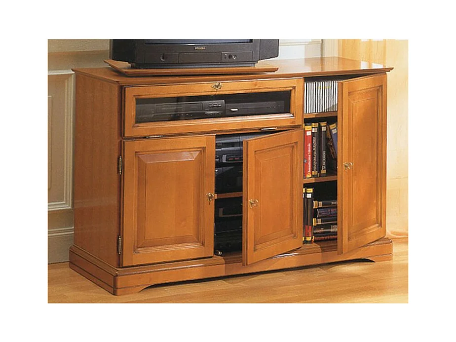 Meuble TV 55 Pouces Merisier 3 Portes 1 Abattant Vitré L 120.5 H 77 P 46.5 cm