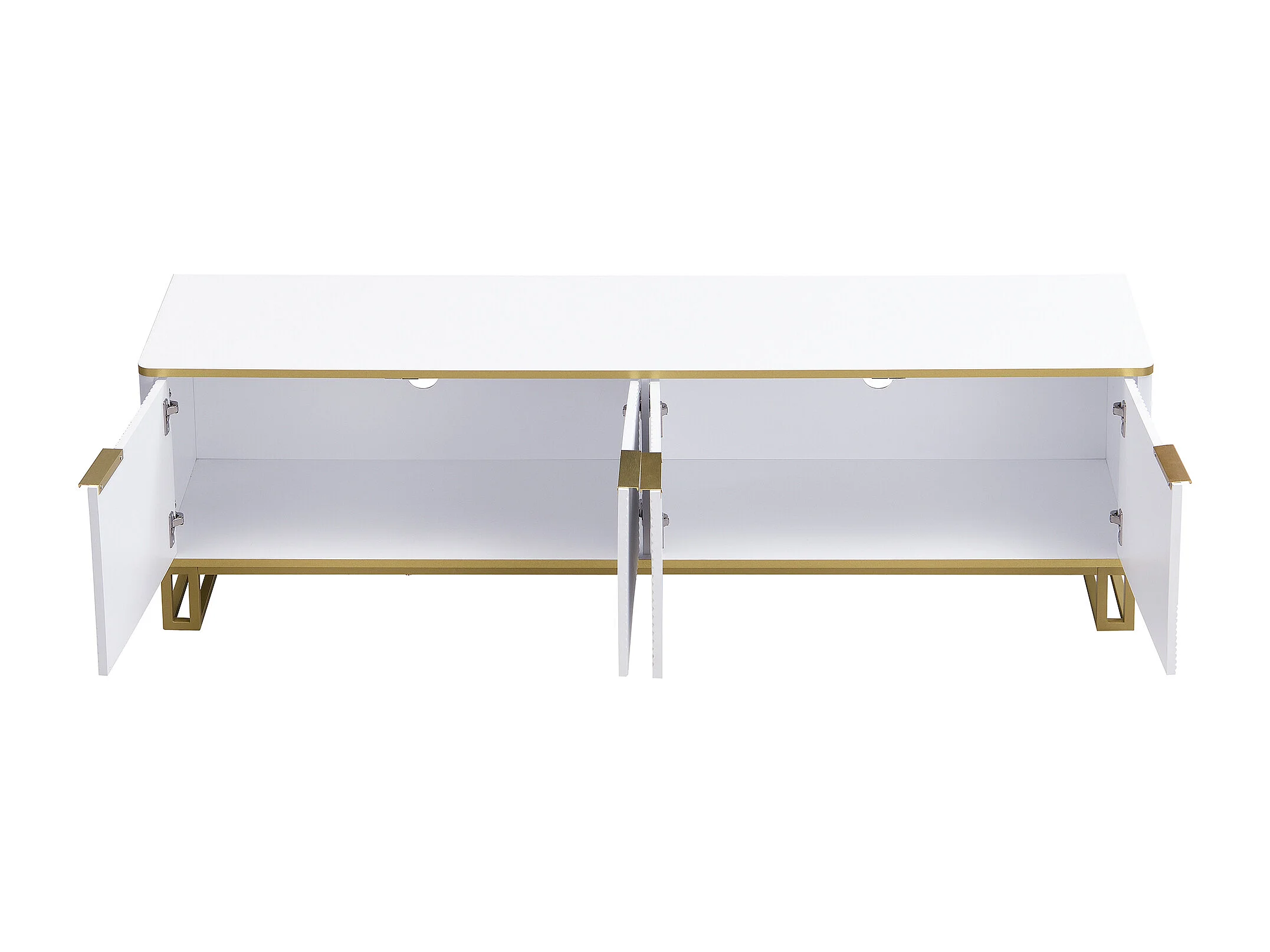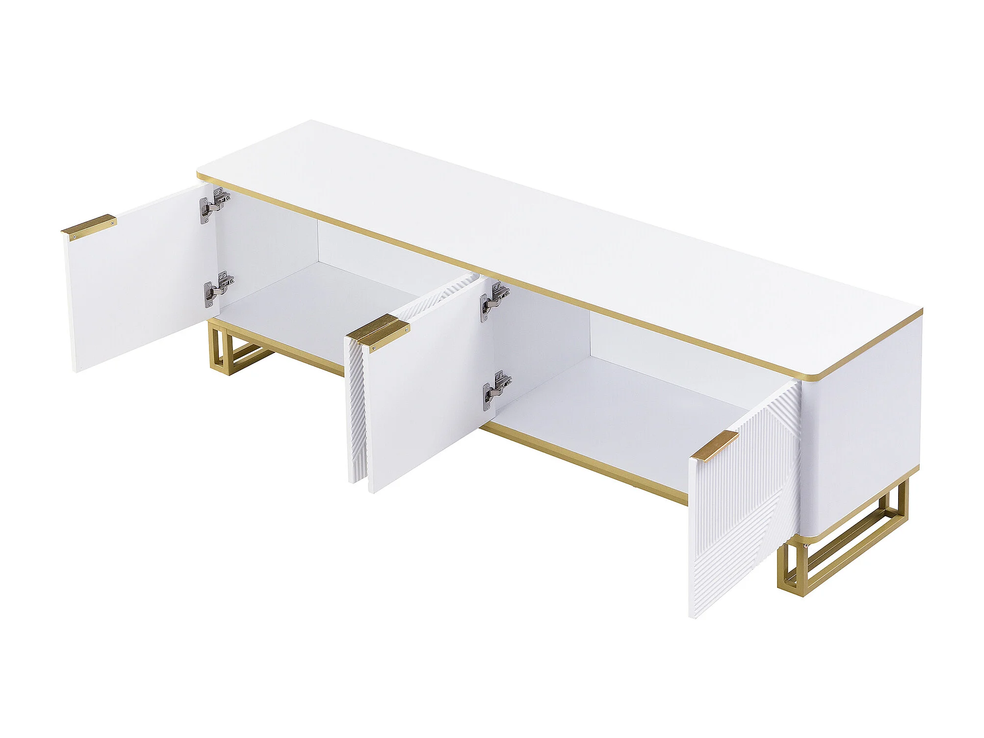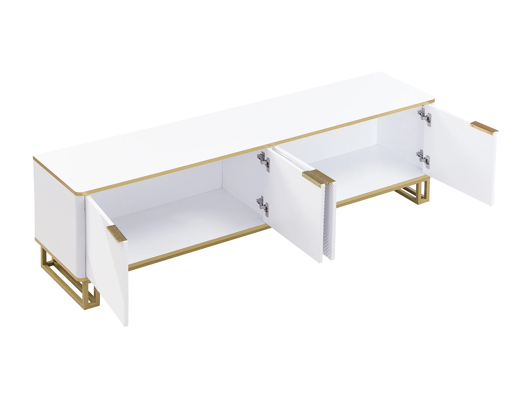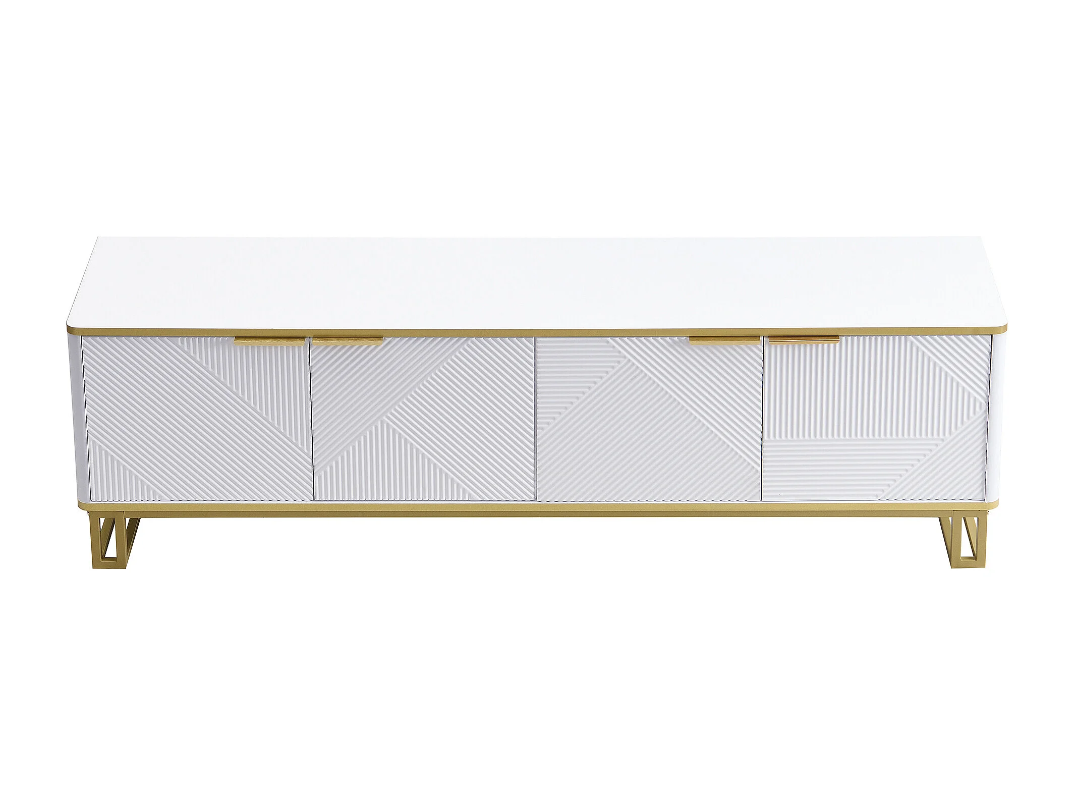 Meuble TV à 4 portes avec texture géométrique - Bois MDF et métal - Blanc et doré